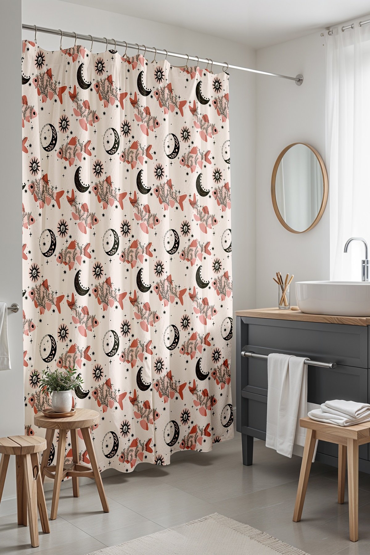Bohem Ay ve Balık Desenli Duş Perdesi Küvet Perdesi 175x200cm
