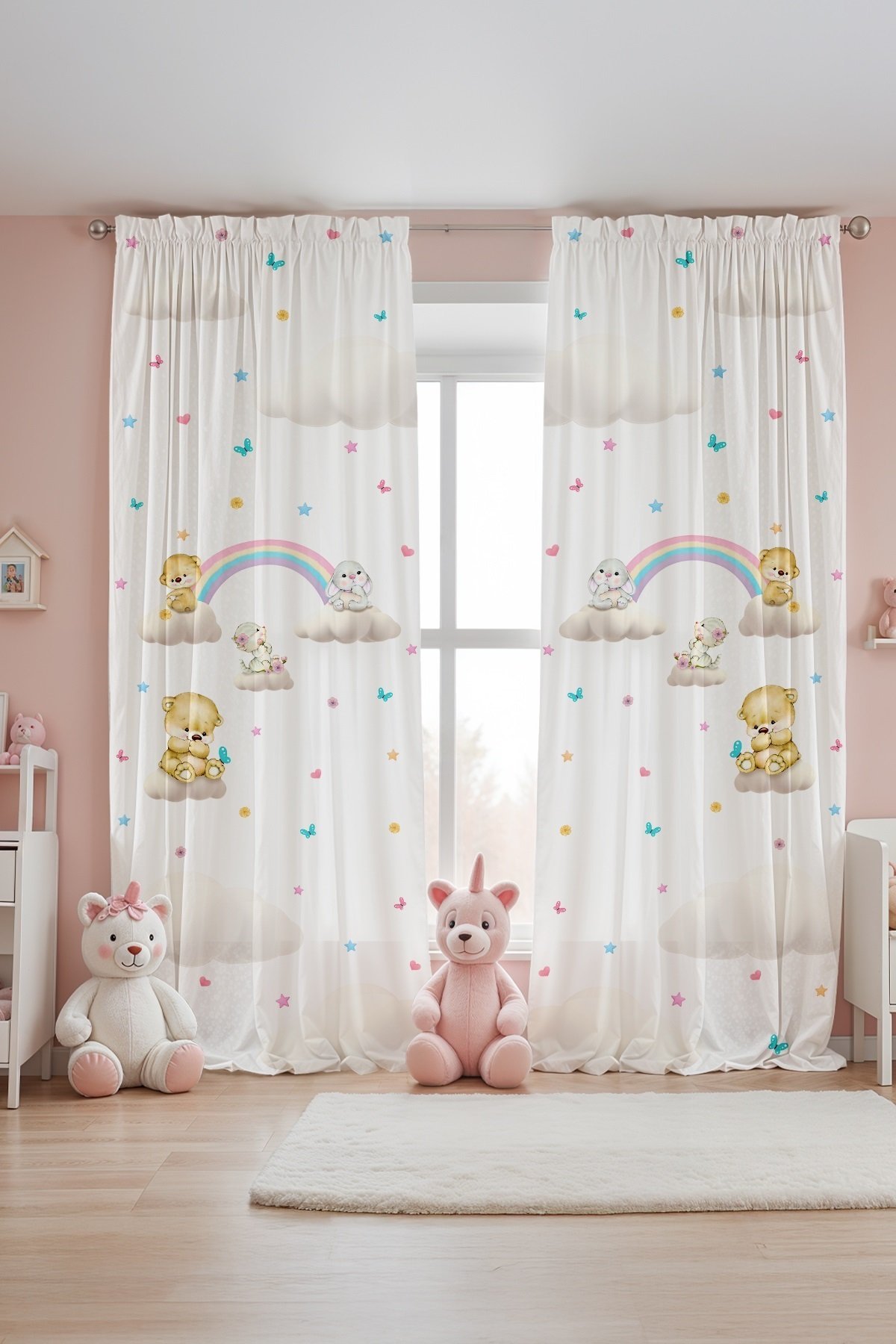 Bulut ve Gökkuşağı Dostları Desenli Çocuk Bebek Odası Fon Perde (Tek Kanat Fiyatlandırma)