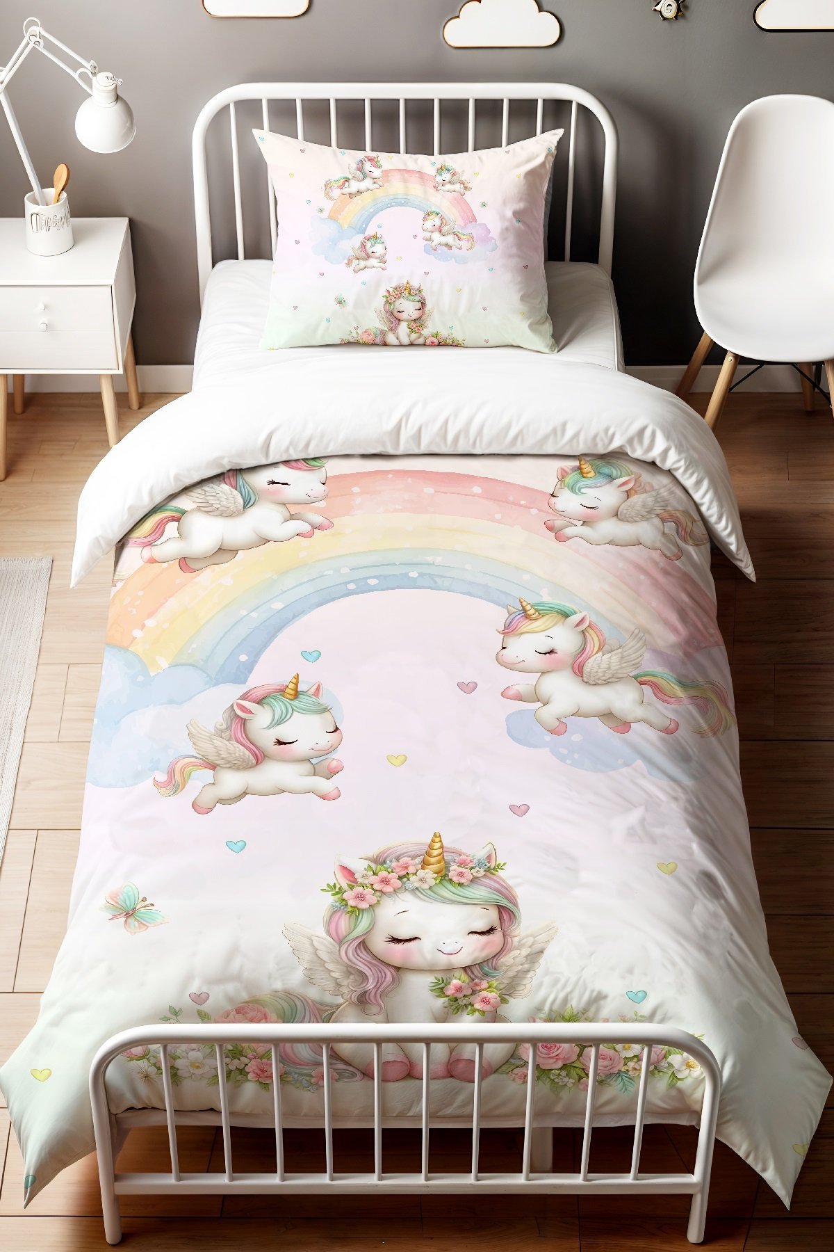Çiçek Taçlı Unicornlar Desenli Tek Kişilik Bebek Çocuk Nevresim Seti