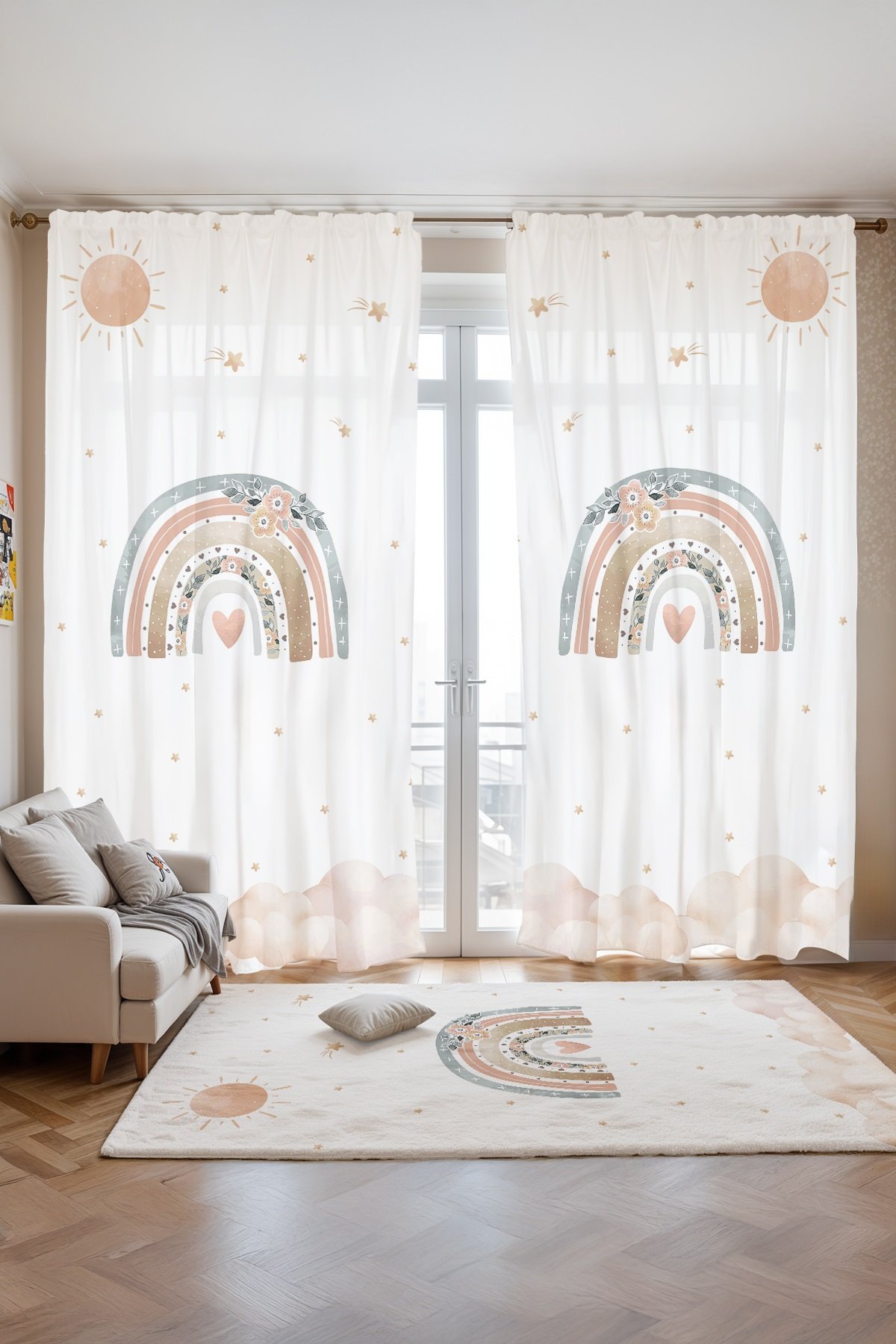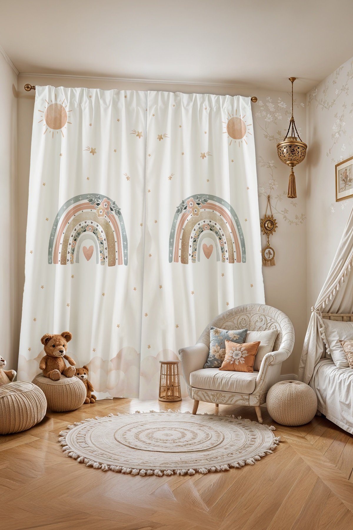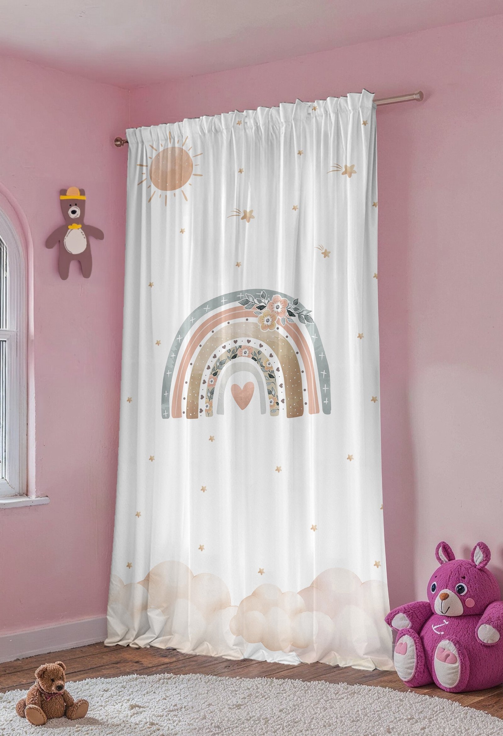 Çiçekten Gökkuşağı Desenli Çocuk Bebek Odası Fon Perde (Tek Kanat Fiyatlandırma)