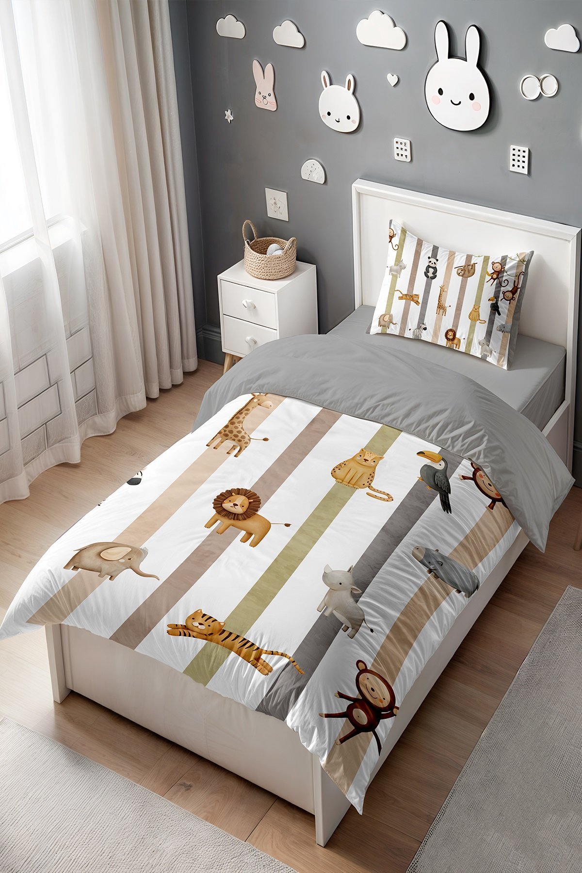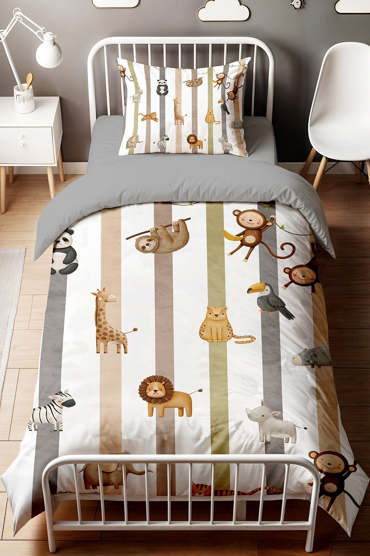 Çizgiler ve Hayvanlar Desenli Tek Kişilik Bebek Çocuk Nevresim Seti