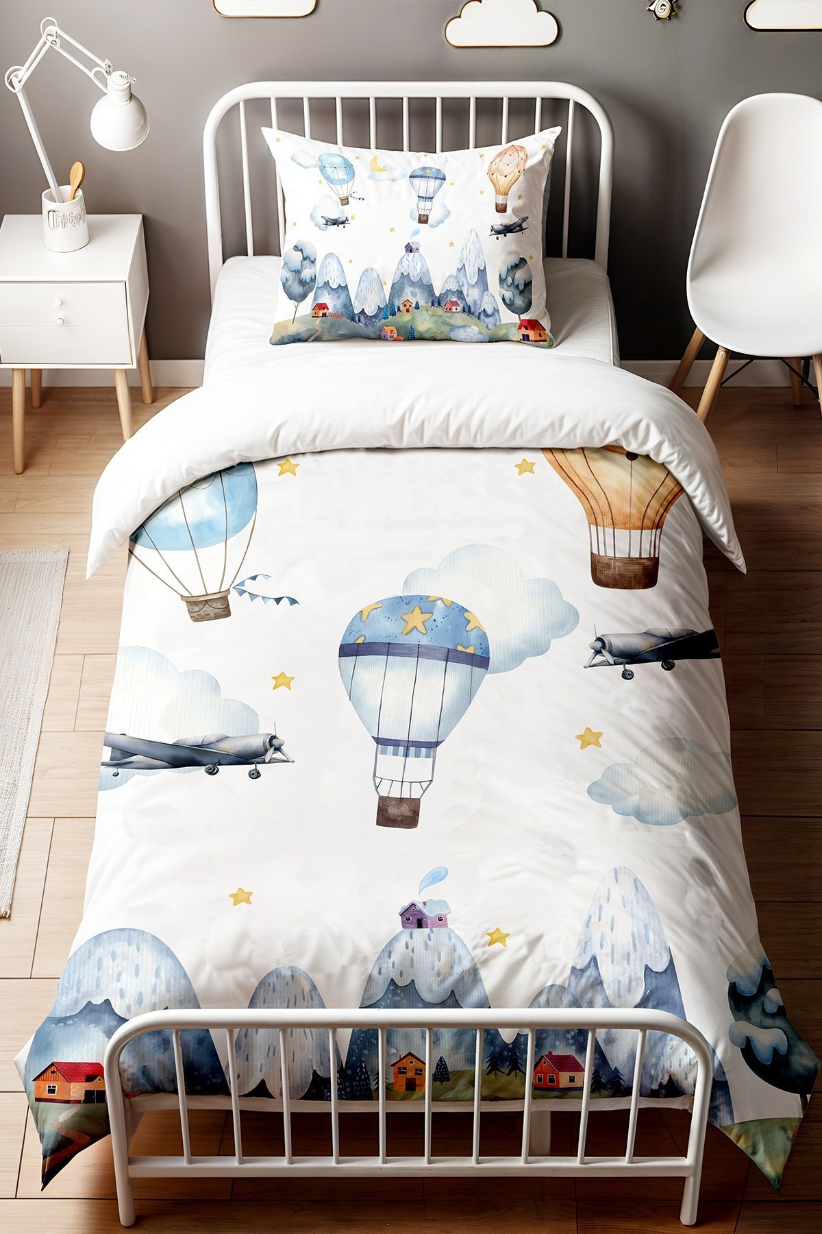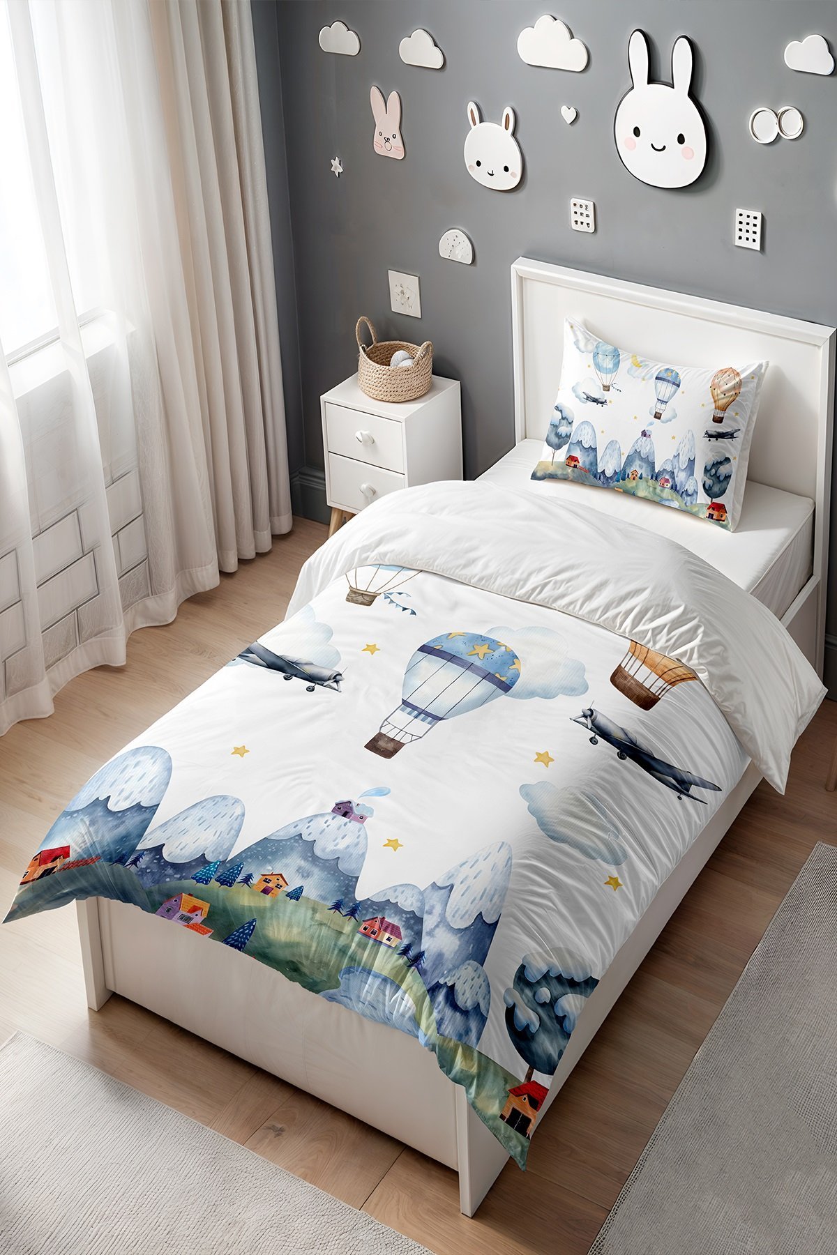 Dağın Üstündeki Uçan Balonlar Desenli Tek Kişilik Bebek Çocuk Nevresim Seti