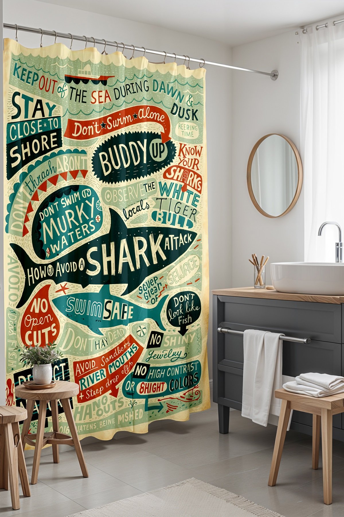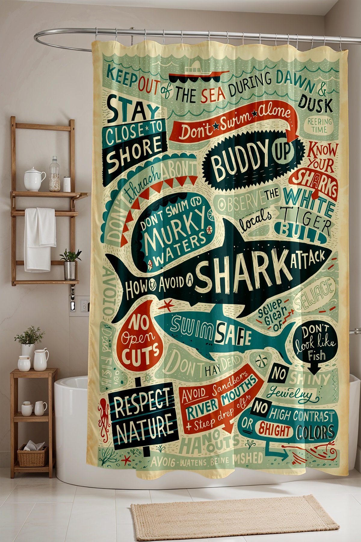 Denizdeki Uyarılar Desenli Duş Perdesi Küvet Perdesi 175x200cm
