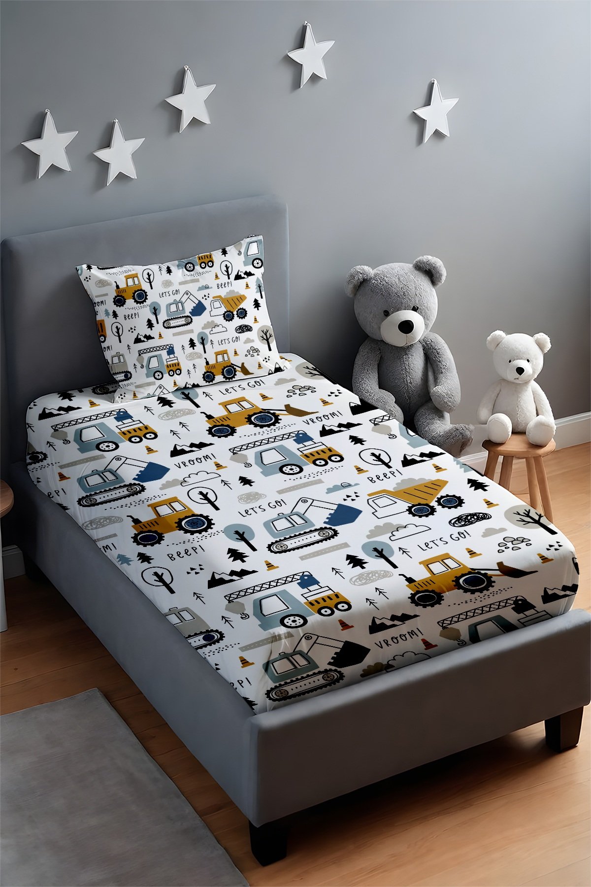Eğlenceli İnşaat Vakti Desenli Yatak Örtüsü ve Yastık Kılıfı