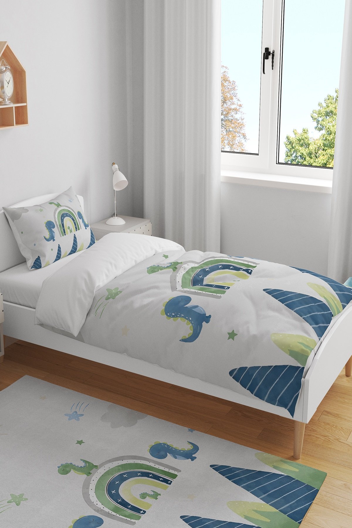Gökkuşağı Dinazor Safari Desenli Tek Kişilik Bebek Çocuk Nevresim Seti