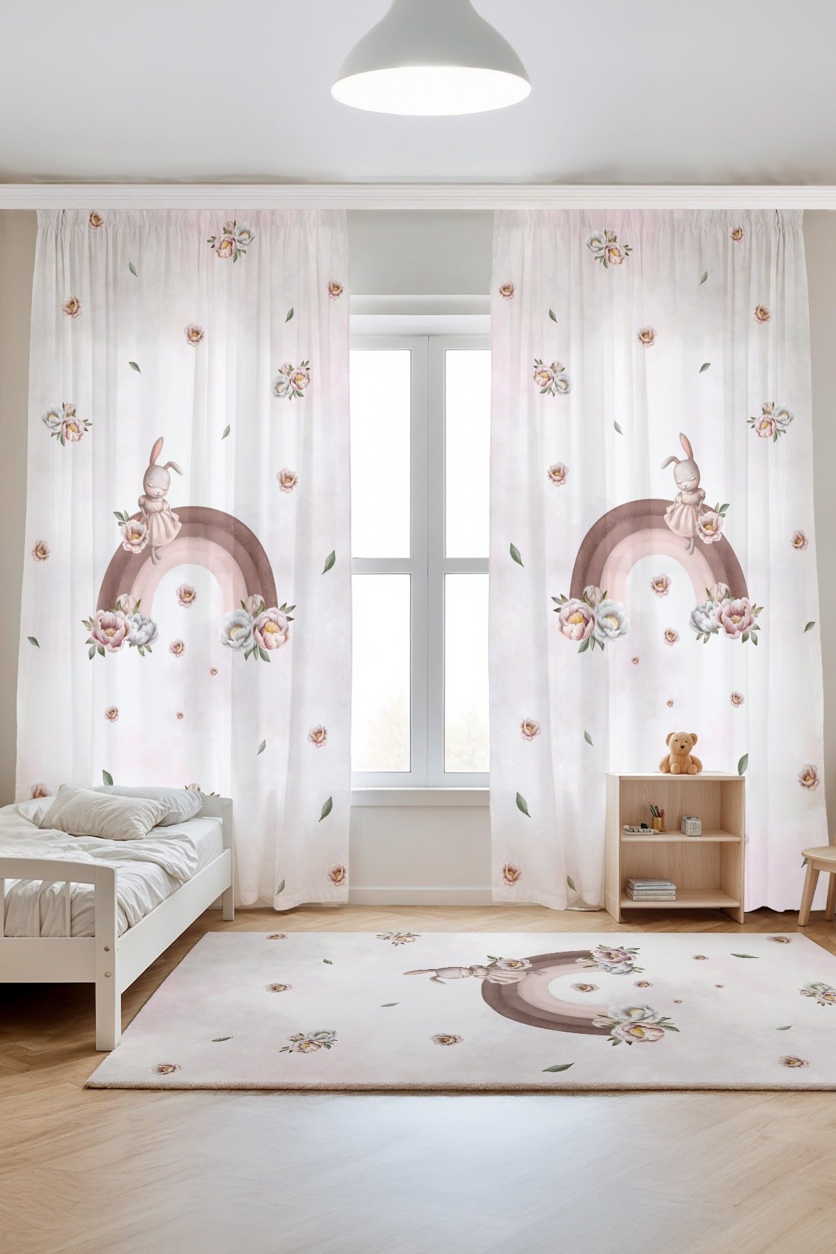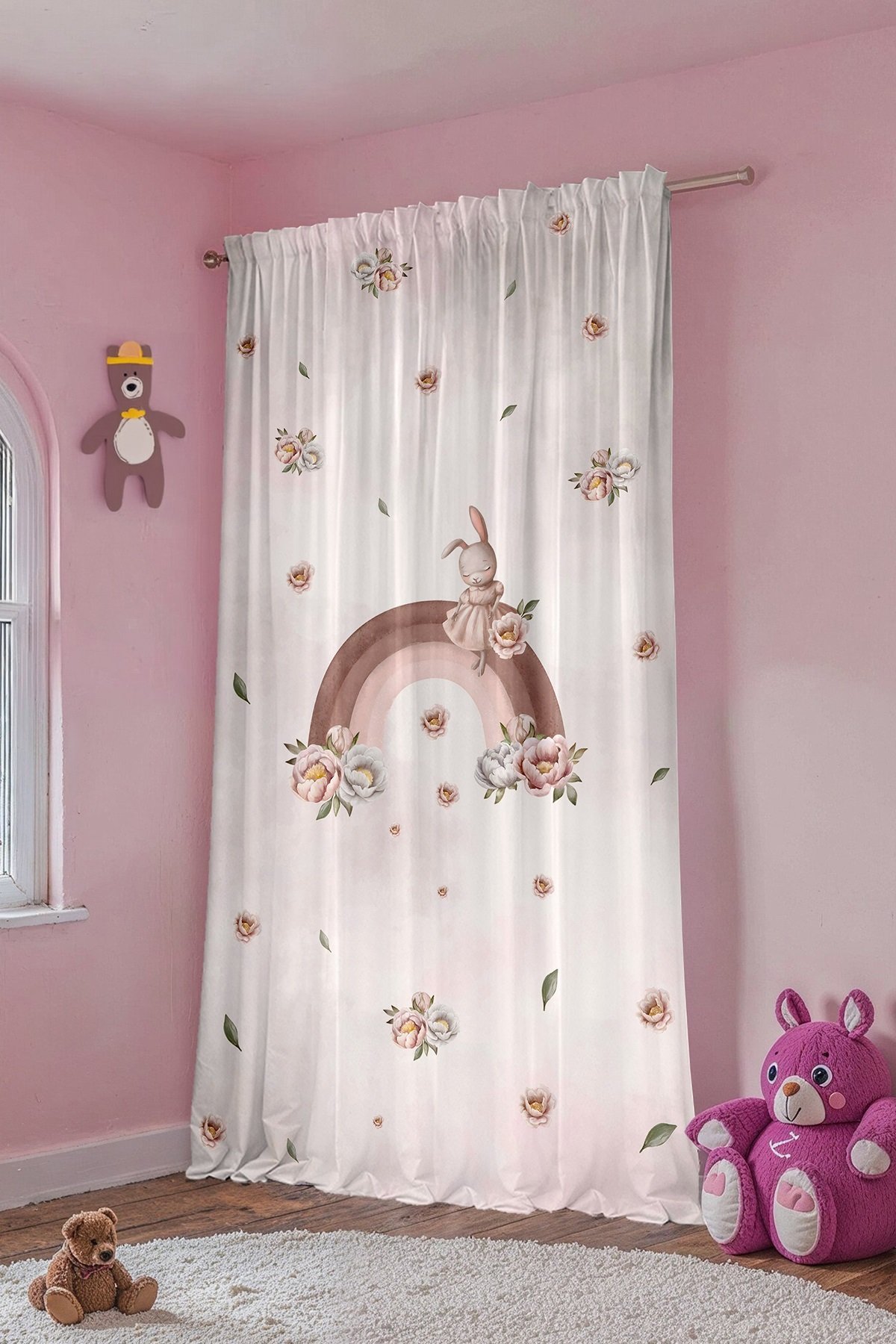 Gökkuşağında Çiçekli Tavşan Desenli Çocuk Bebek Odası Fon Perde (Tek Kanat Fiyatlandırma)