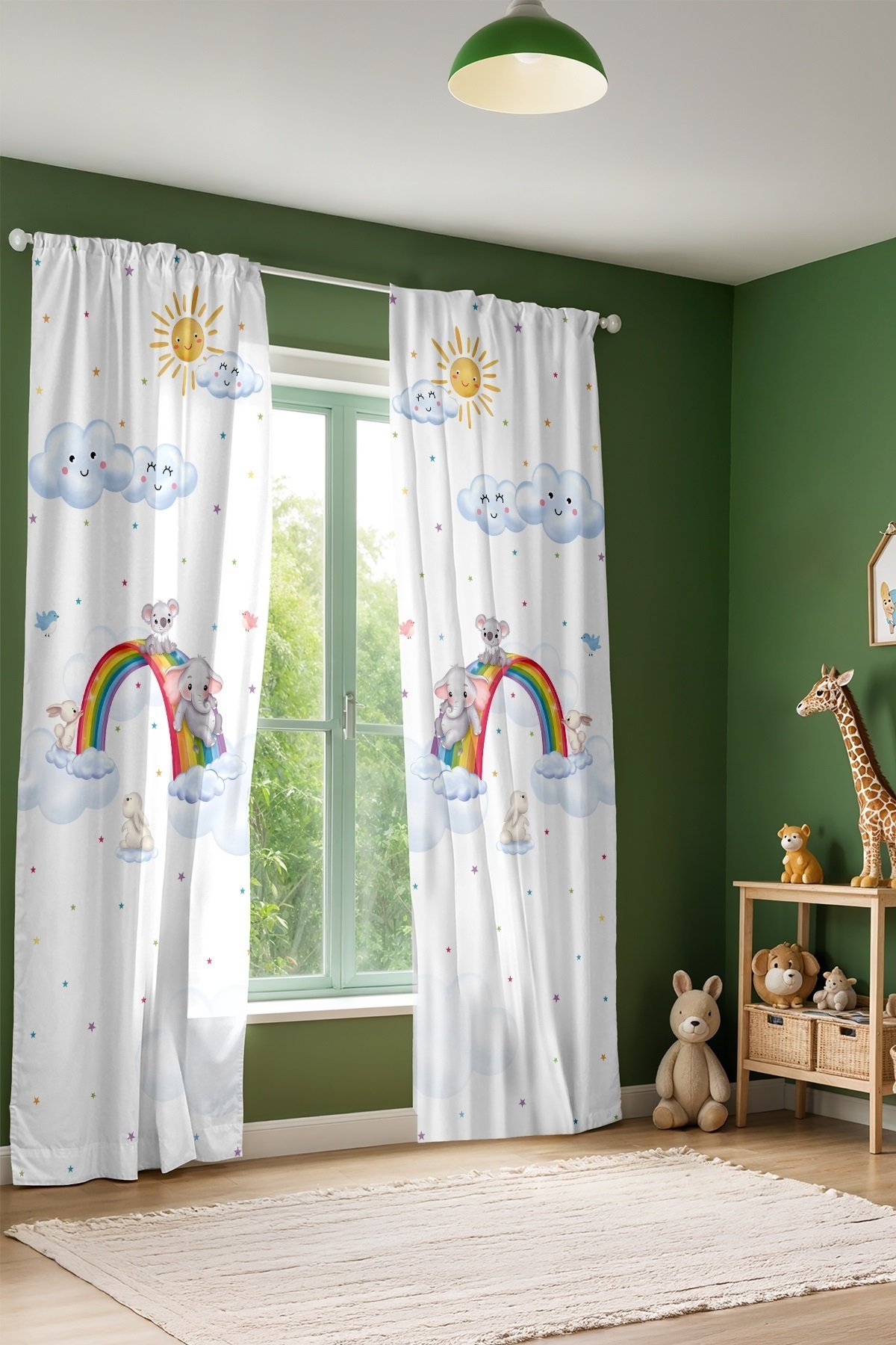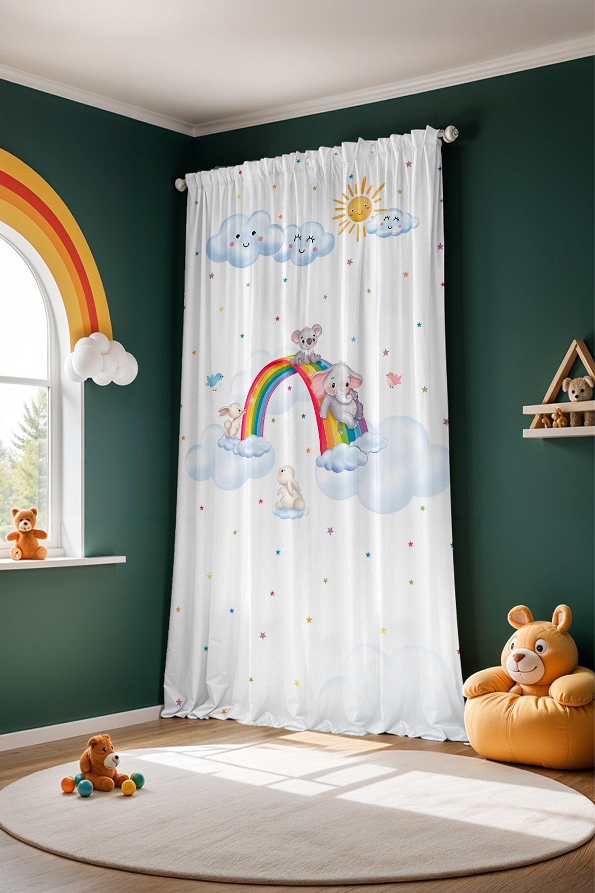Gökkuşağında Kayan Sevimli Hayvanlar Desenli Çocuk Bebek Odası Fon Perde (Tek Kanat Fiyatlandırma)