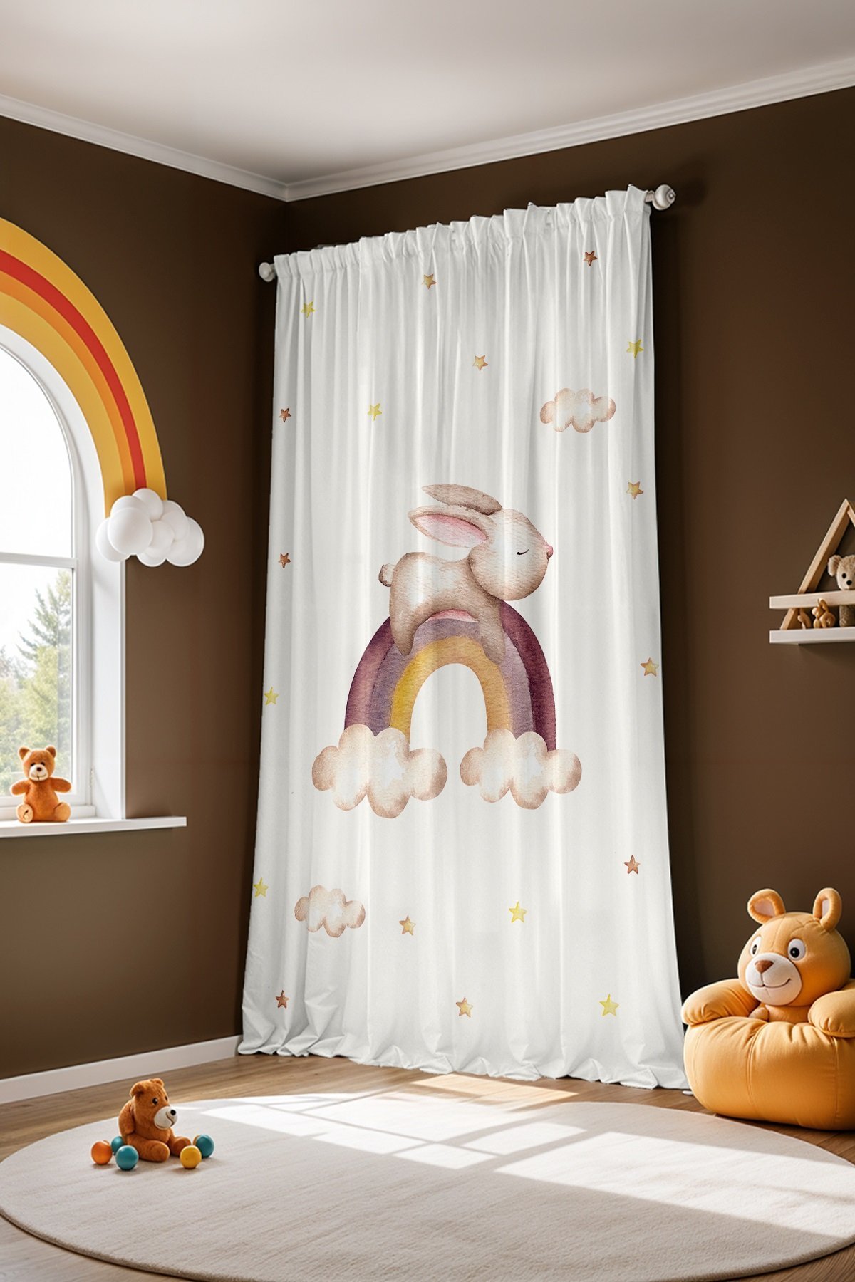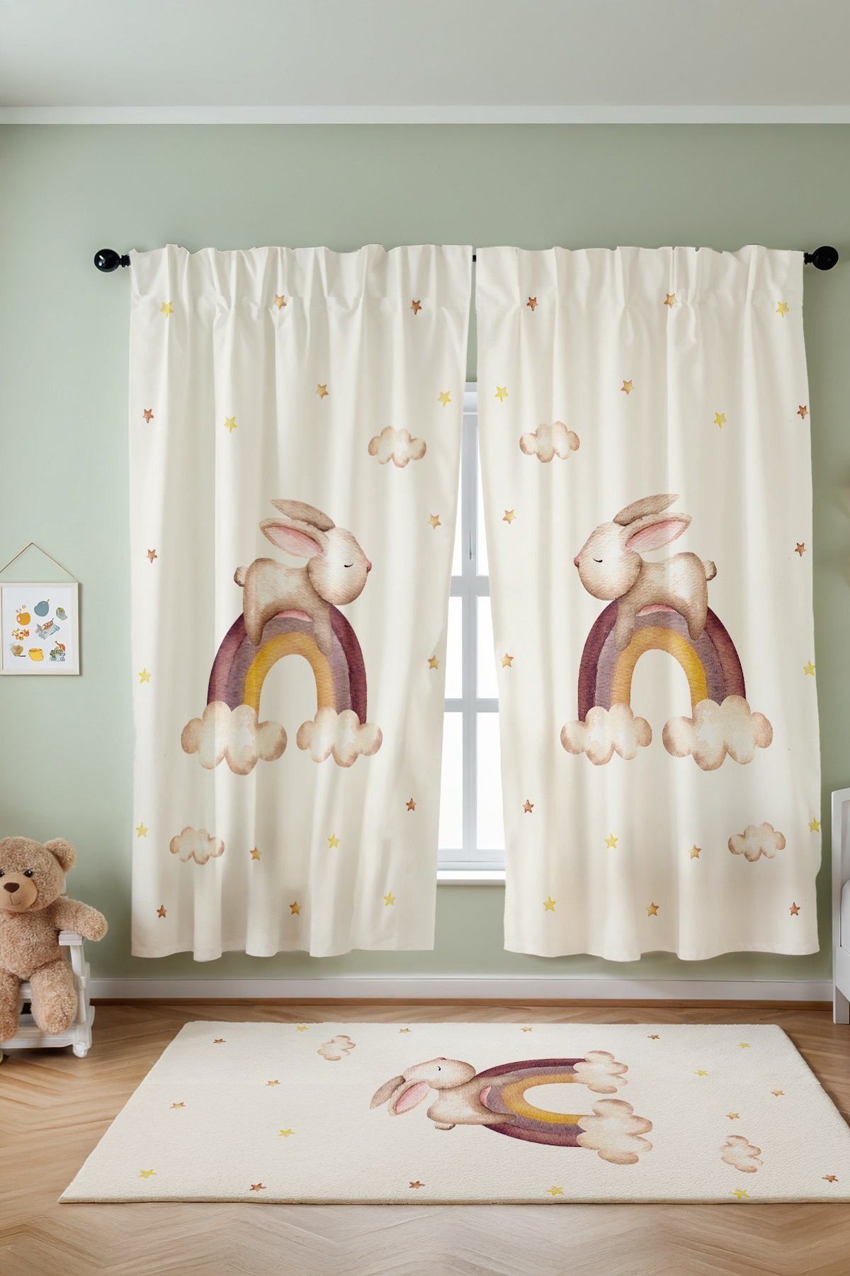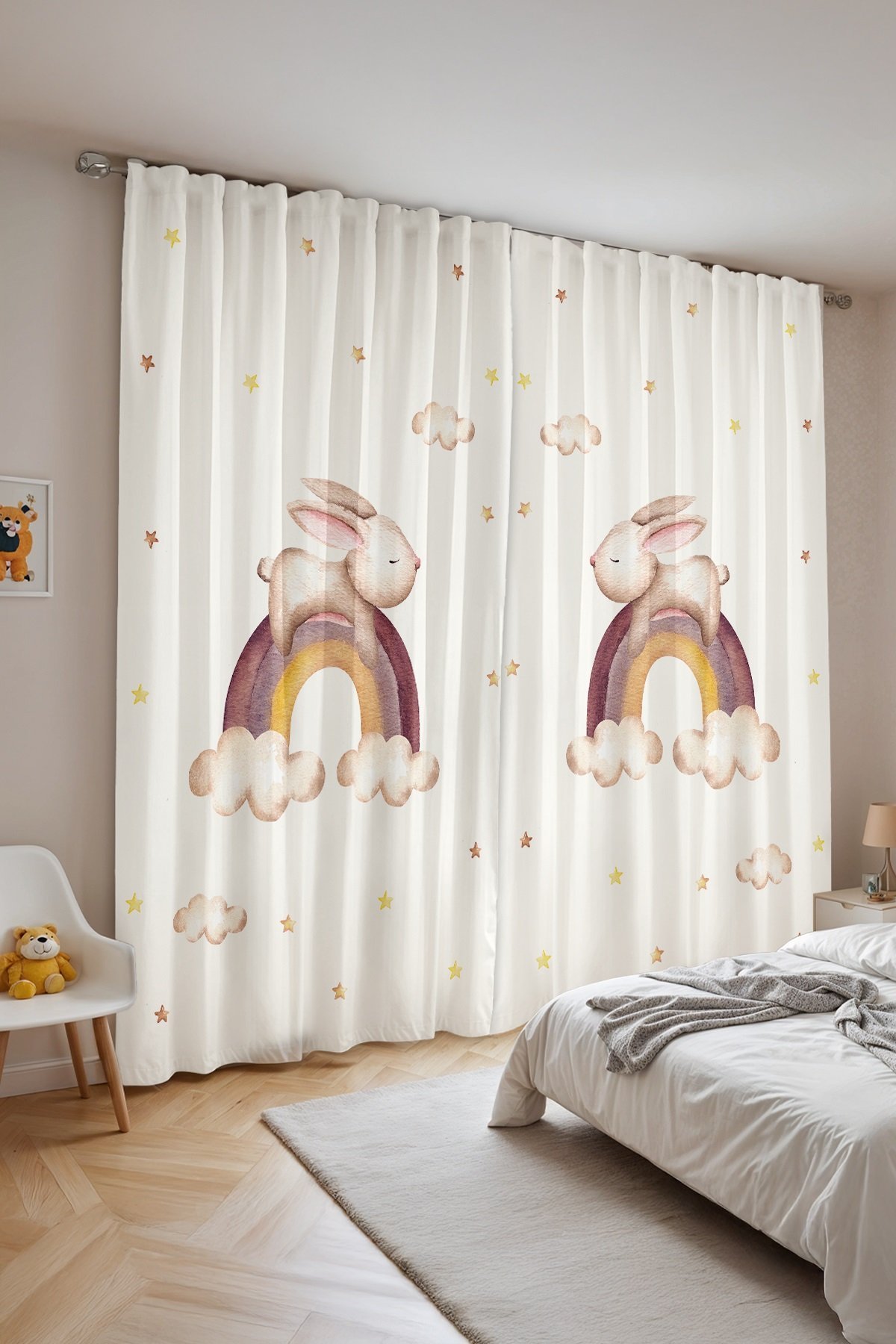 Gökkuşağında Uyuyan Tavşan Desenli Çocuk Bebek Odası Fon Perde (Tek Kanat Fiyatlandırma)