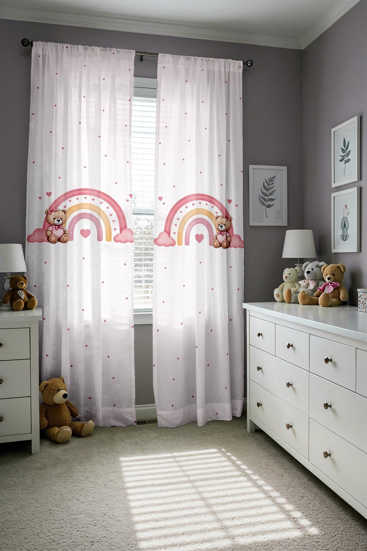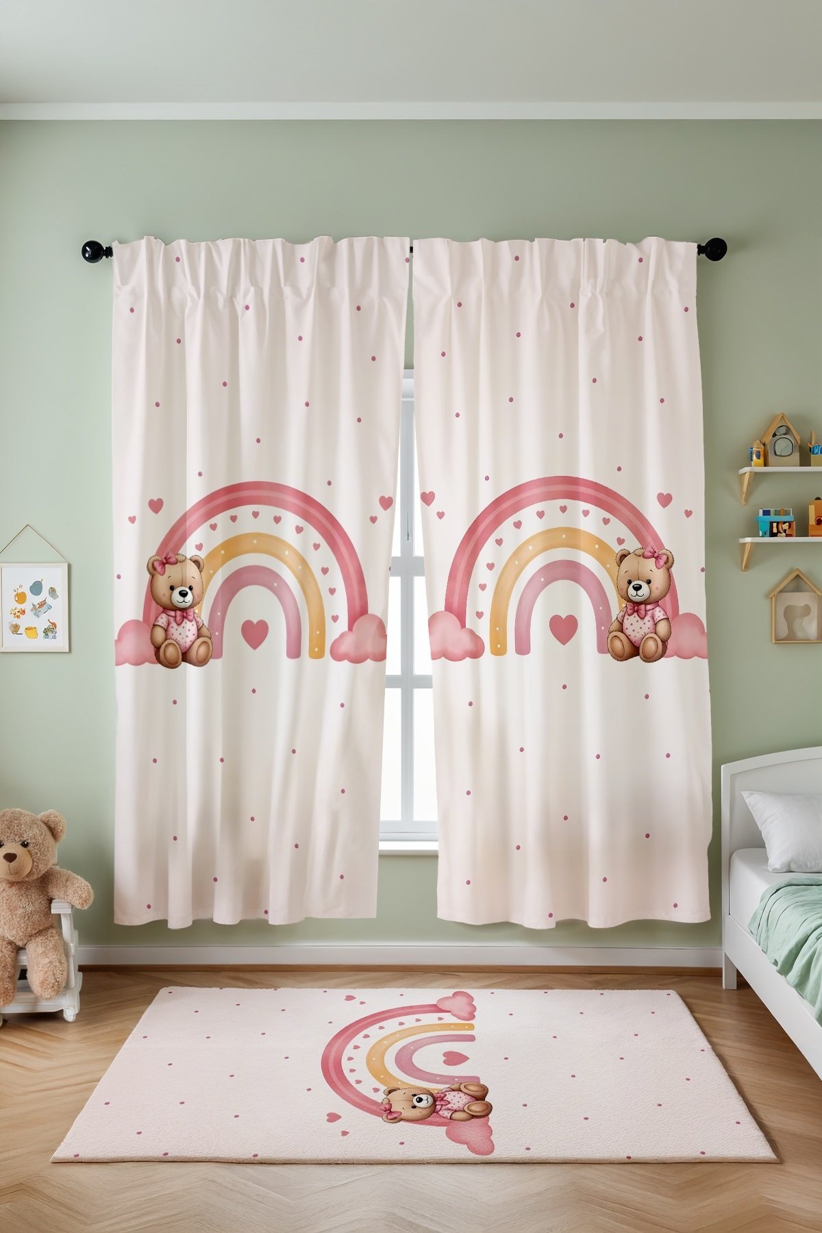 Gökkuşaklı Bebek Ayıcık Desenli Çocuk Bebek Odası Fon Perde (Tek Kanat Fiyatlandırma)