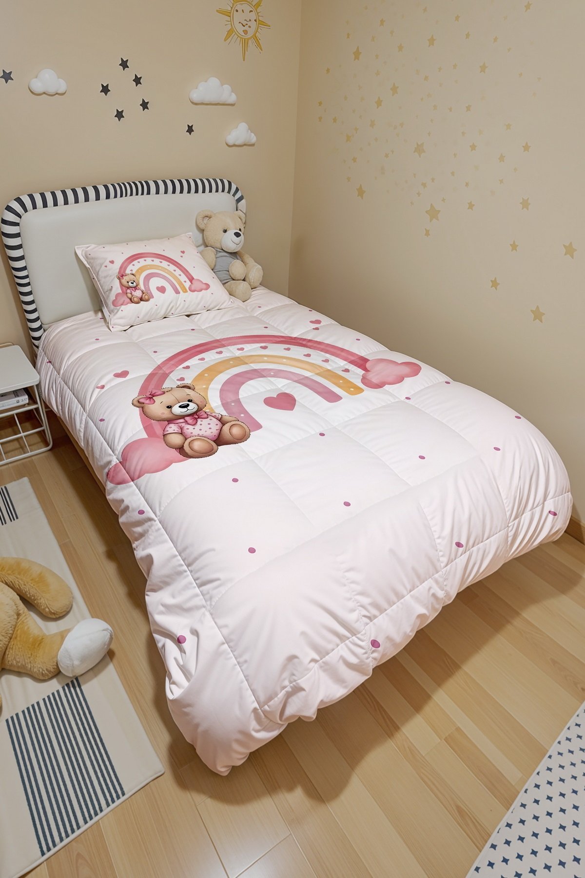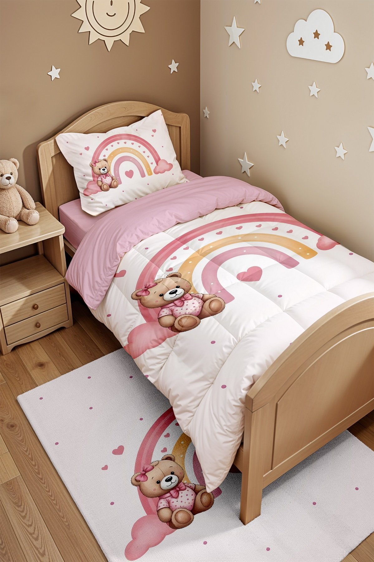 Gökkuşaklı Bebek Ayıcık Desenli Tek Kişilik Yorgan ve Yastık Kılıfı