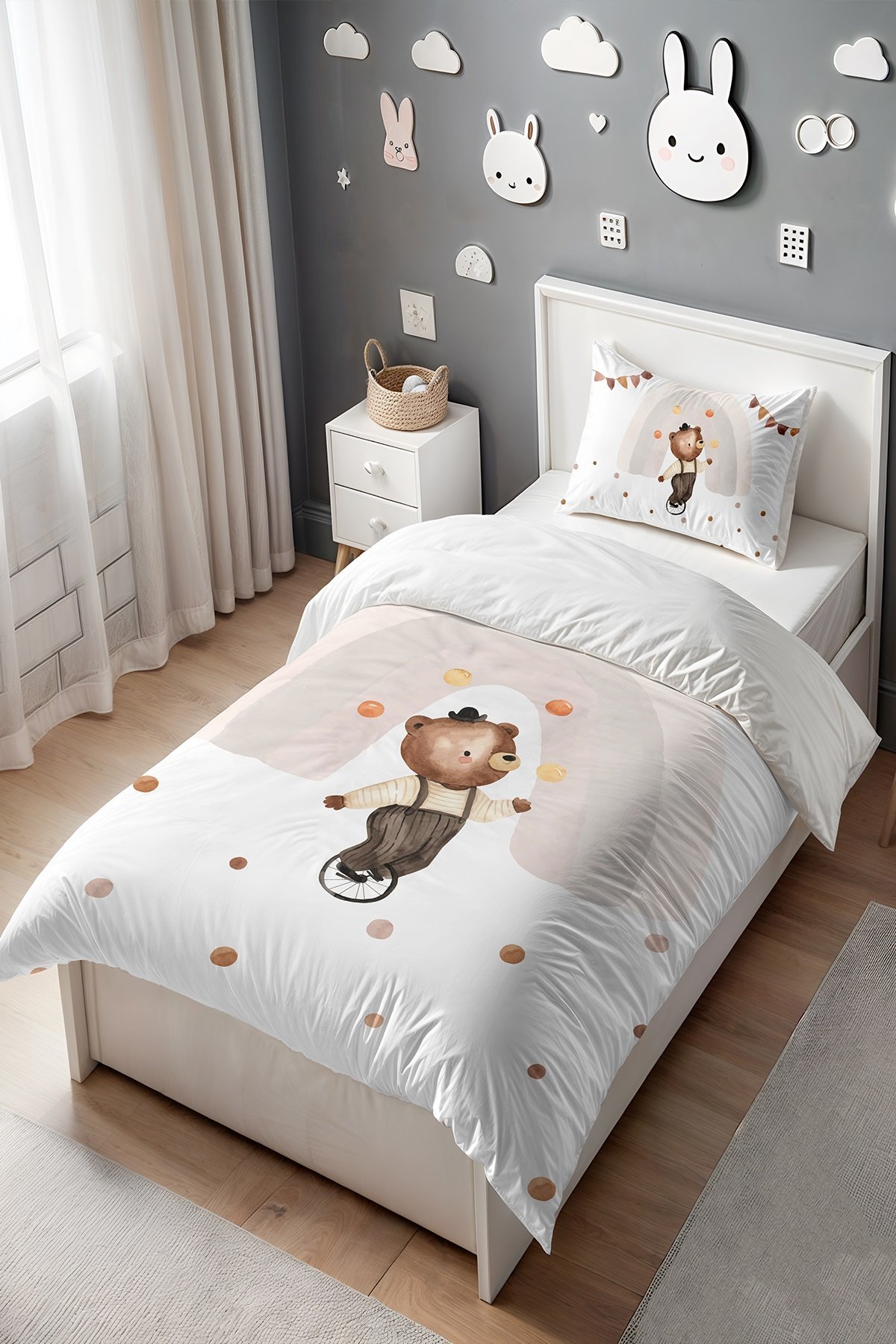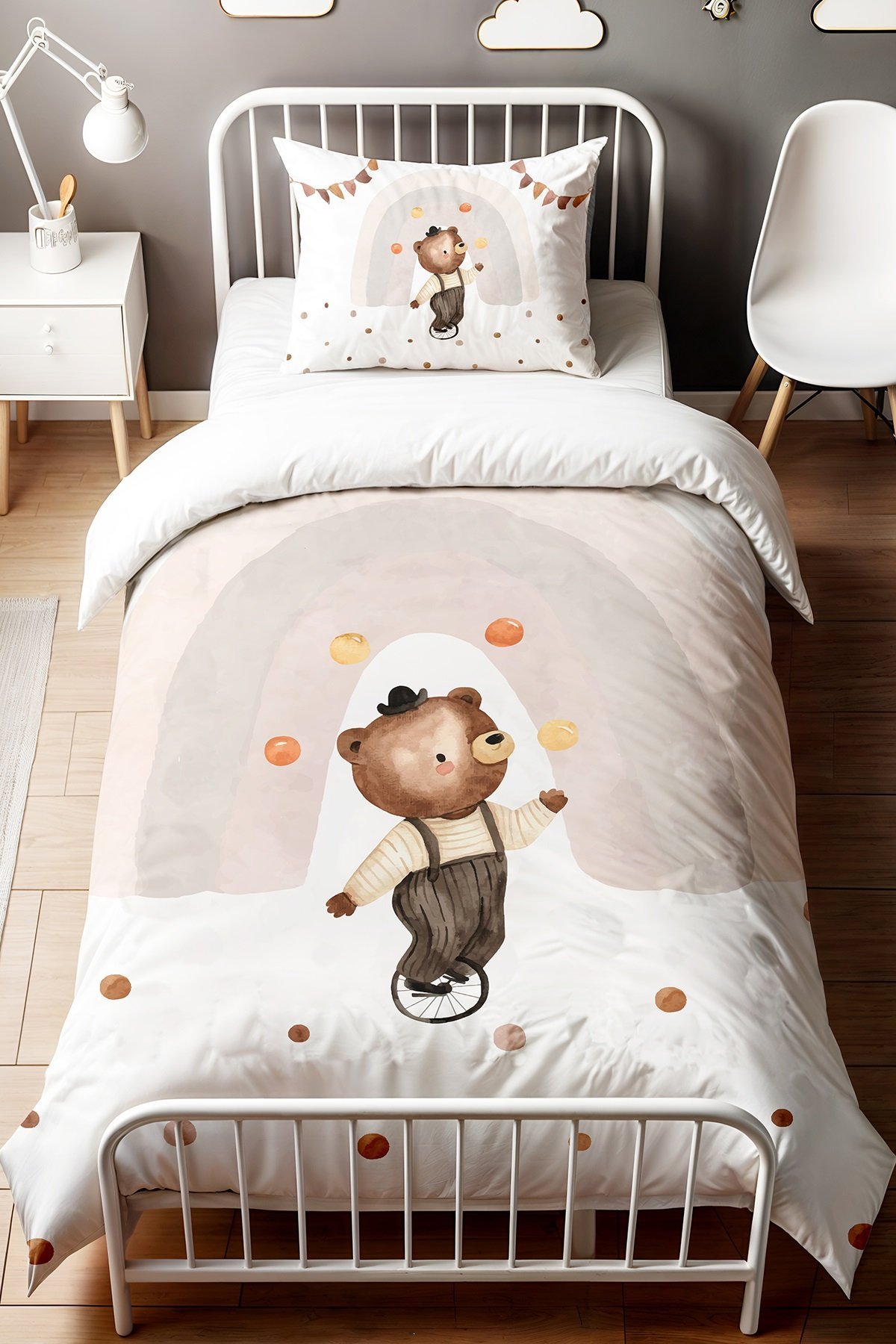 Gökkuşaklı Sirk Ayıcığı Desenli Tek Kişilik Bebek Çocuk Nevresim Seti