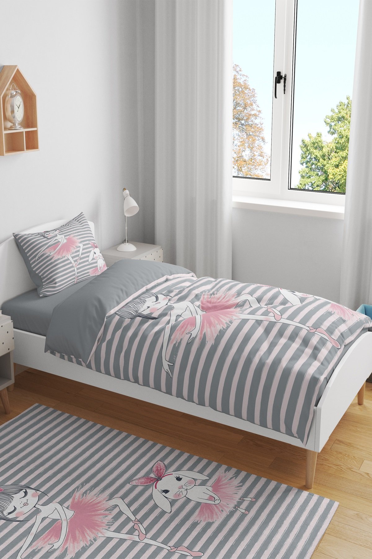 Gri Balerin ve Tavşan Desenli Tek Kişilik Bebek Çocuk Nevresim Takımı