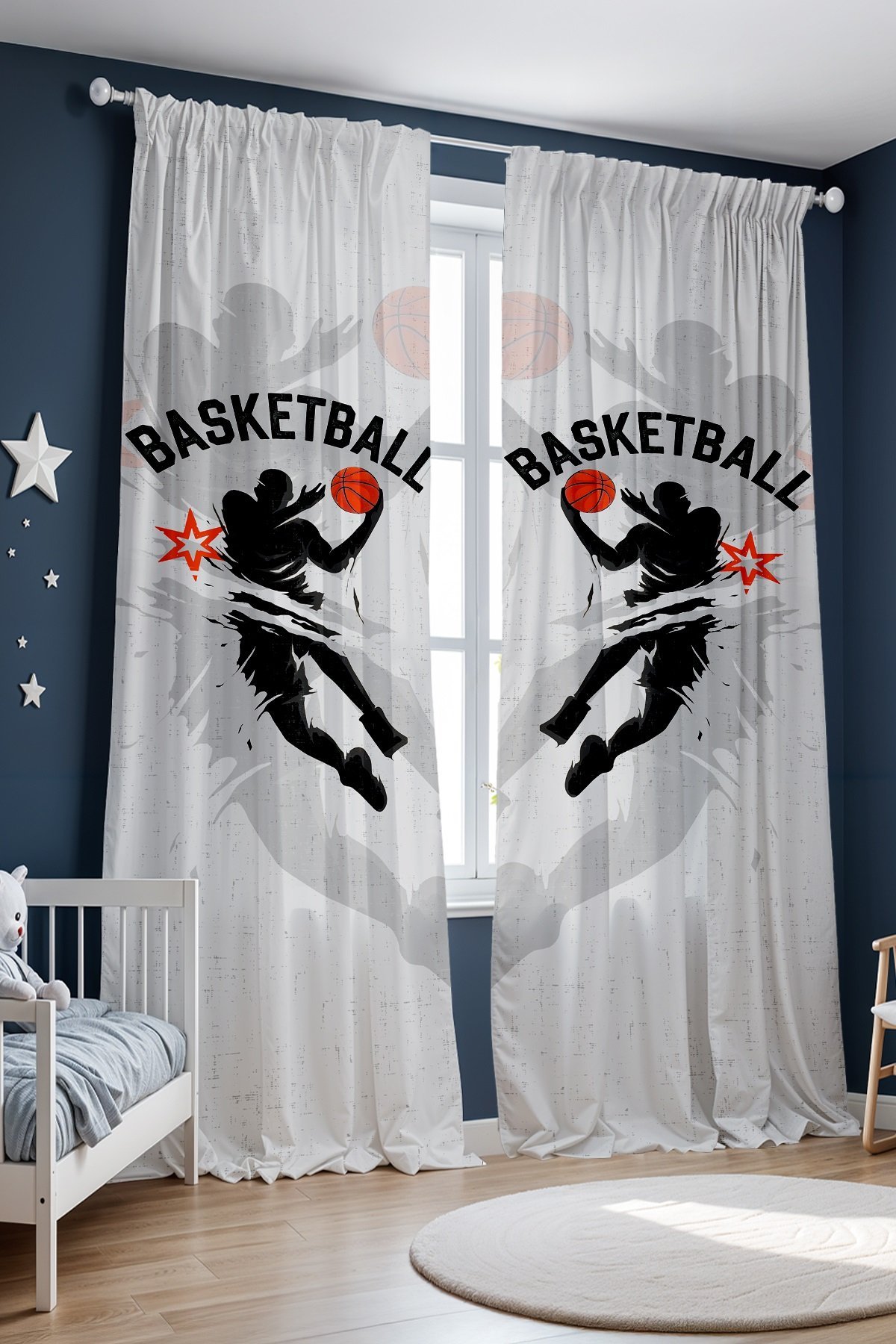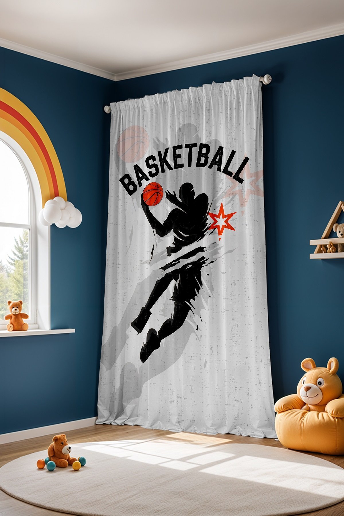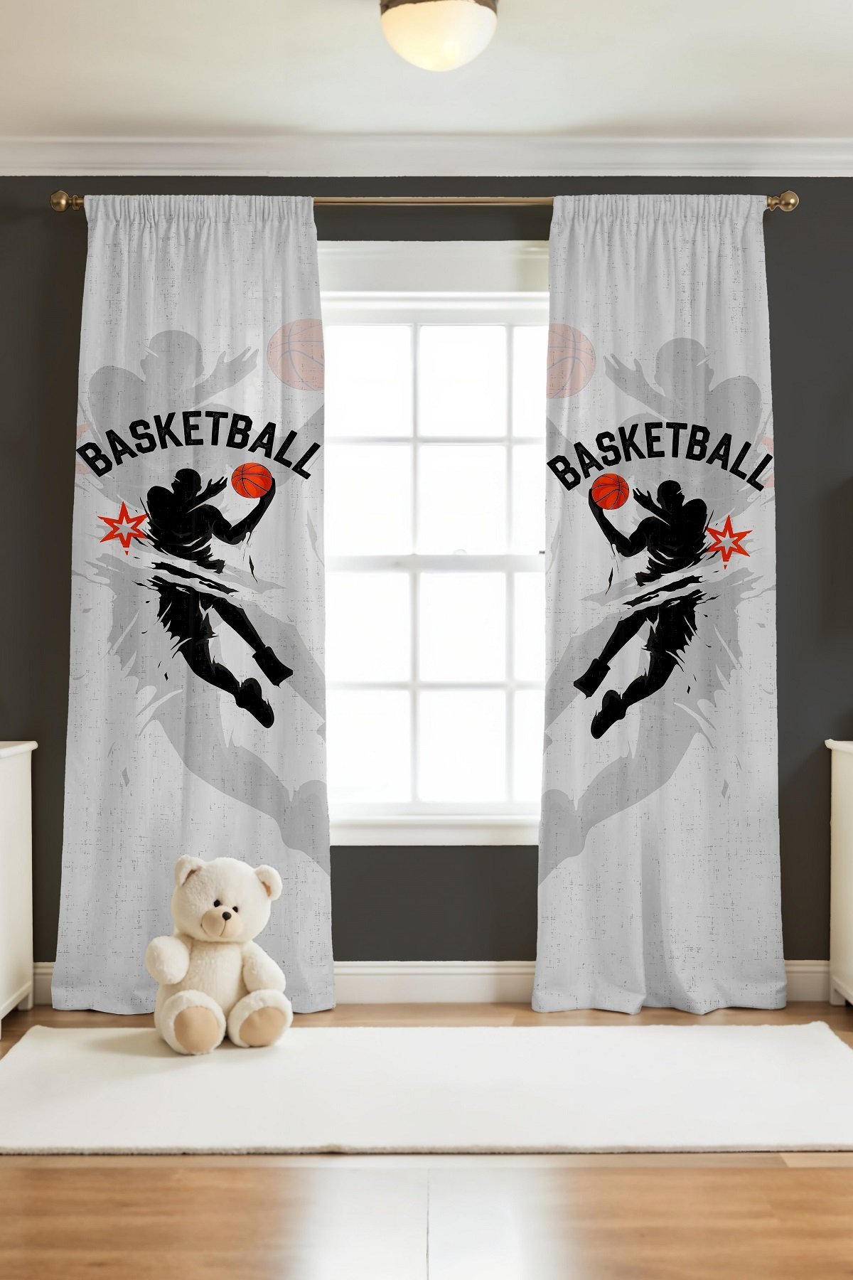 Gri Basket Yıldızı Desenli Çocuk Bebek Odası Fon Perde (Tek Kanat Fiyatlandırma)