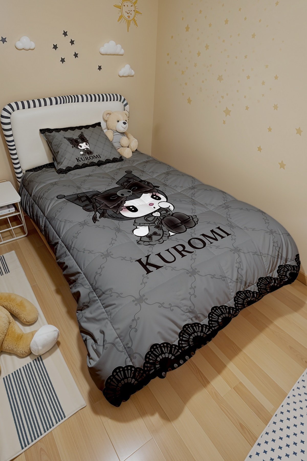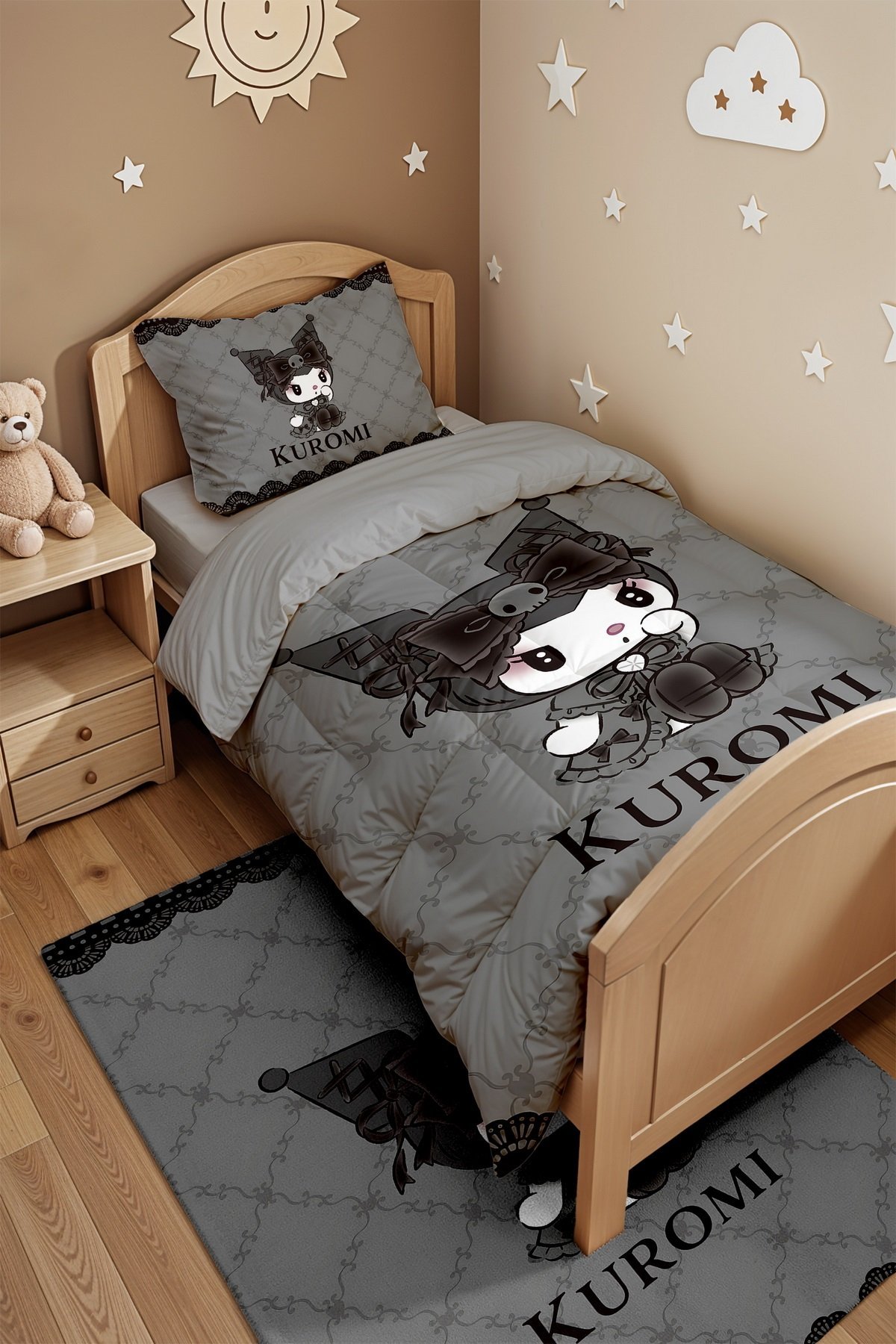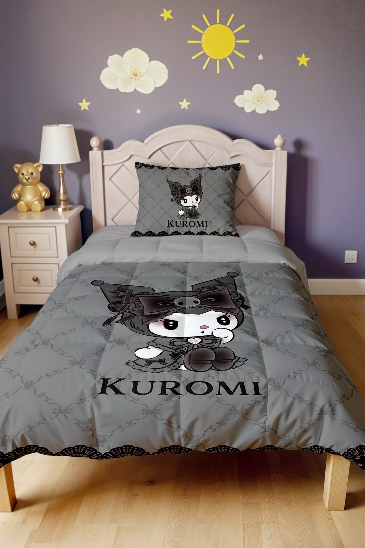 Gri Desenli Utangaç Kuromi Desenli Tek Kişilik Yorgan ve Yastık Kılıfı