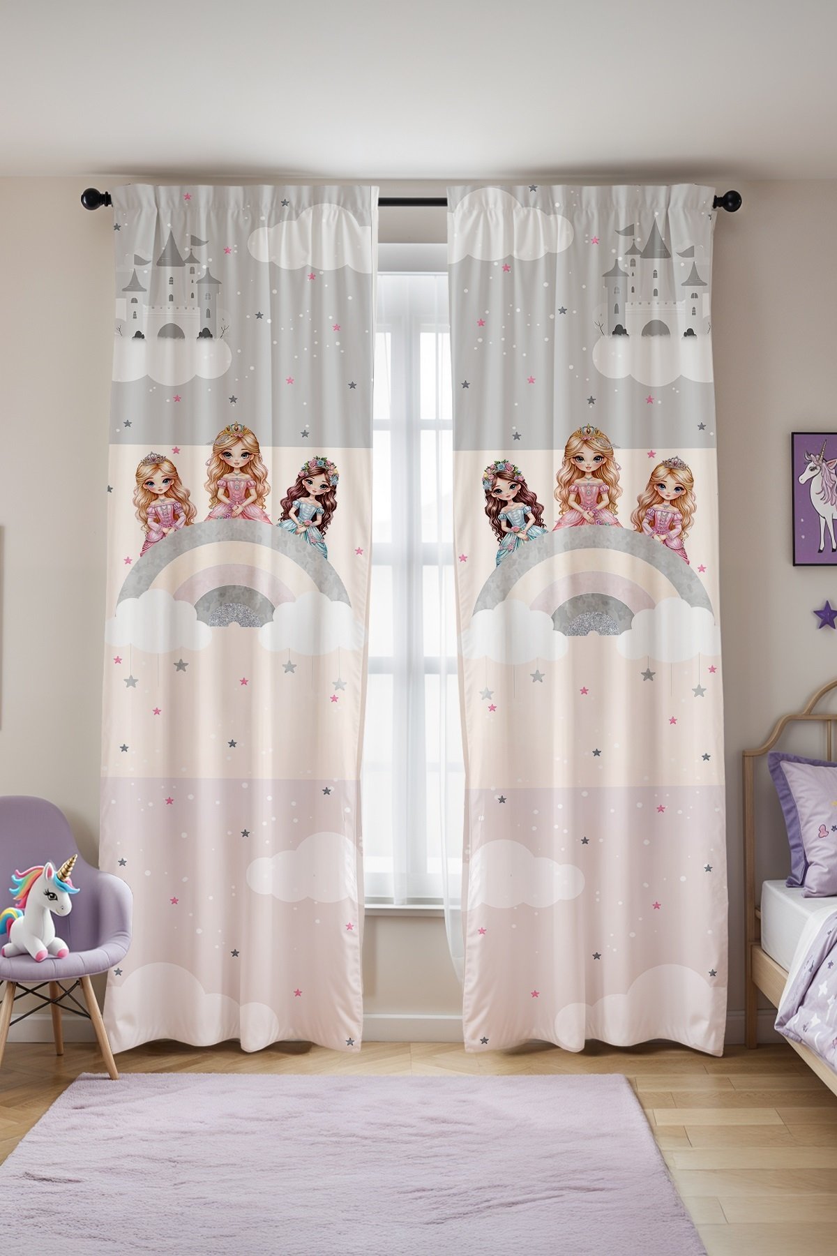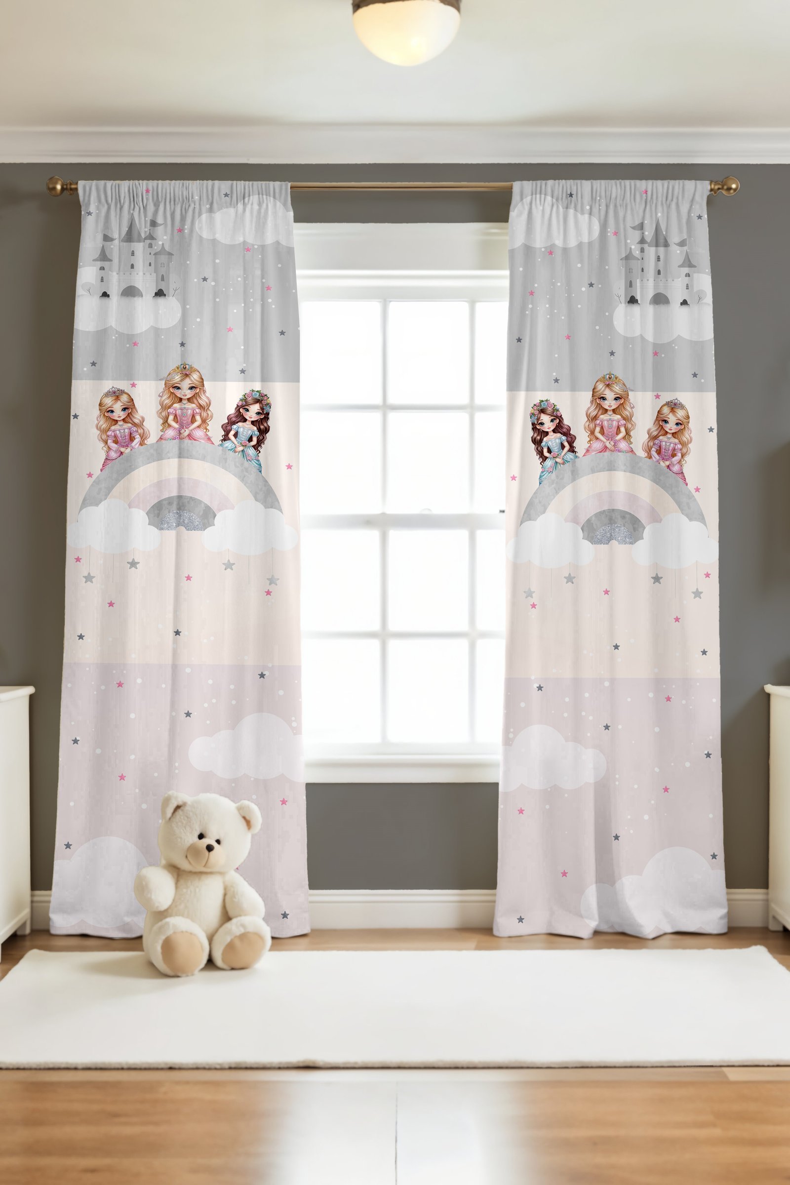 Gri Gökkuşağı Prensesler Desenli Çocuk Bebek Odası Fon Perde (Tek Kanat Fiyatlandırma)