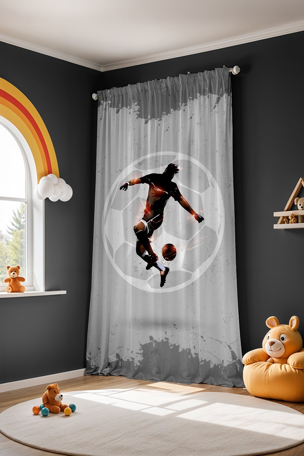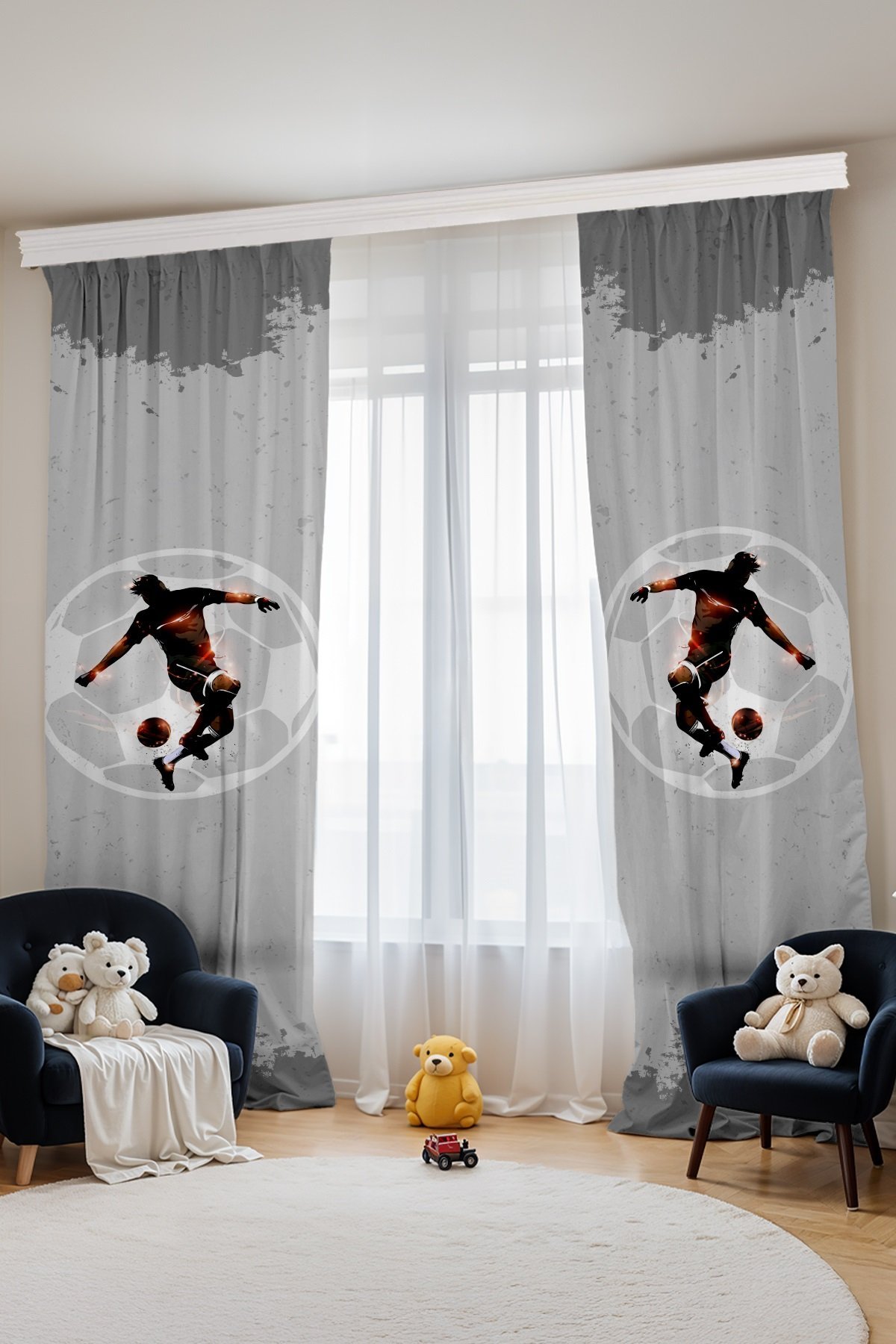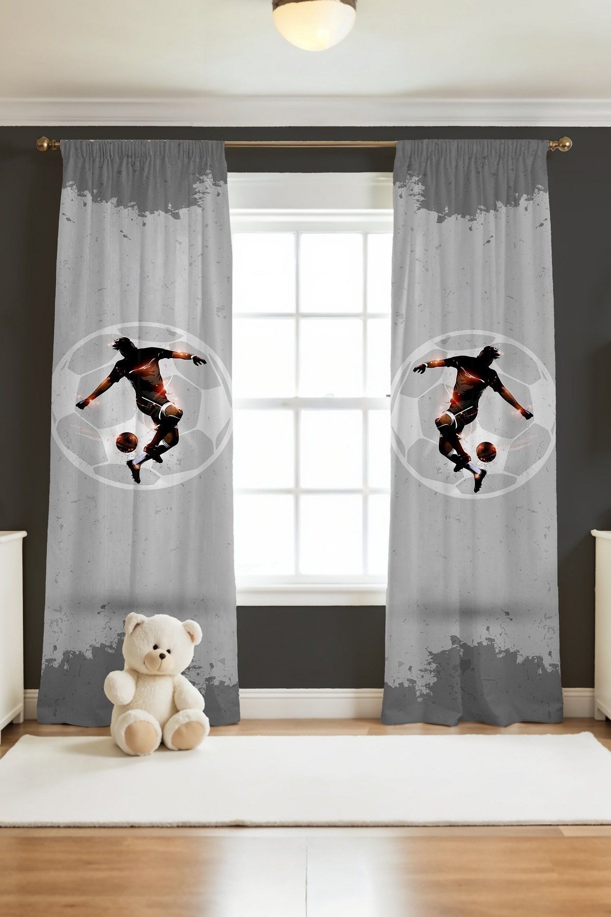 Gri Işıltılı Futbolcu Desenli Çocuk Bebek Odası Fon Perde (Tek Kanat Fiyatlandırma)