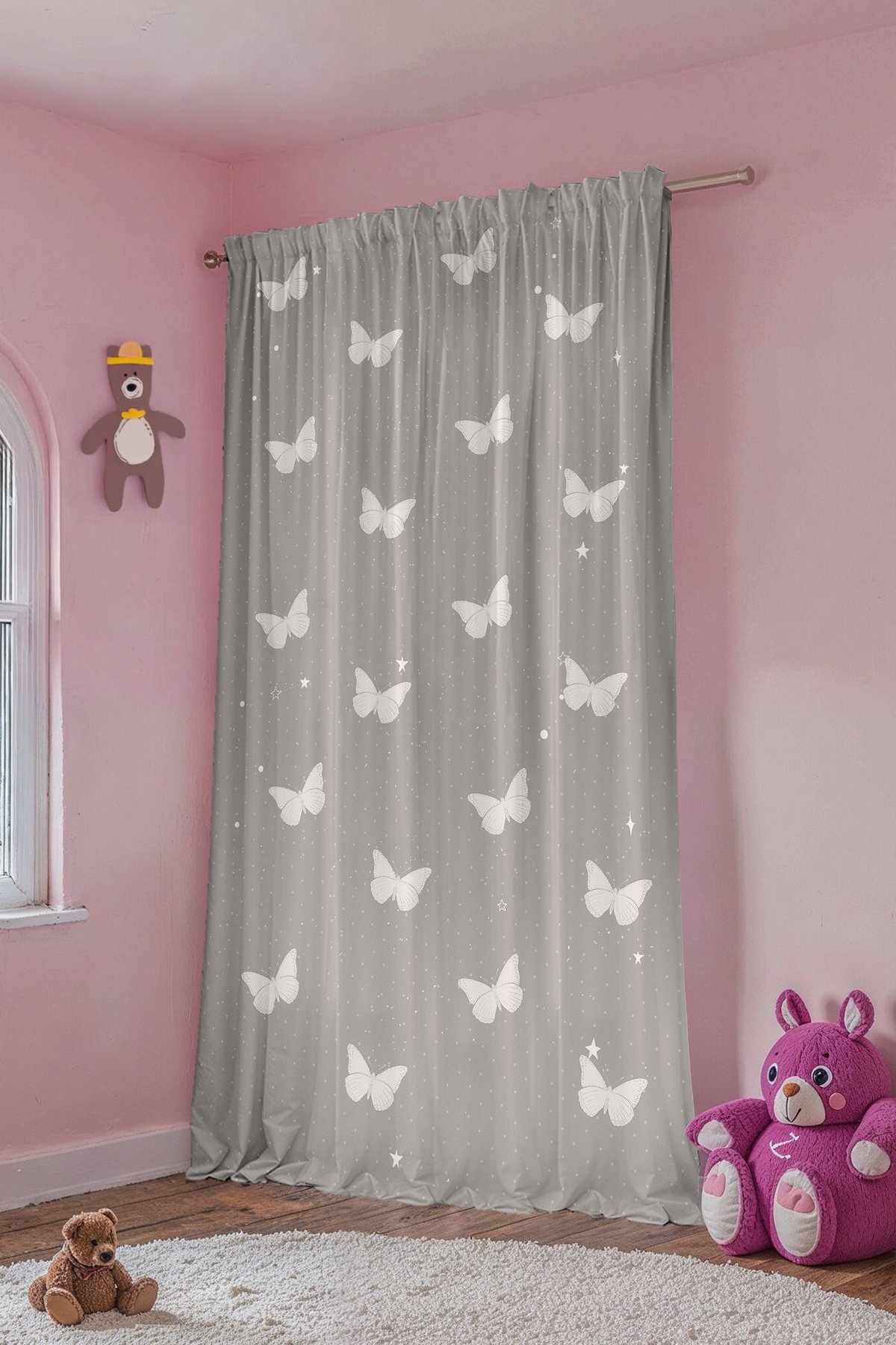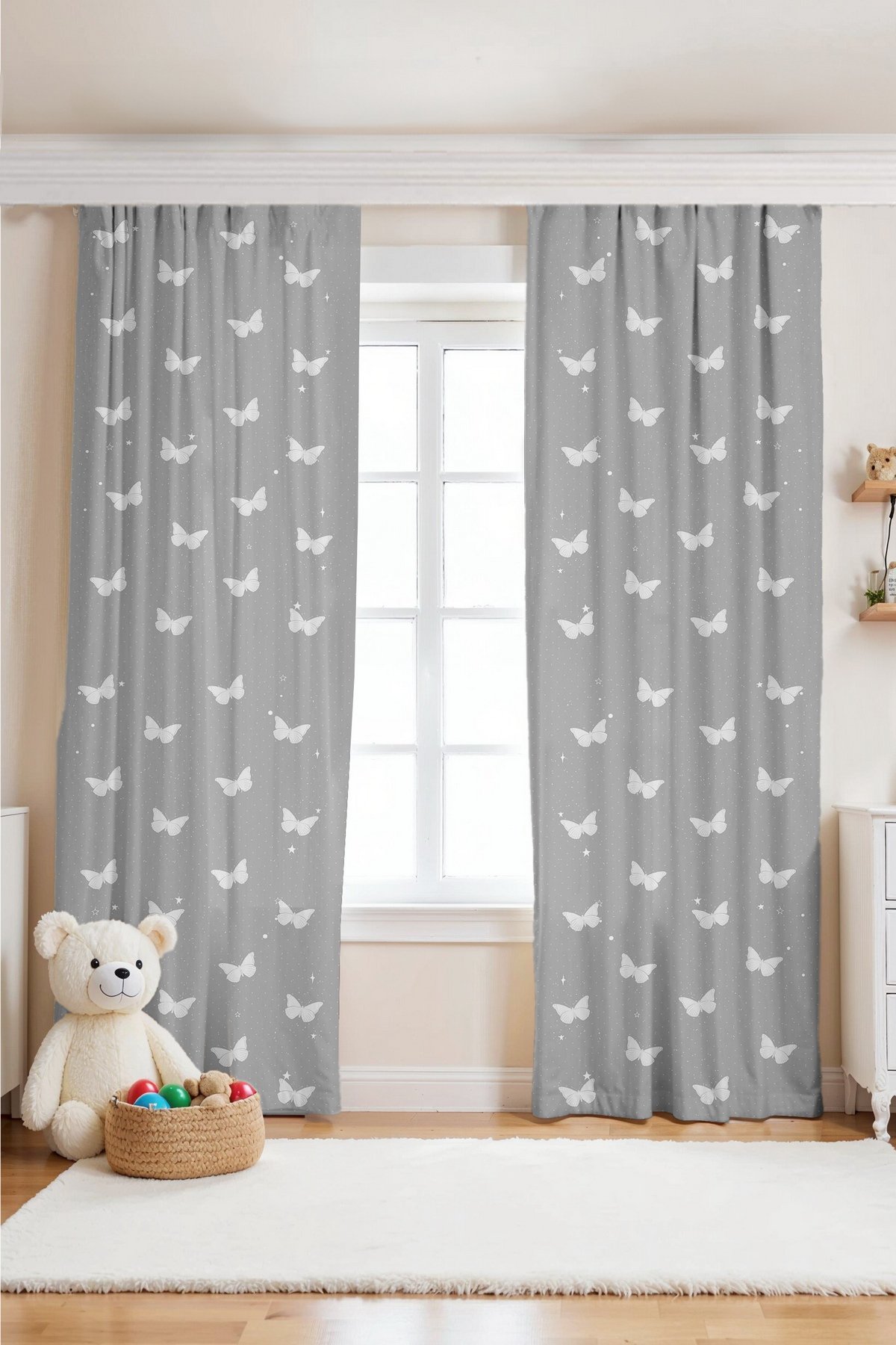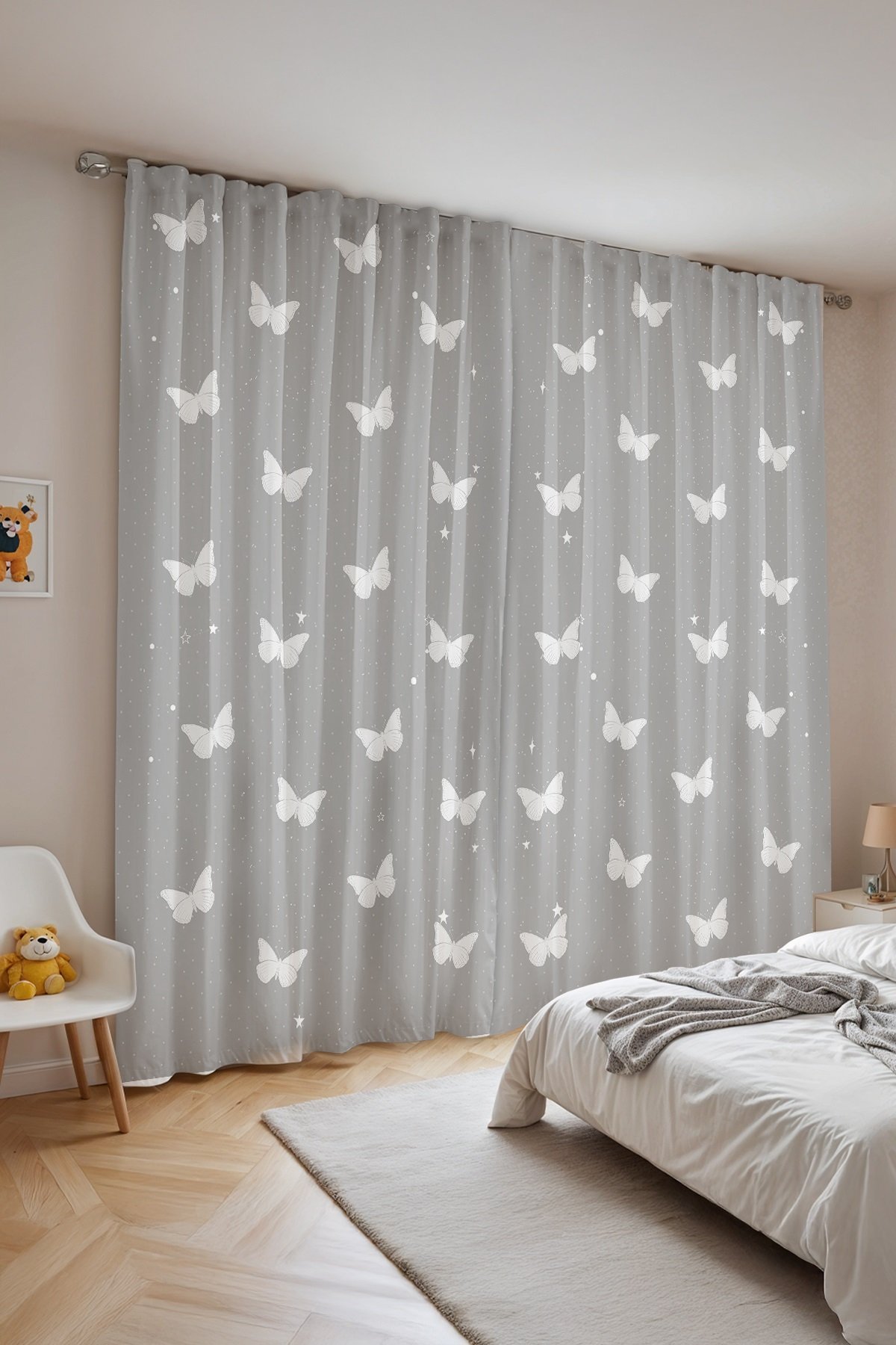 Gri Kelebekler Desenli Çocuk Bebek Odası Fon Perde (Tek Kanat Fiyatlandırma)