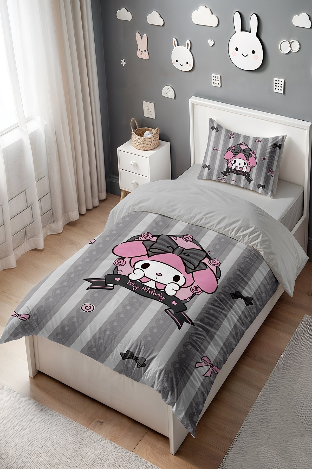 Gri My Melody Dantel İşlemeli Desenli Tek Kişilik Bebek Çocuk Nevresim Seti