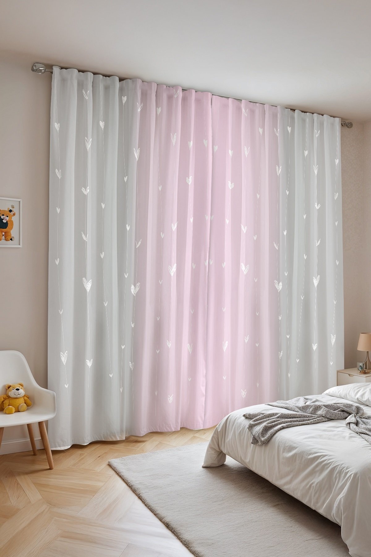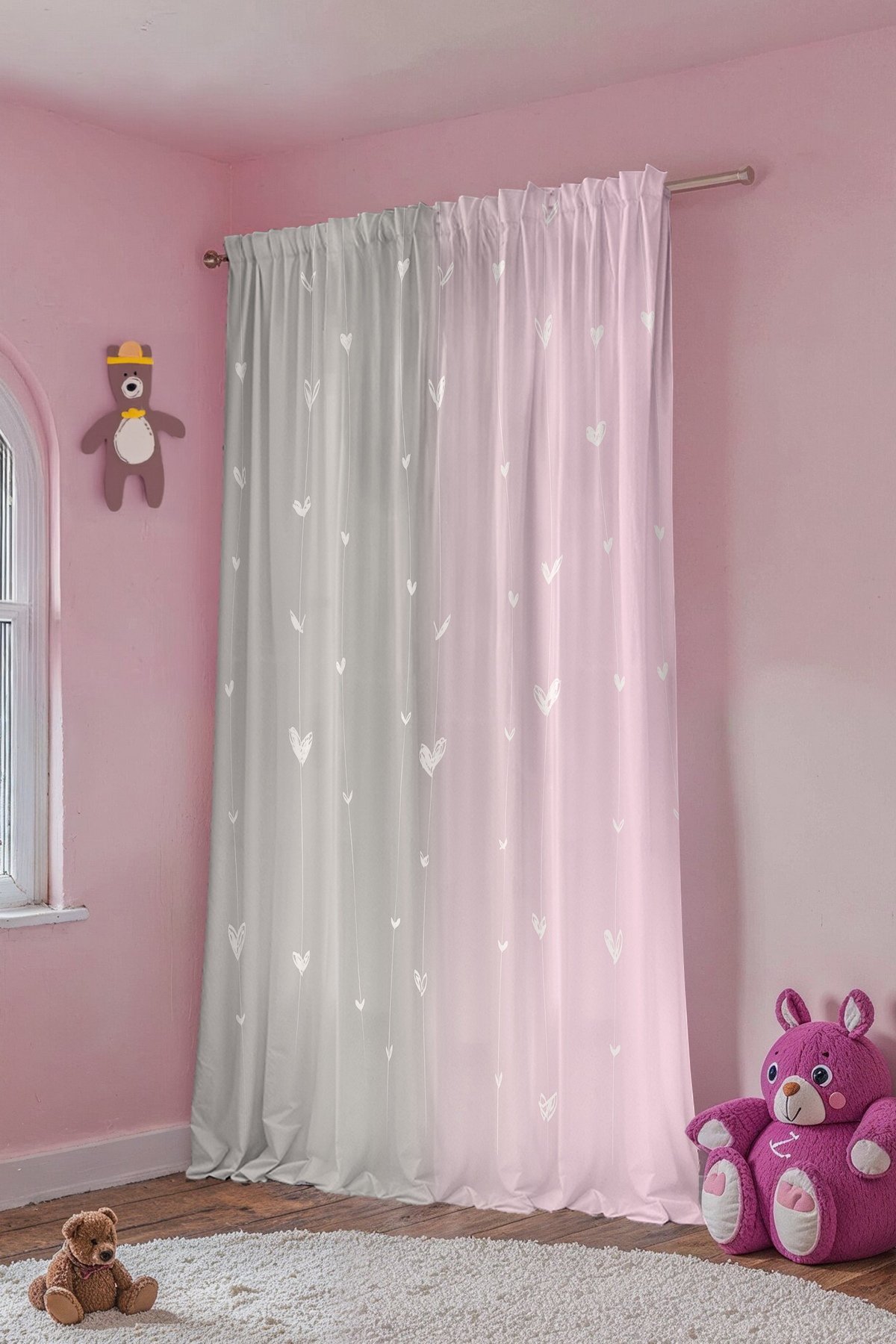 Gri Pembe Ip Kalpler Desenli Çocuk Bebek Odası Fon Perde (Tek Kanat Fiyatlandırma)
