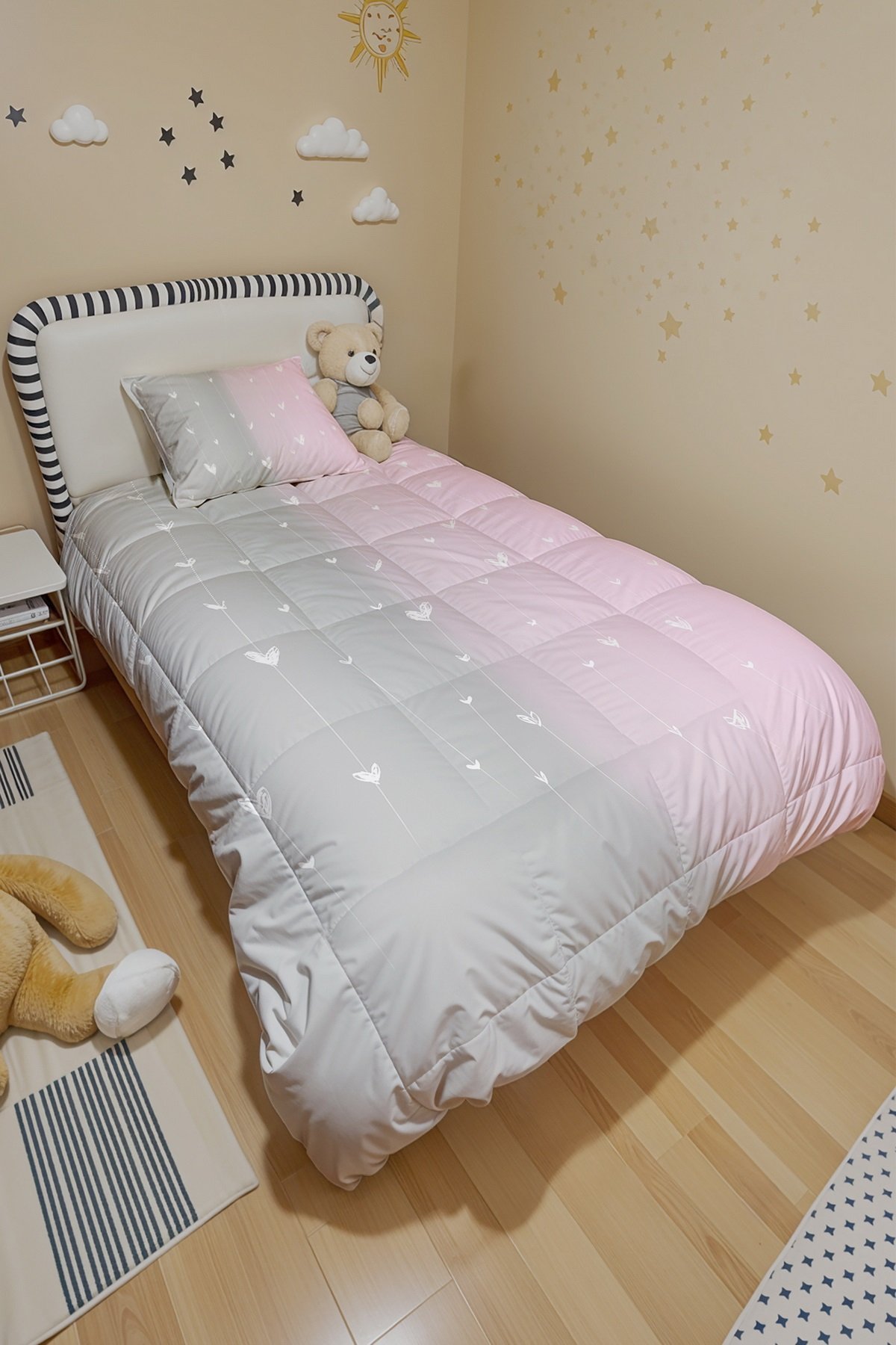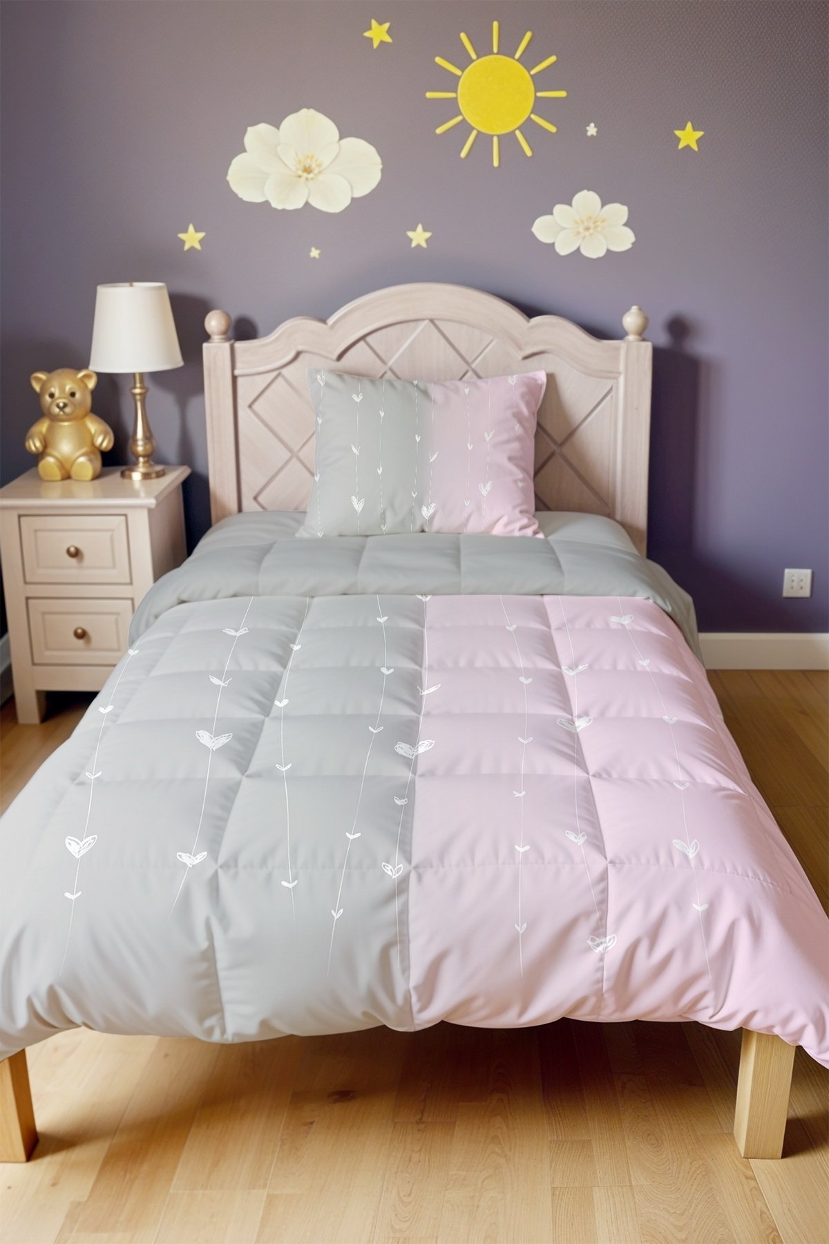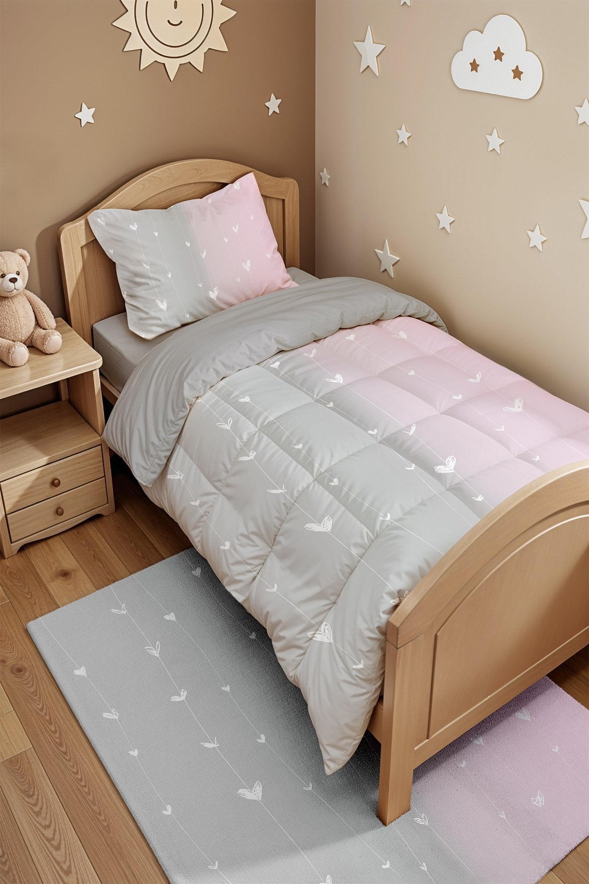 Gri Pembe Ip Kalpler Desenli Tek Kişilik Yorgan ve Yastık Kılıfı