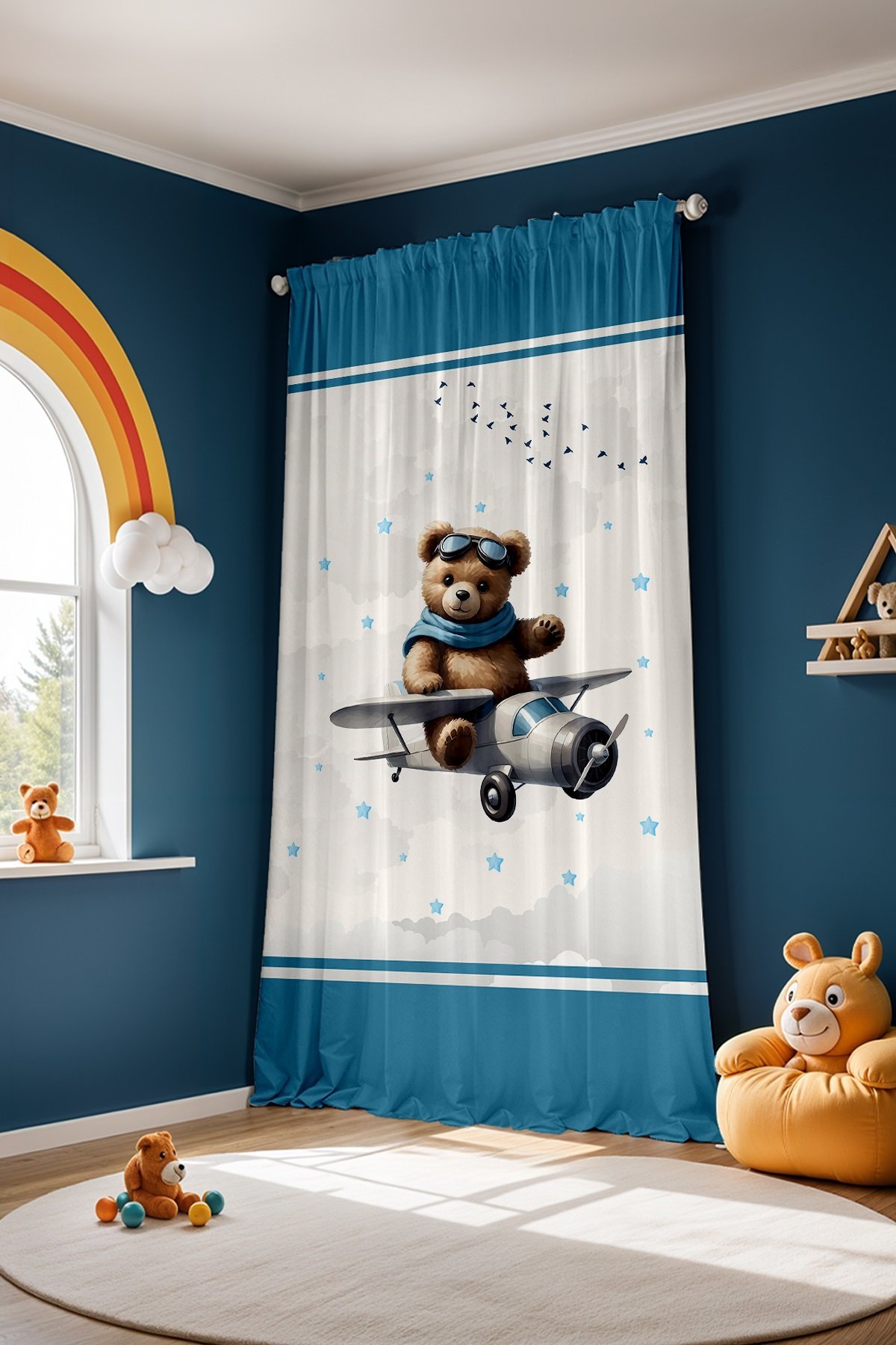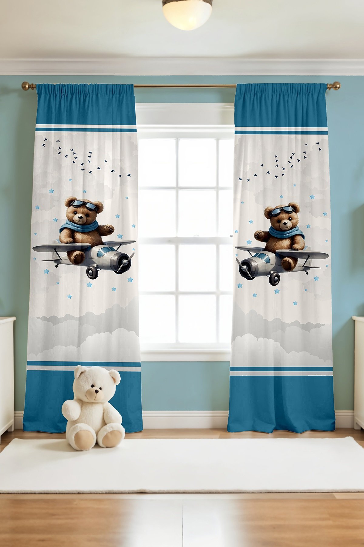 Gri Uçaklı Ayıcık Desenli Çocuk Bebek Odası Fon Perde (Tek Kanat Fiyatlandırma)