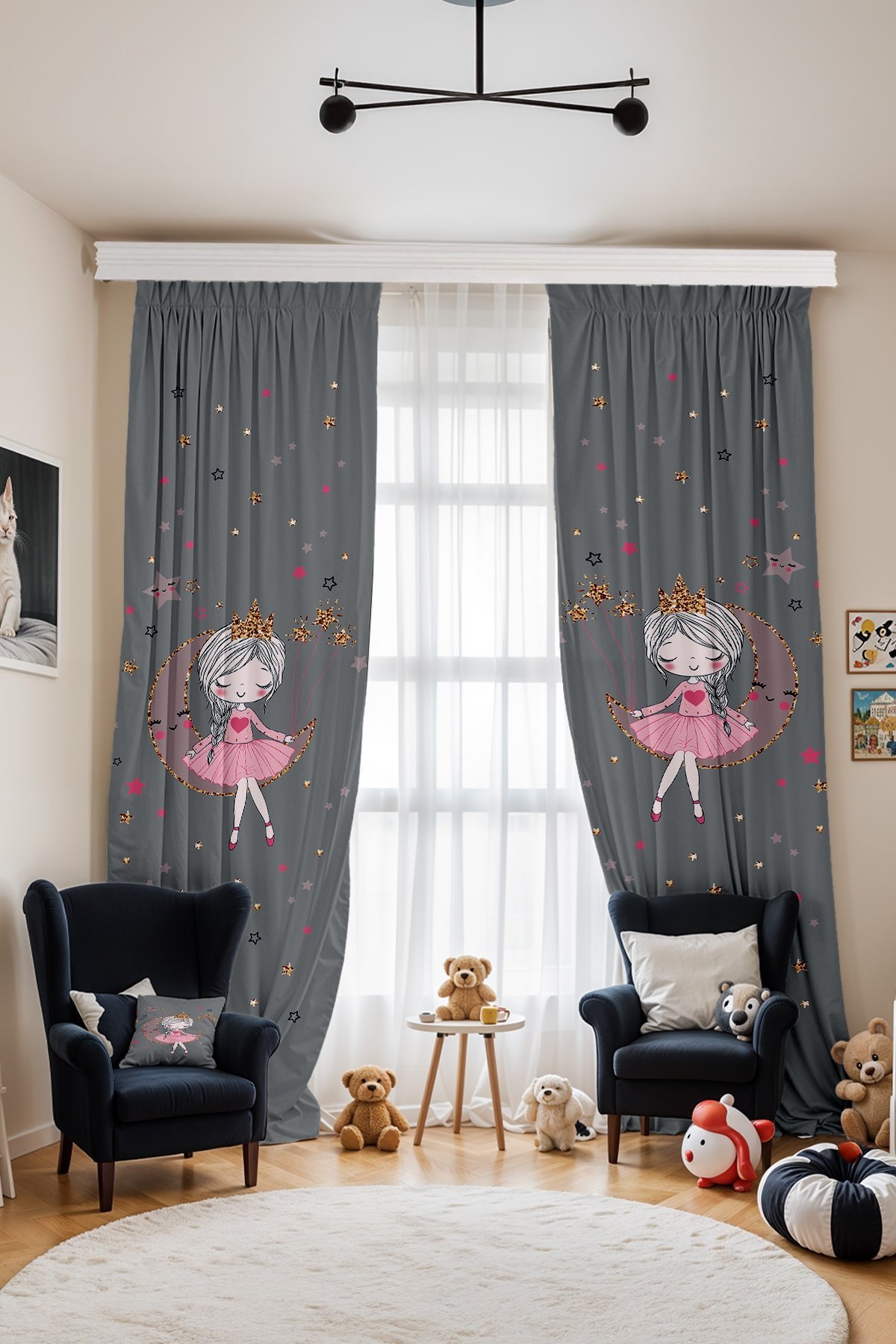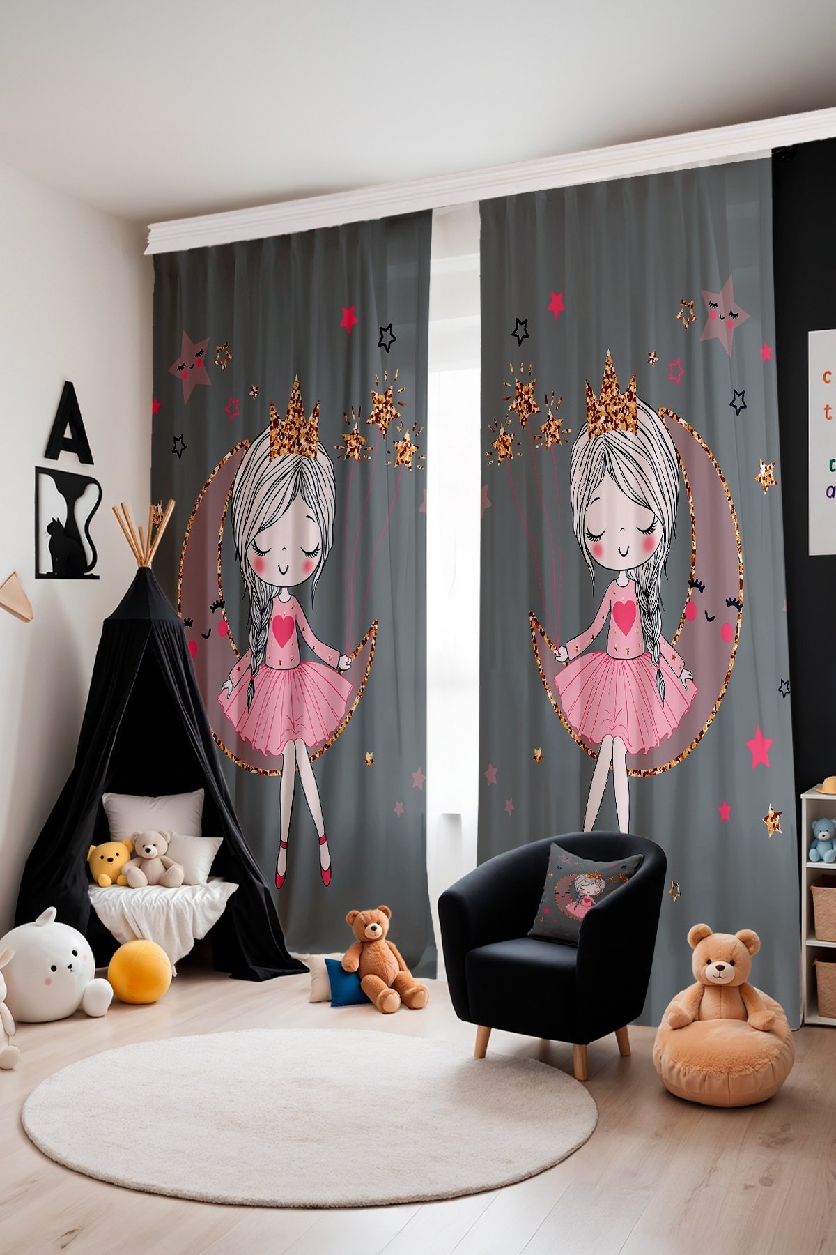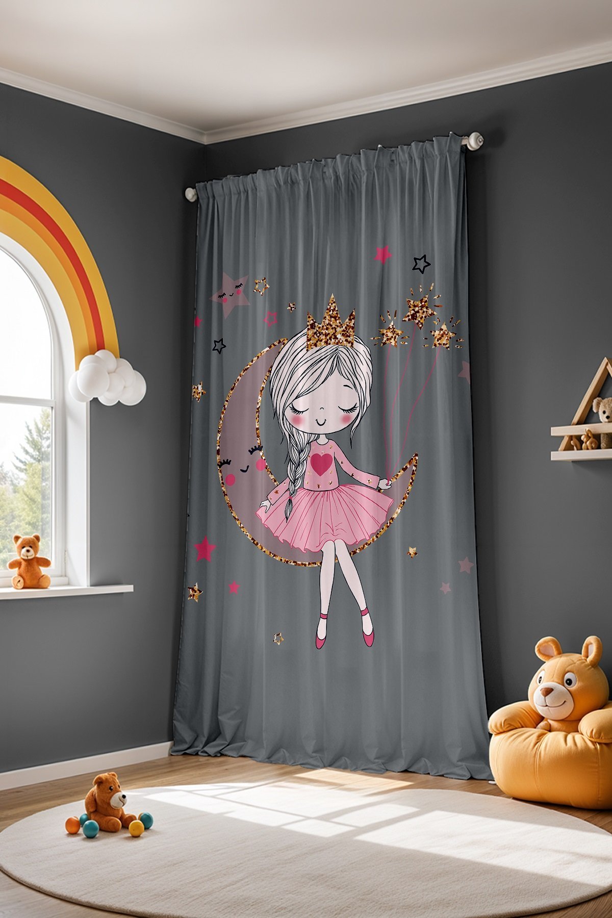 Gri Üstündeki Prenses Desenli Çocuk Bebek Odası Fon Perde (Tek Kanat Fiyatlandırma)