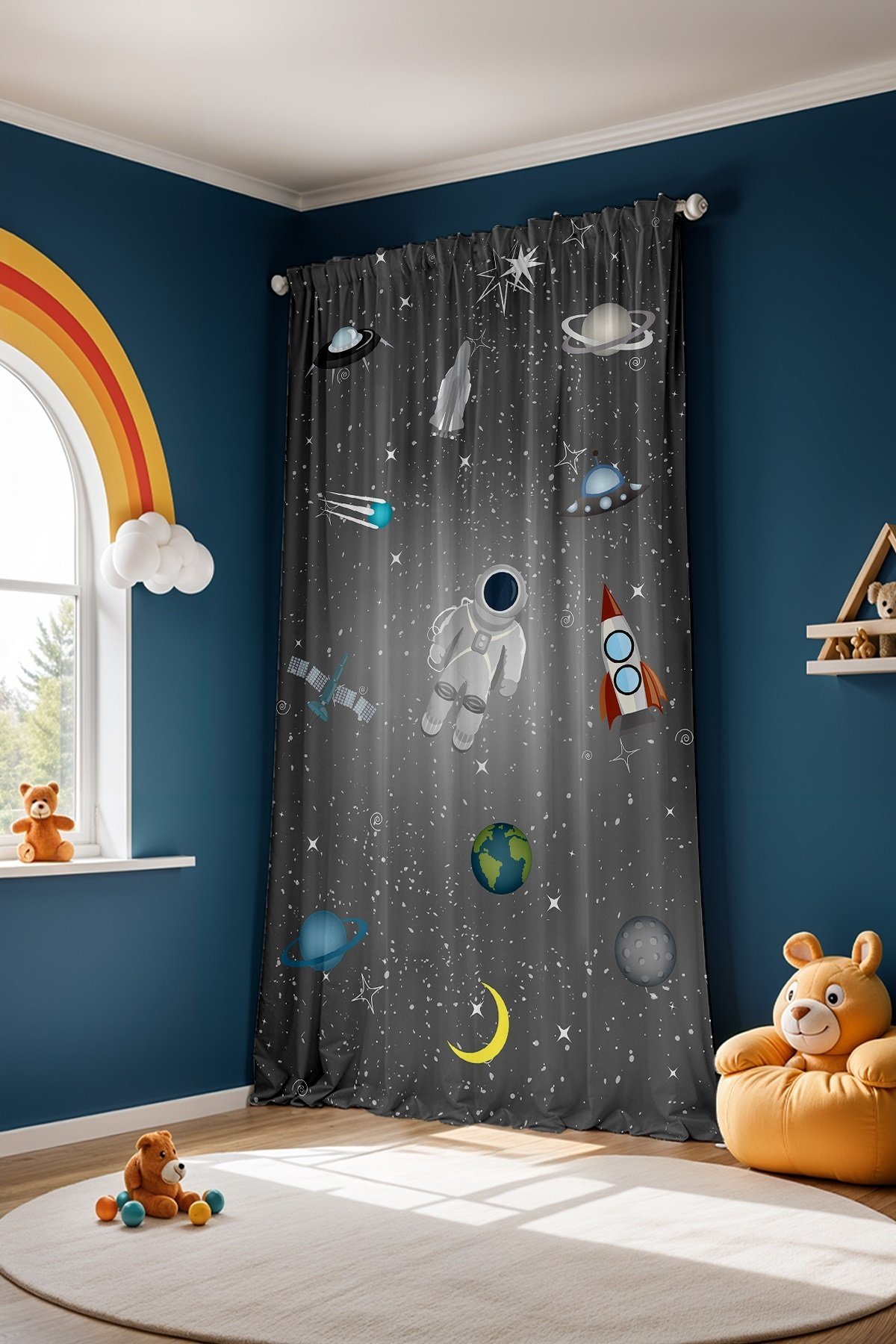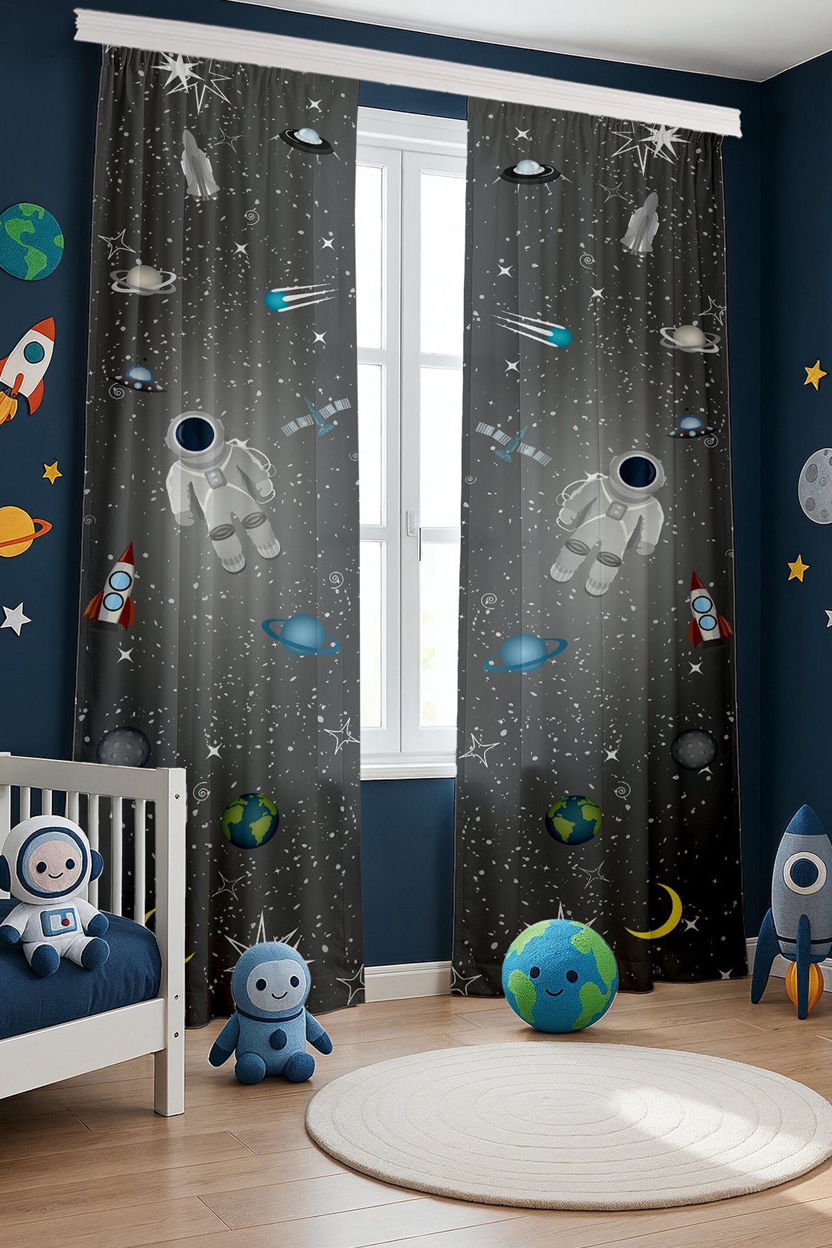 Gri Uzay Küçük Astronot Desenli Çocuk Bebek Odası Fon Perde (Tek Kanat Fiyatlandırma)