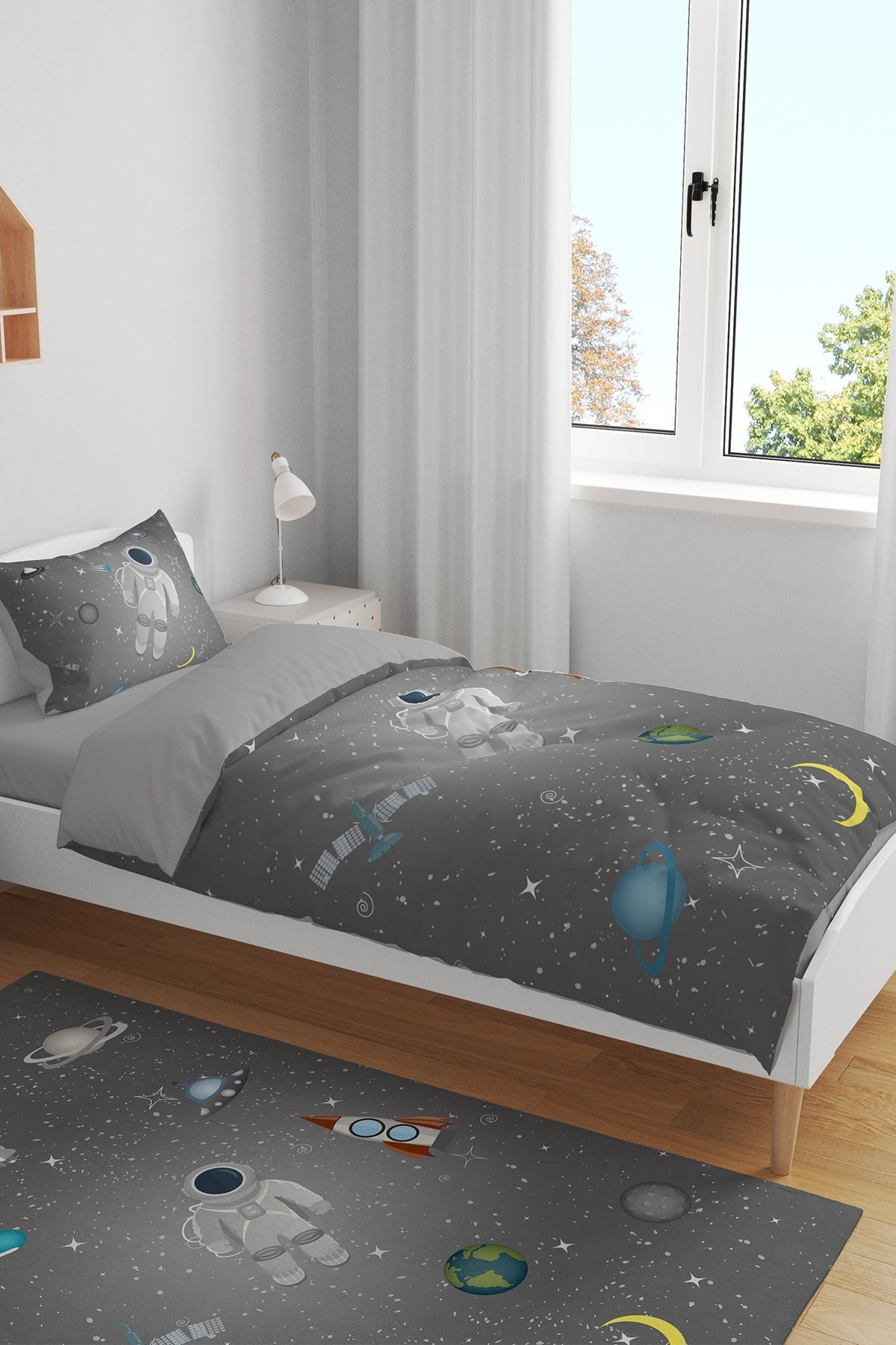 Gri Uzay Küçük Astronot Desenli Tek Kişilik Bebek Çocuk Nevresim Seti