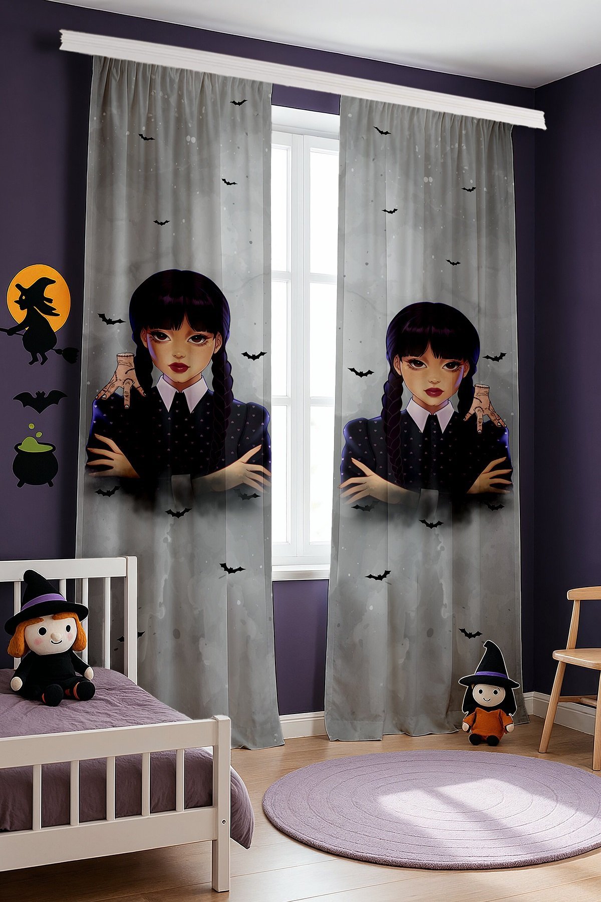 Gri Wednesday Addams Desenli Çocuk Bebek Odası Fon Perde (Tek Kanat Fiyatlandırma)