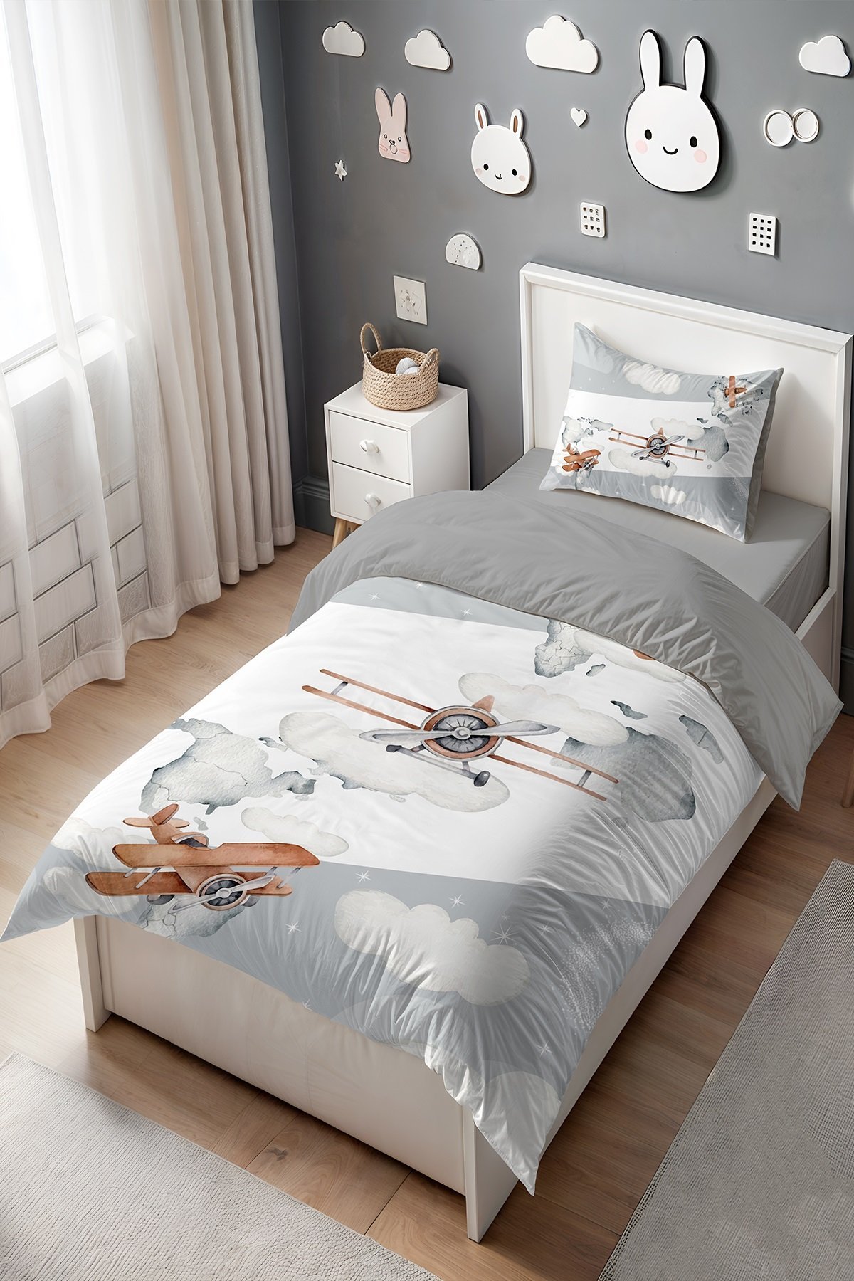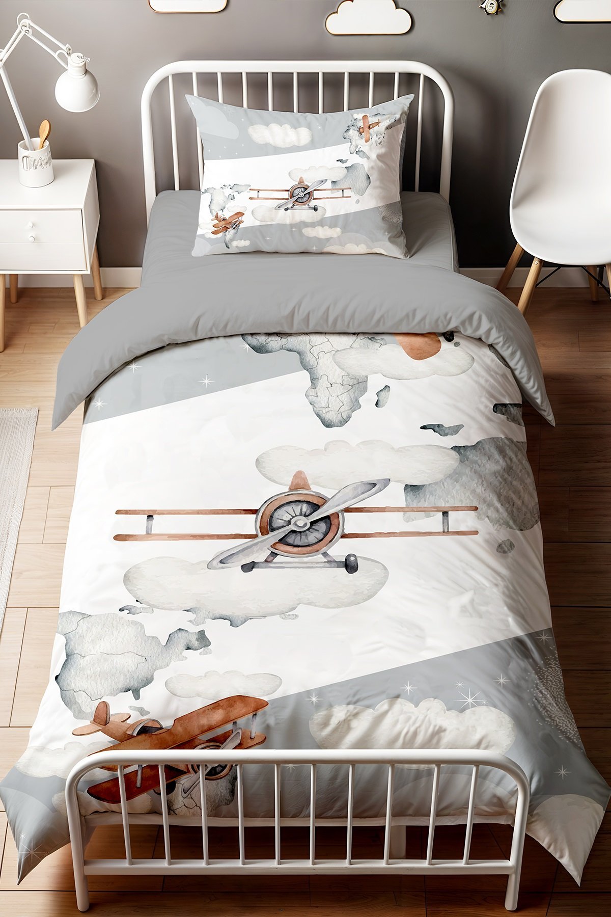 Gri Yan Şeritli Uçaklar Desenli Tek Kişilik Bebek Çocuk Nevresim Seti