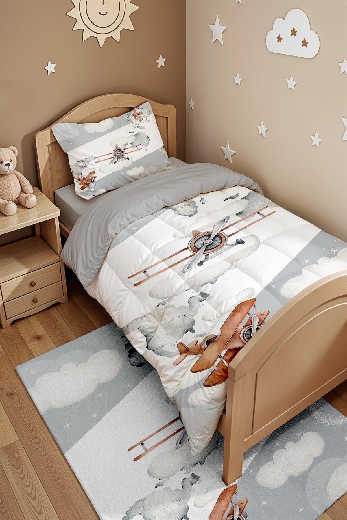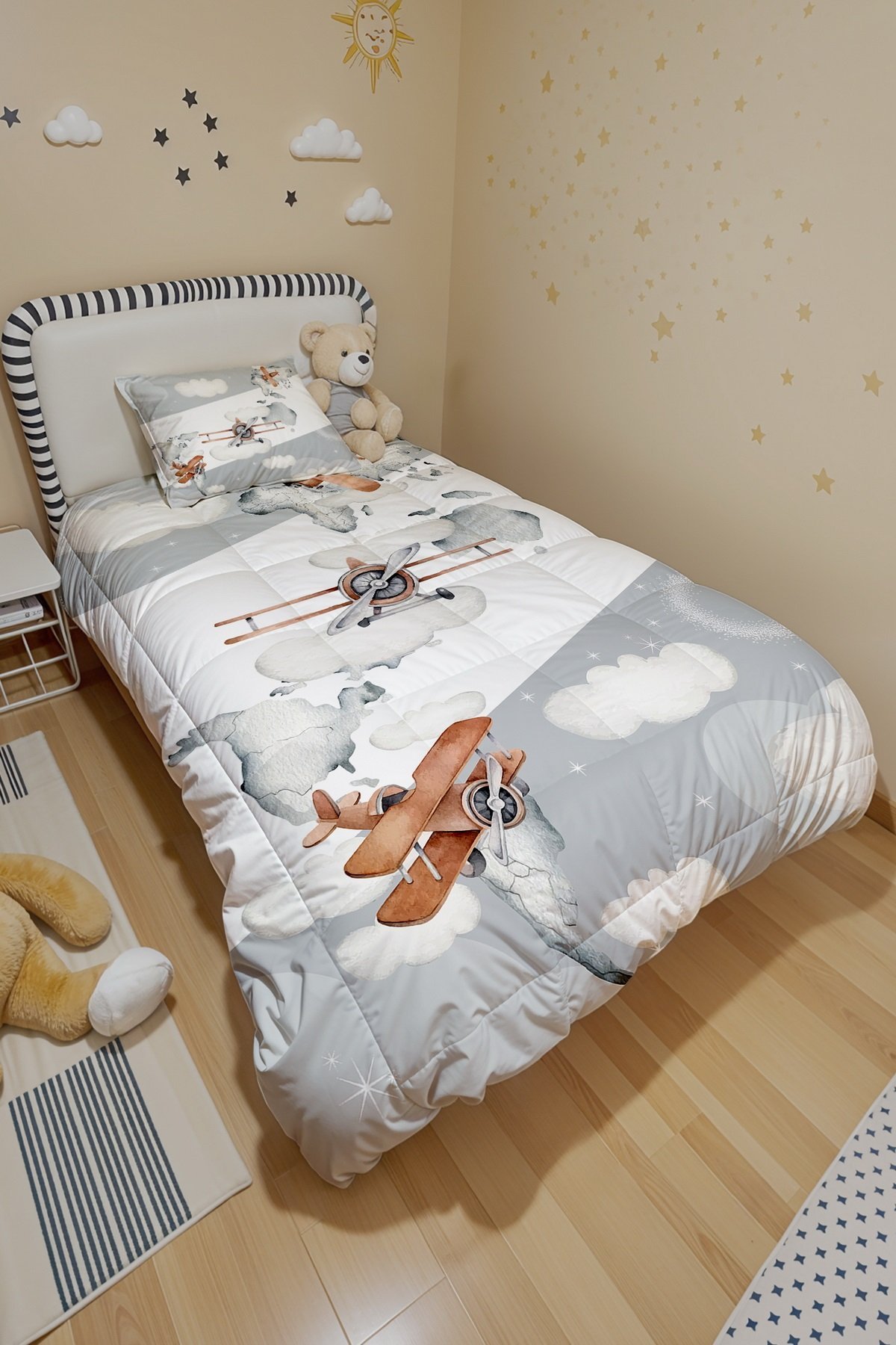 Gri Yan Şeritli Uçaklar Desenli Tek Kişilik Yorgan ve Yastık Kılıfı