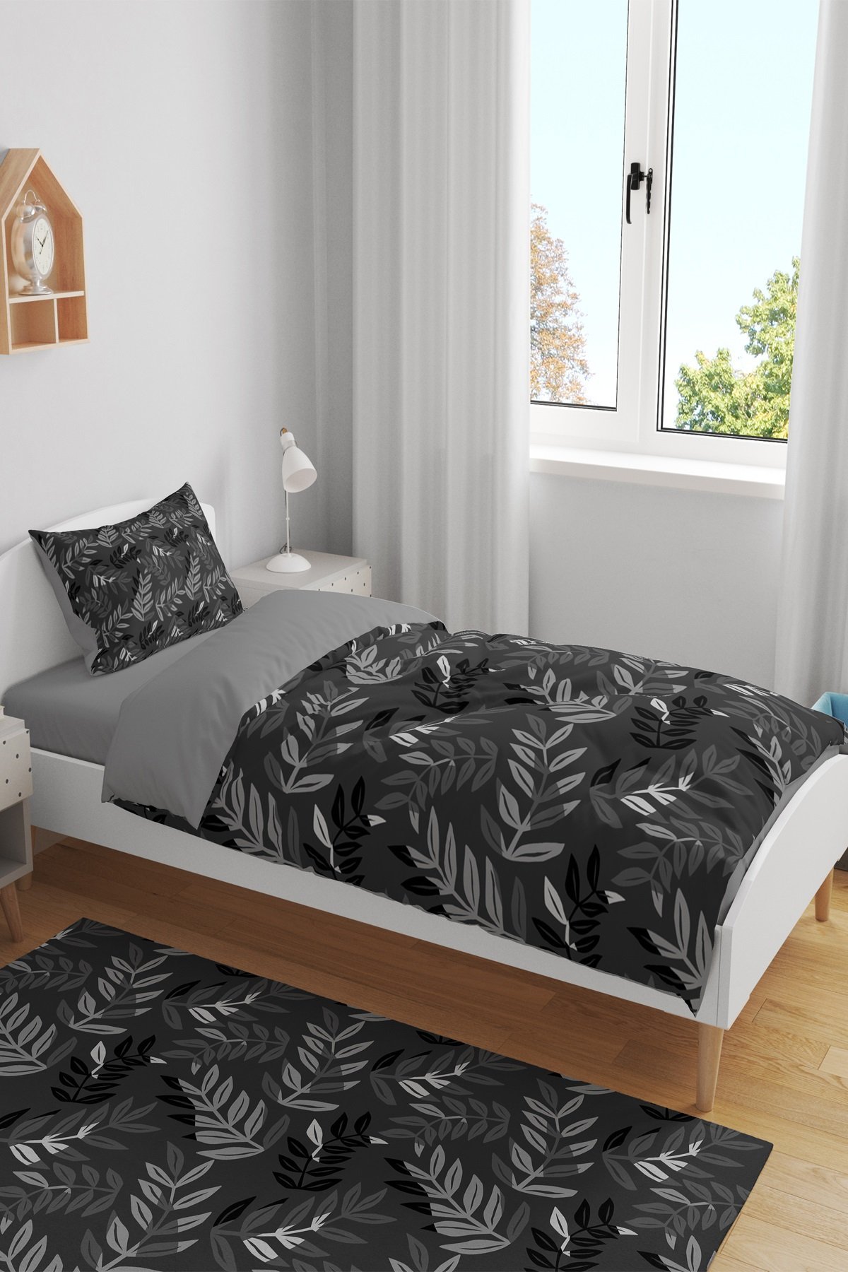 Gri Yapraklar Desenli Tek Kişilik Bebek Çocuk Nevresim Takımı