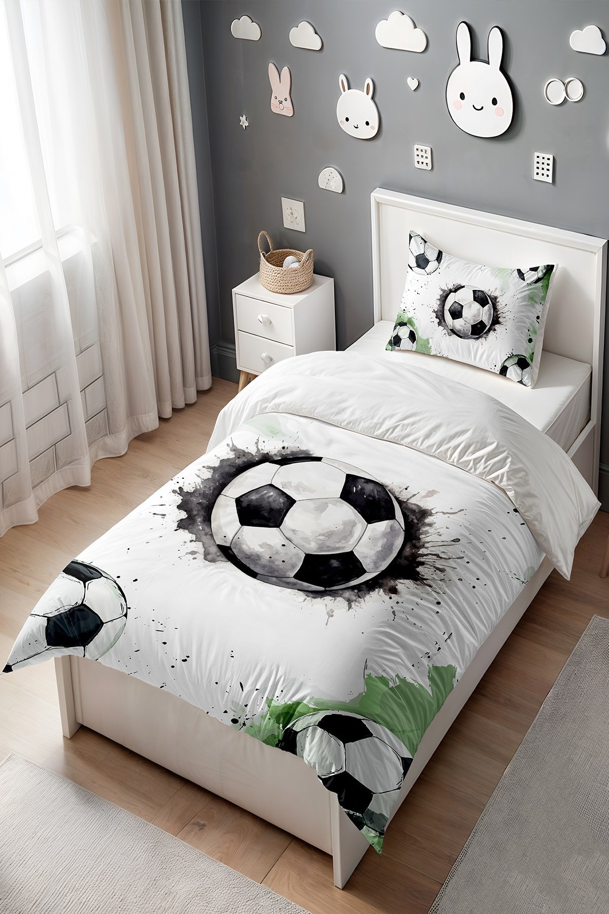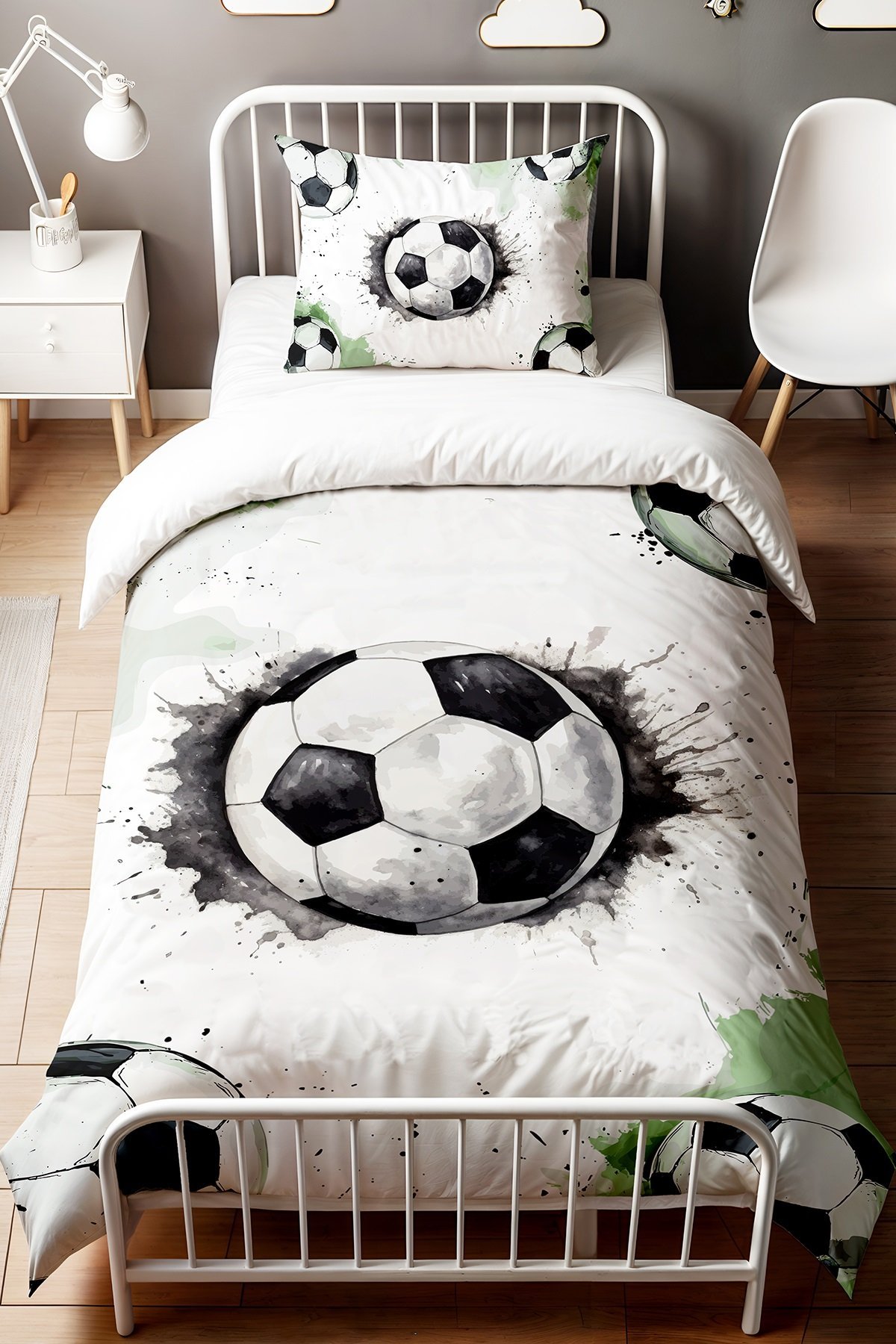 Gri Yeşil Futbol Topları Desenli Tek Kişilik Bebek Çocuk Nevresim Seti