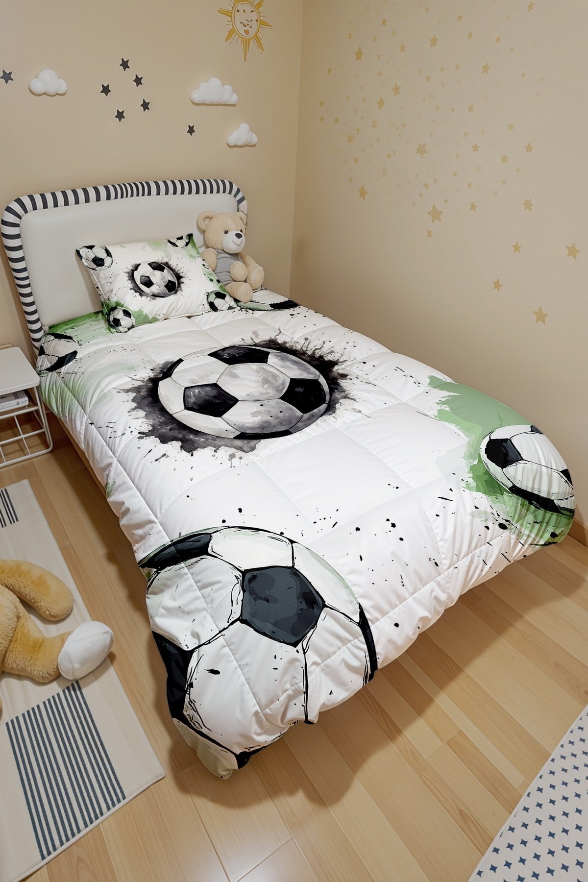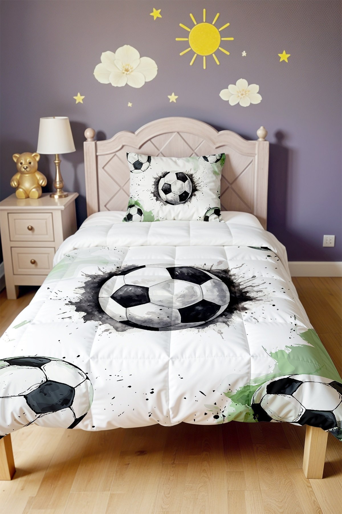 Gri Yeşil Futbol Topları Desenli Tek Kişilik Yorgan ve Yastık Kılıfı
