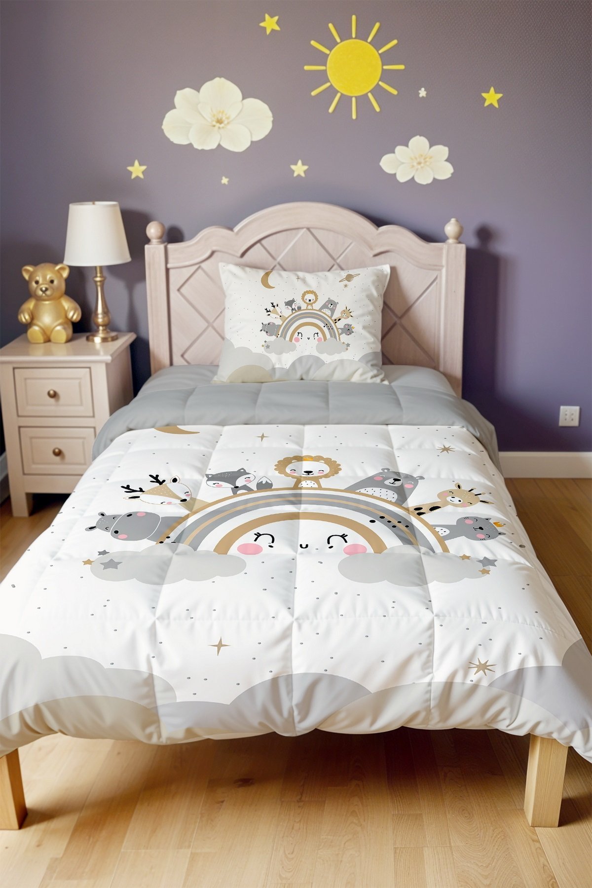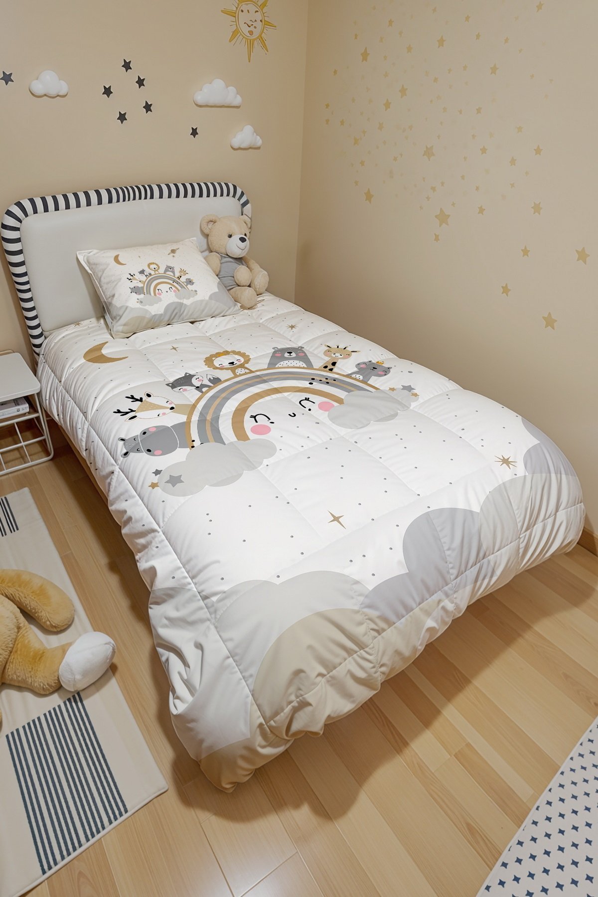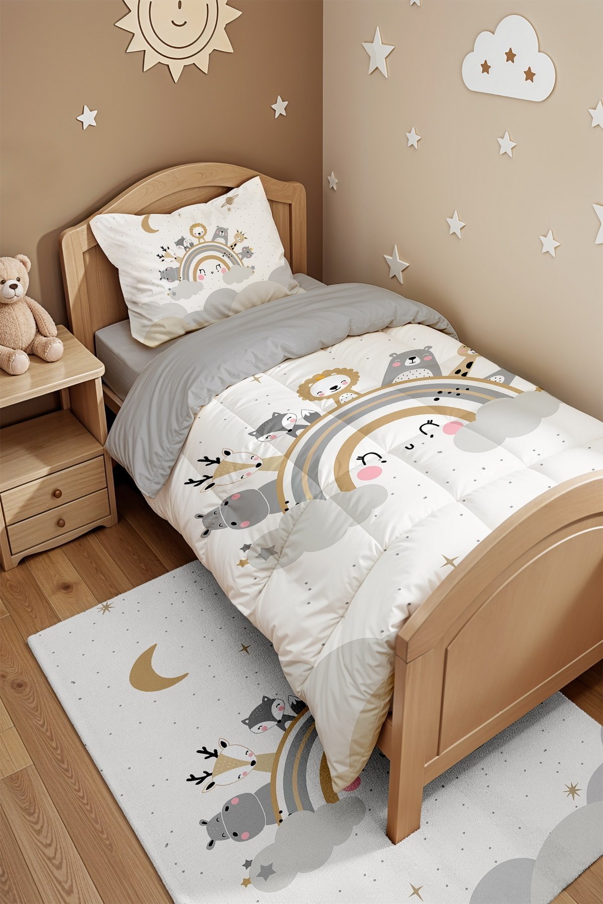 Gülen Gökkuşağı Safari Desenli Tek Kişilik Yorgan ve Yastık Kılıfı