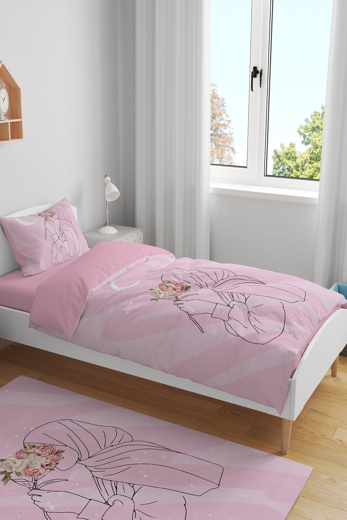 Güllü Kız Silüeti Desenli Tek Kişilik Bebek Çocuk Nevresim Seti