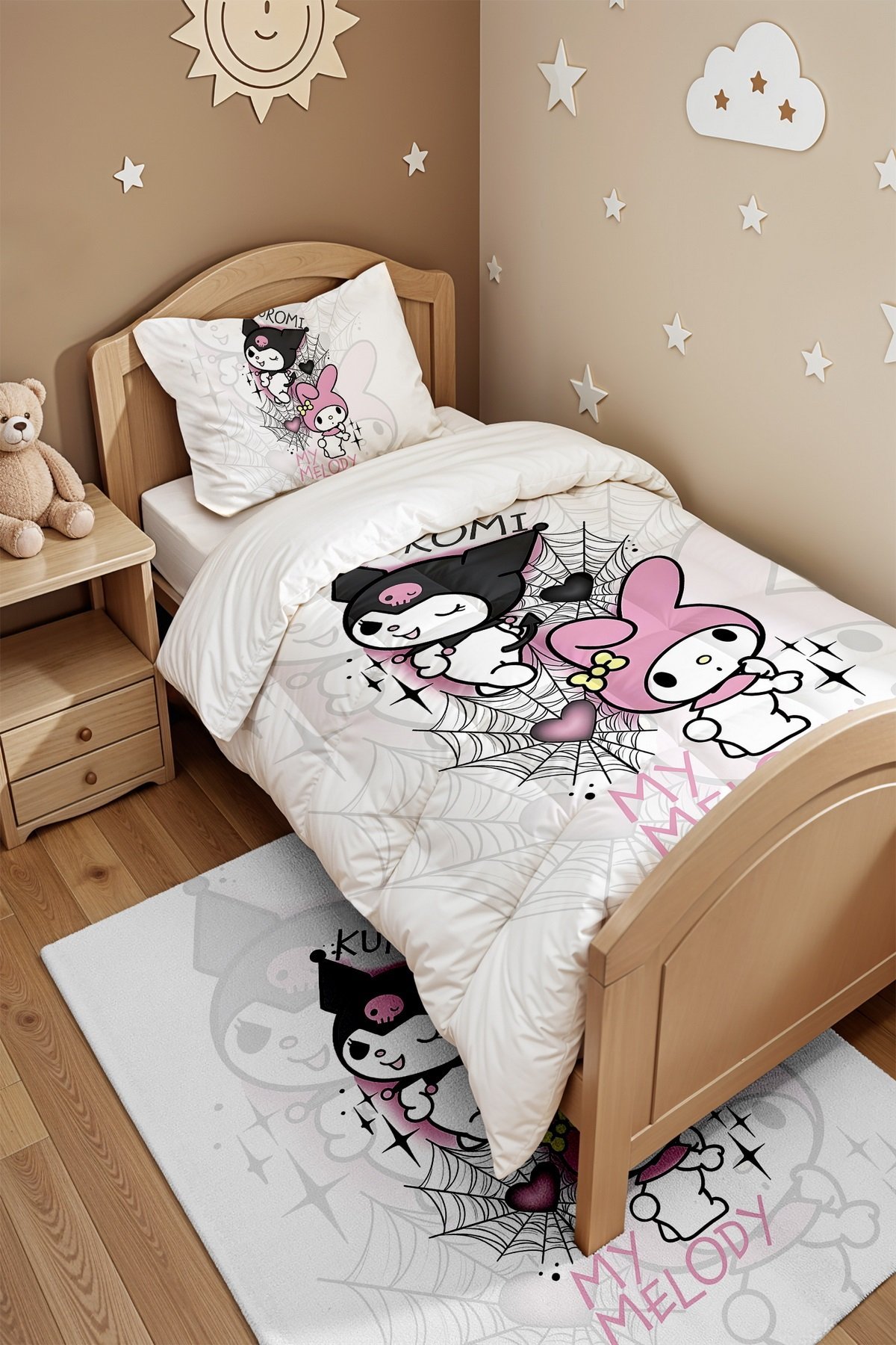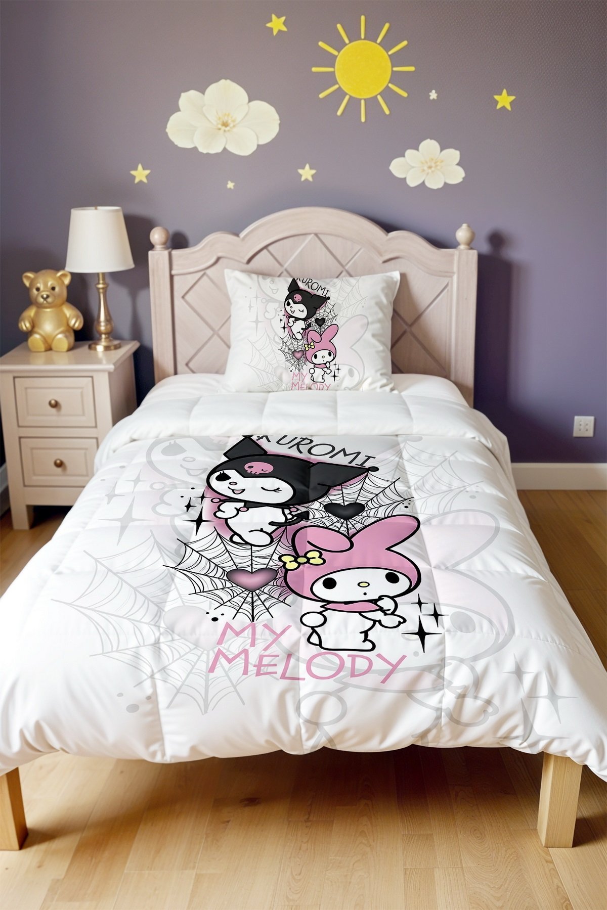 Havalı Kuromi ve Şaşkın My Melody Desenli Tek Kişilik Yorgan ve Yastık Kılıfı