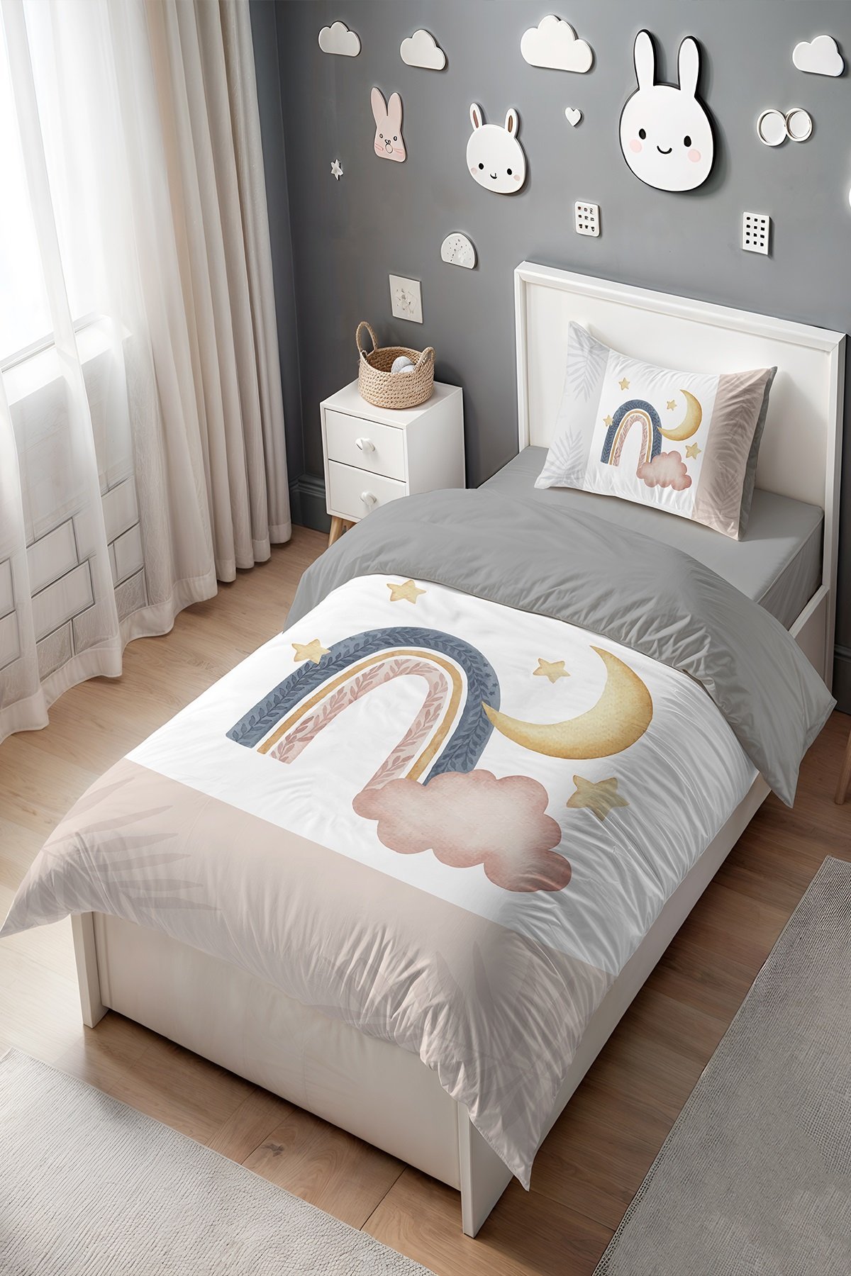 Hilal-Yıldız Gökkuşağı Desenli Tek Kişilik Bebek Çocuk Nevresim Seti