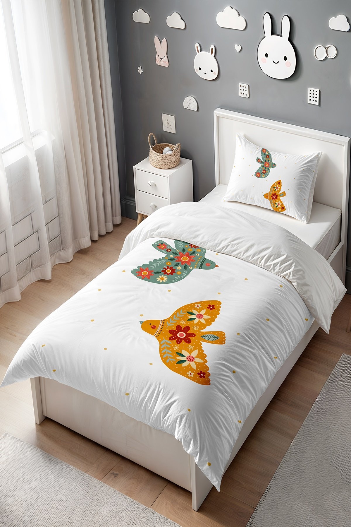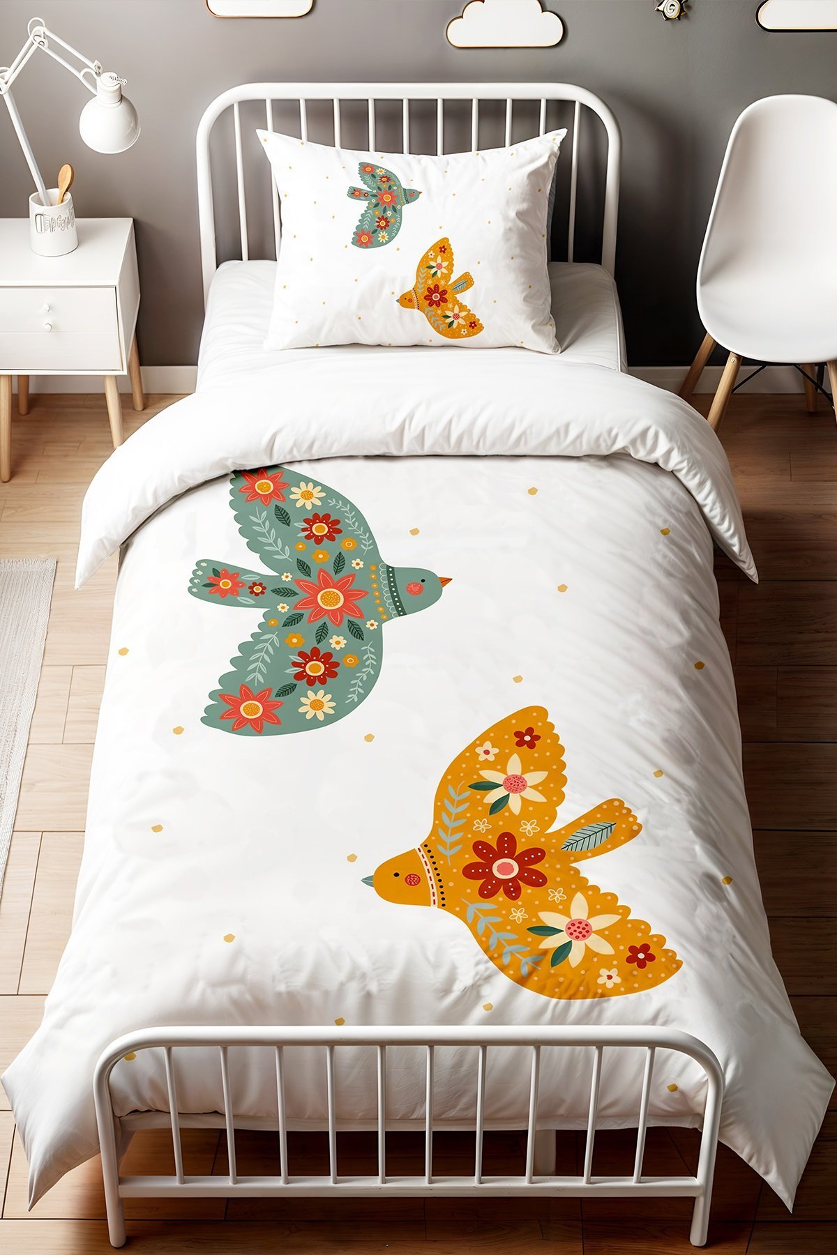 İşlemeli Kuşlar Desenli Tek Kişilik Bebek Çocuk Nevresim Seti