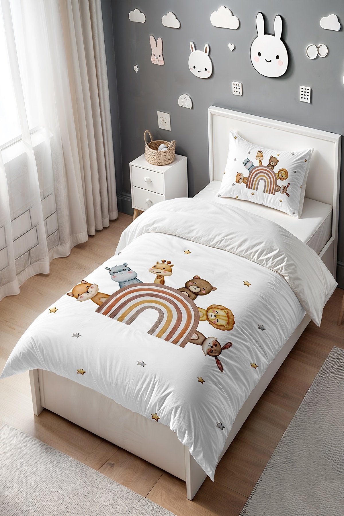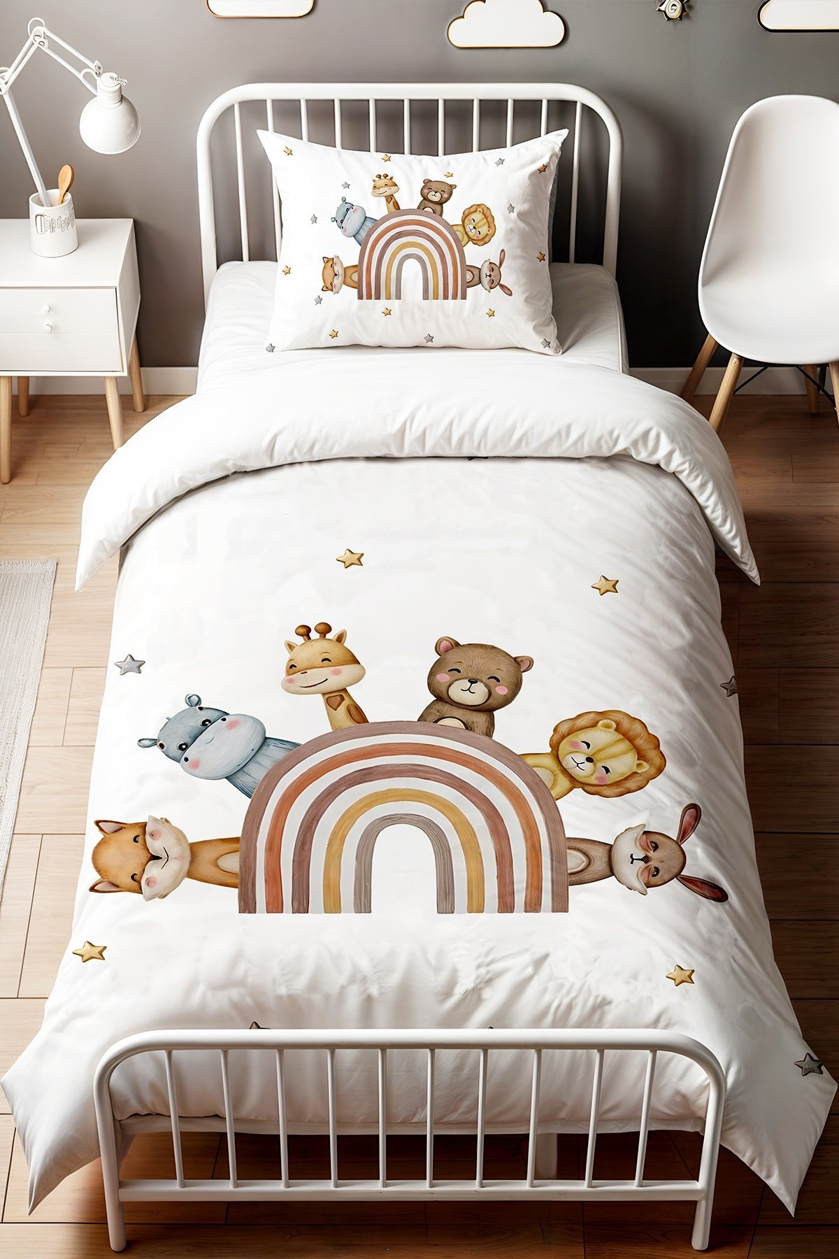 Kahveli Gökkuşağı Safari Desenli Tek Kişilik Bebek Çocuk Nevresim Seti
