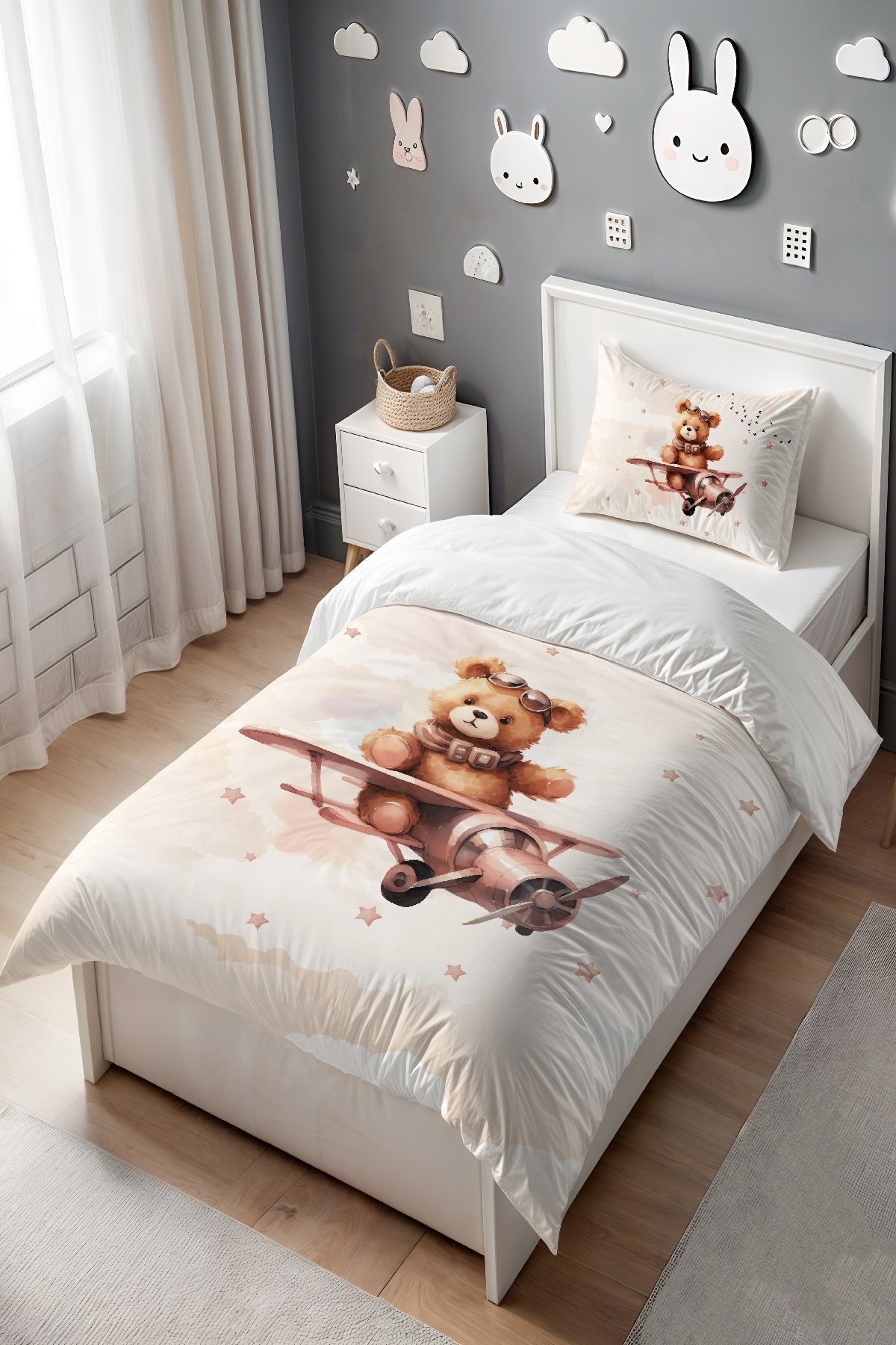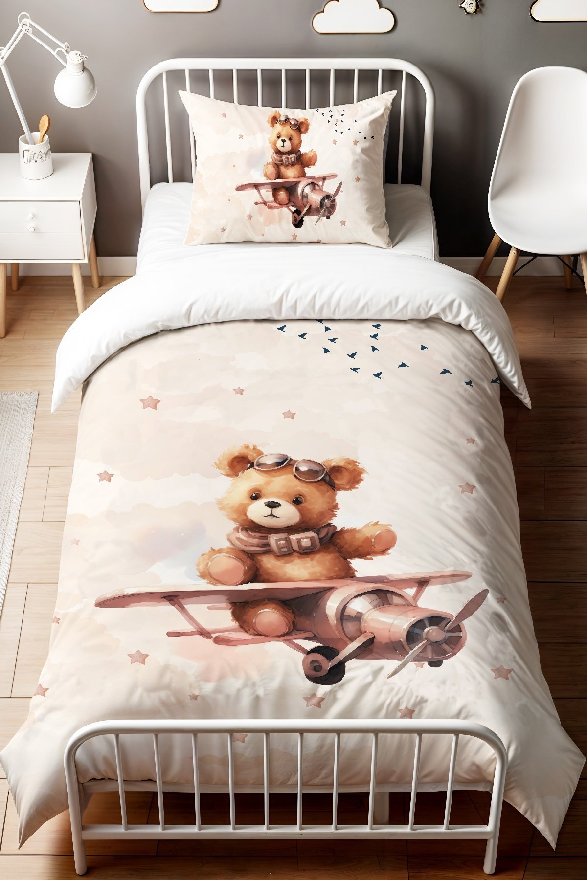Kahverengi Pilot Ayıcık Desenli Tek Kişilik Bebek Çocuk Nevresim Seti