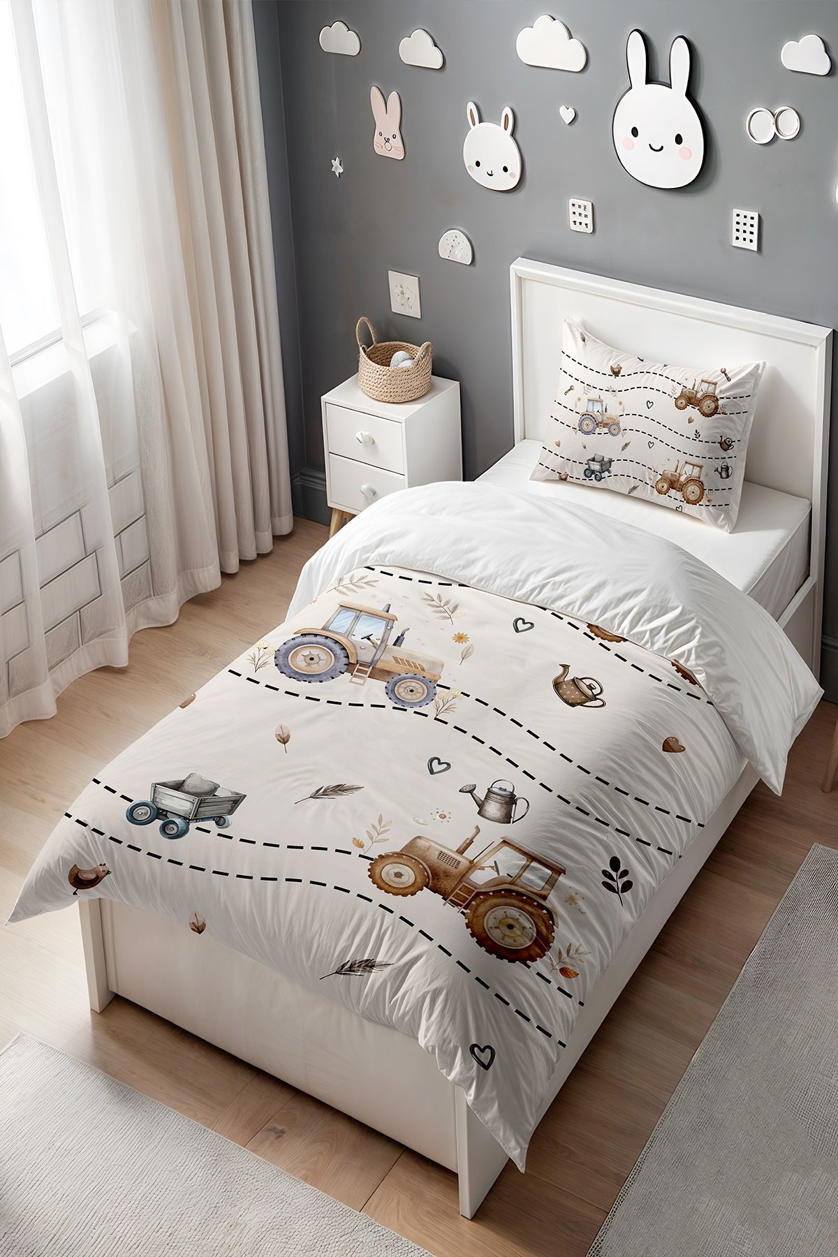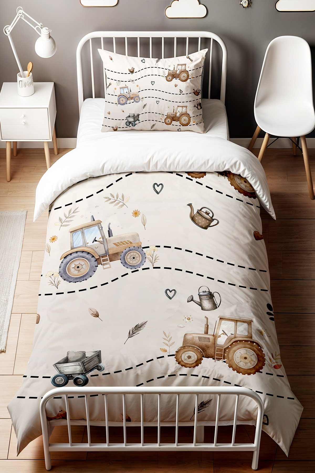 Kahverengi Traktör Desenli Tek Kişilik Bebek Çocuk Nevresim Seti