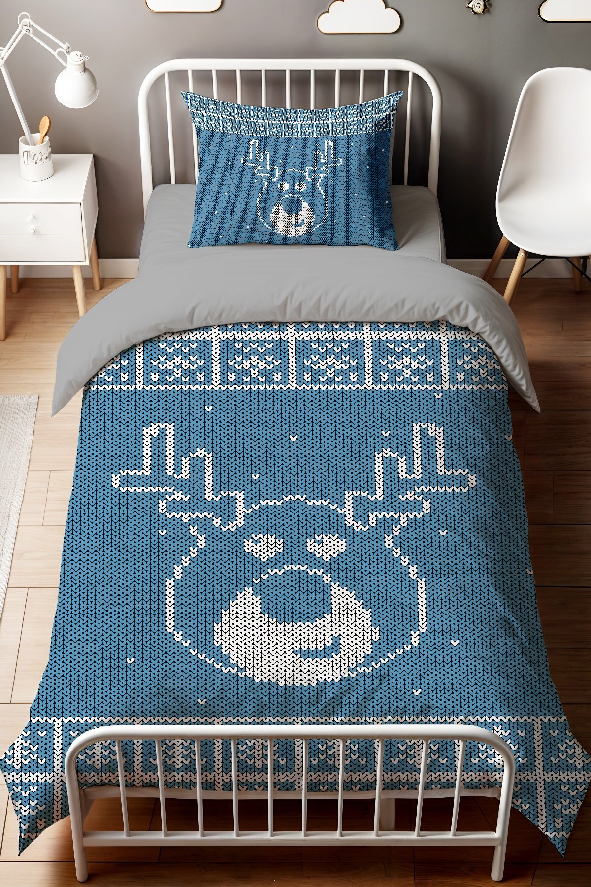 Kanaviçe Mavi Geyik Desenli Tek Kişilik Bebek Çocuk Nevresim Seti