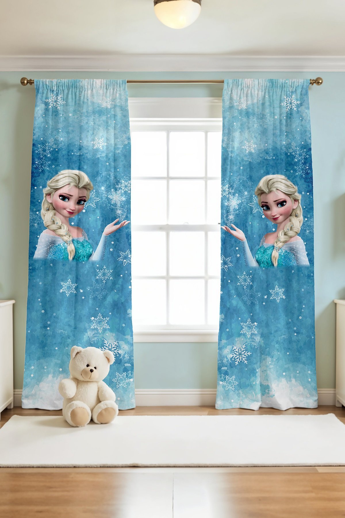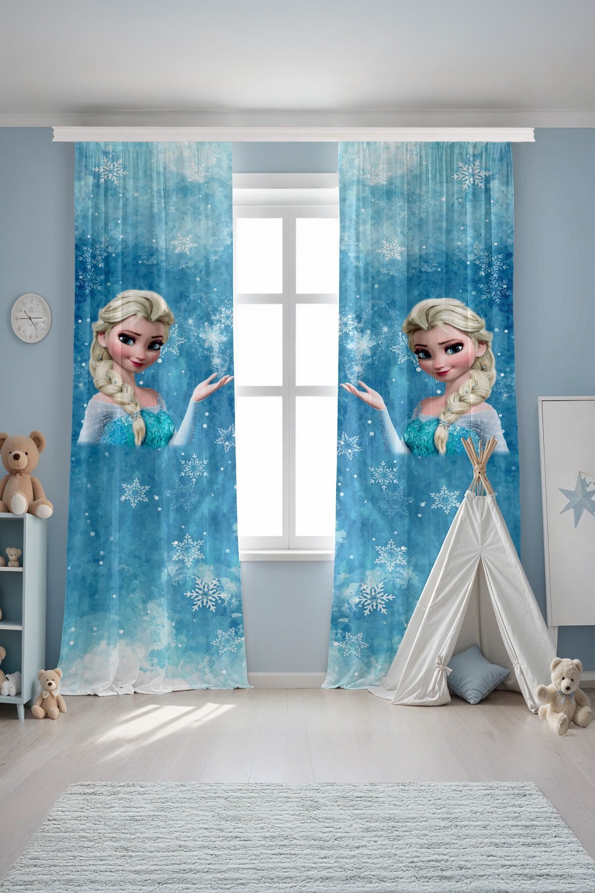Kartaneli Mavi Elsa Desenli Çocuk Bebek Odası Fon Perde (Tek Kanat Fiyatlandırma)