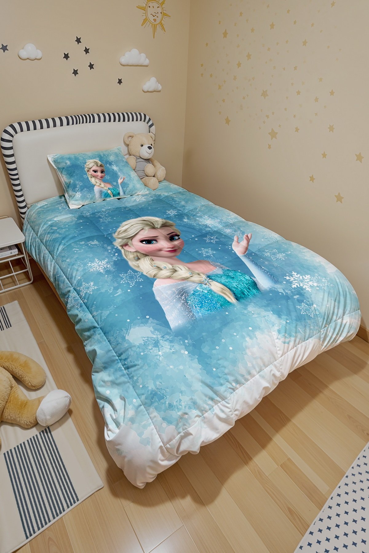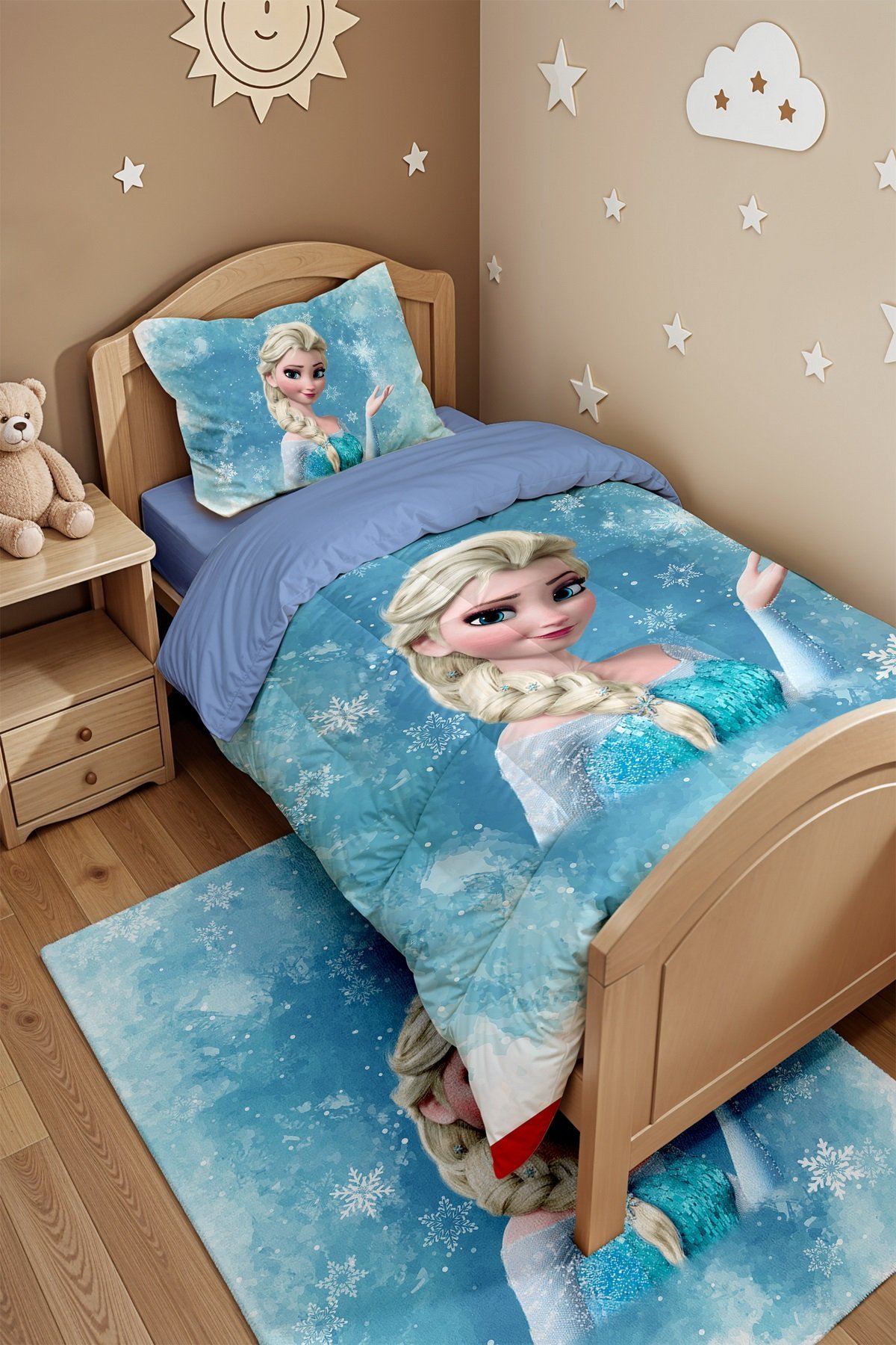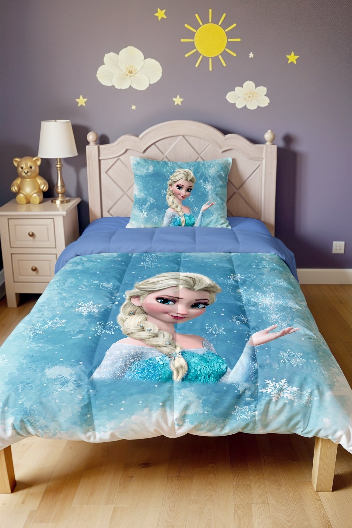 Kartaneli Mavi Elsa Desenli Tek Kişilik Yorgan ve Yastık Kılıfı