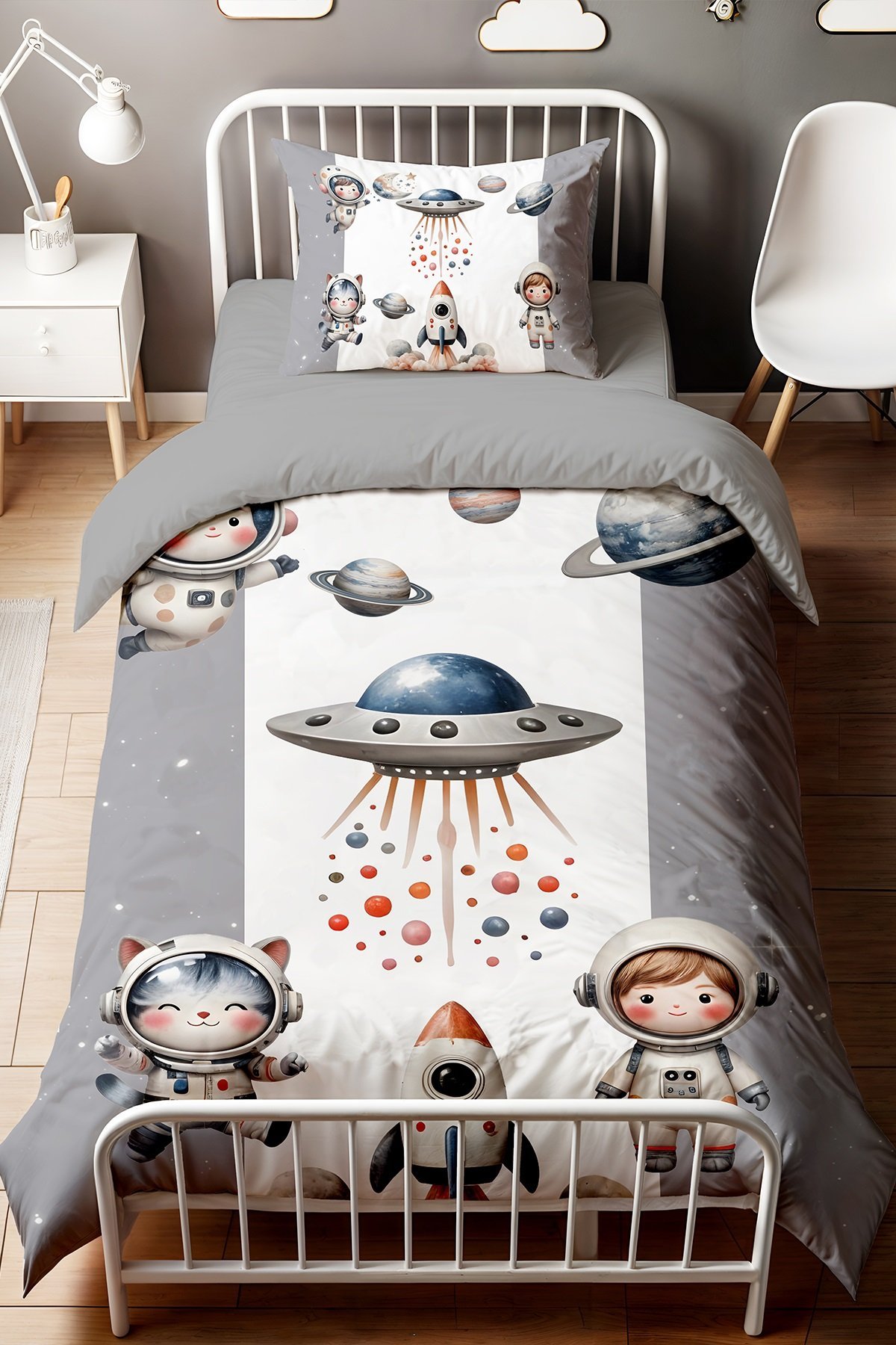 Kedi ve Çocuk Astronot Uzay Desenli Tek Kişilik Bebek Çocuk Nevresim Seti
