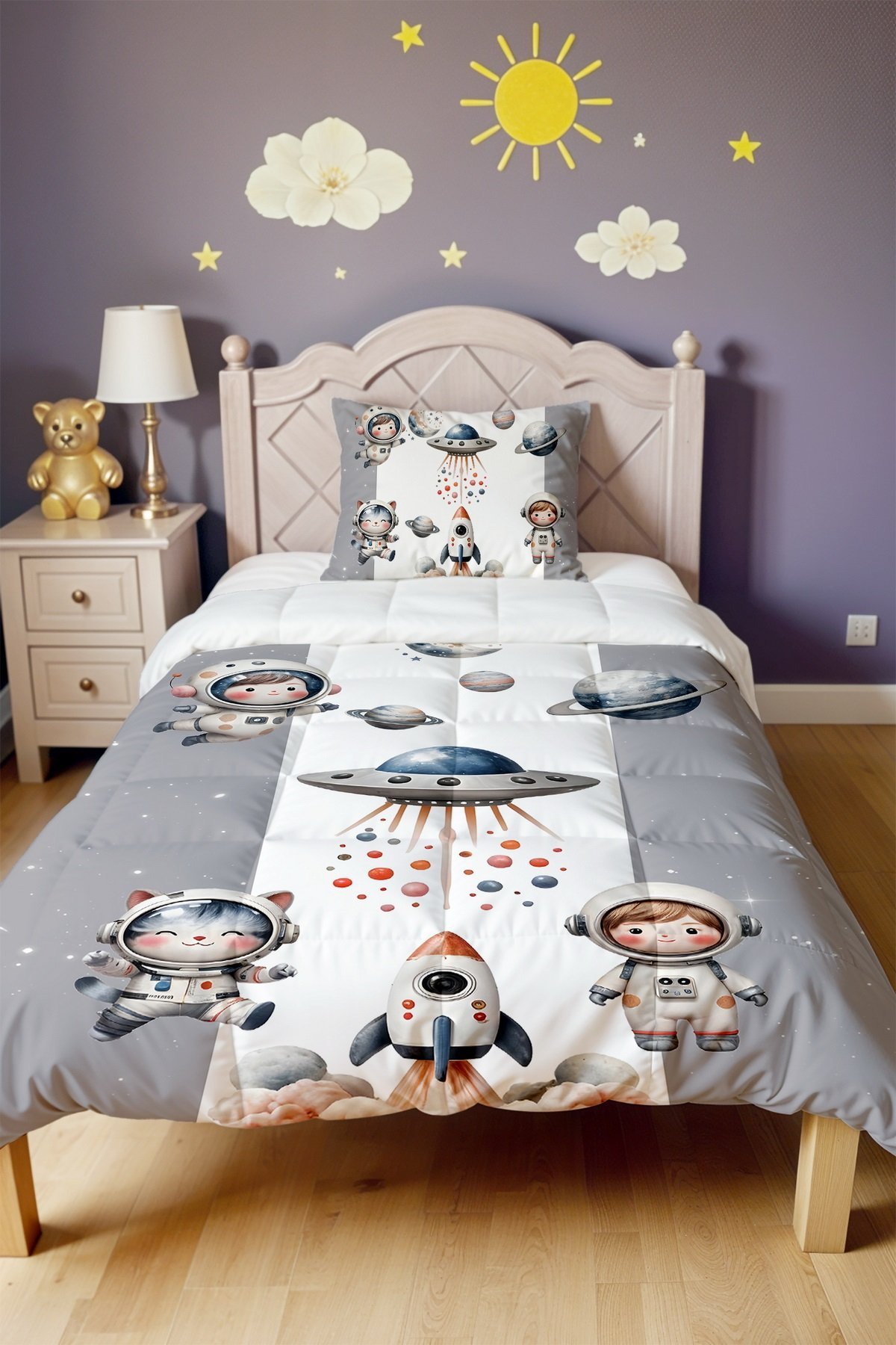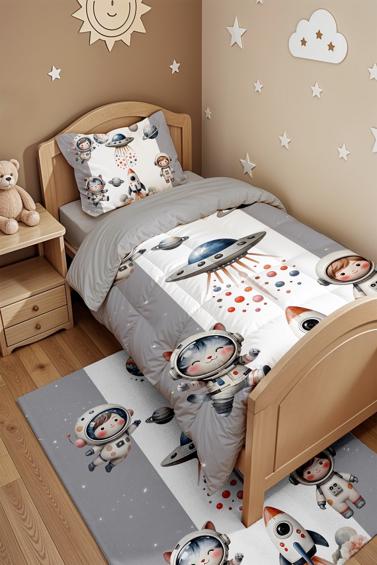 Kedi ve Çocuk Astronot Uzay Desenli