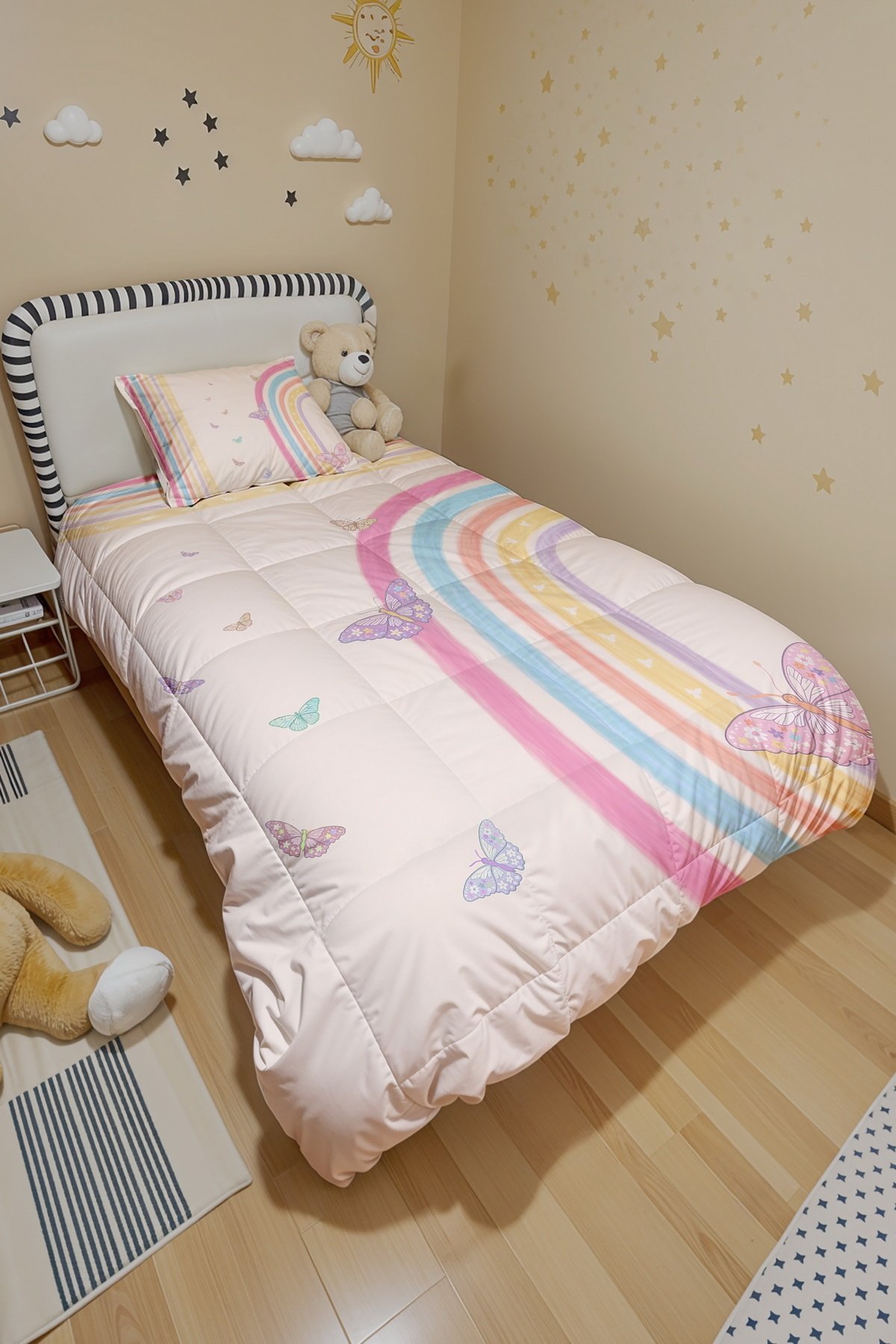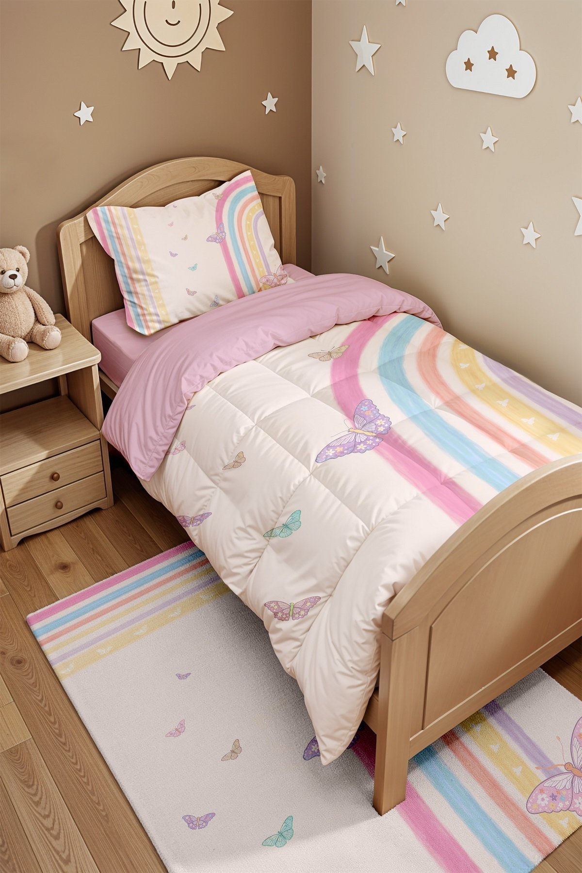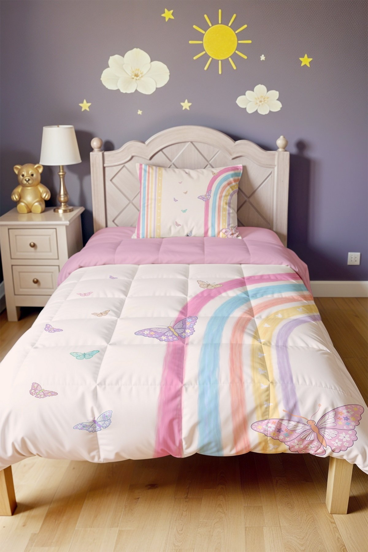 Kelebekli Gökkuşağı Desenli Tek Kişilik Yorgan ve Yastık Kılıfı