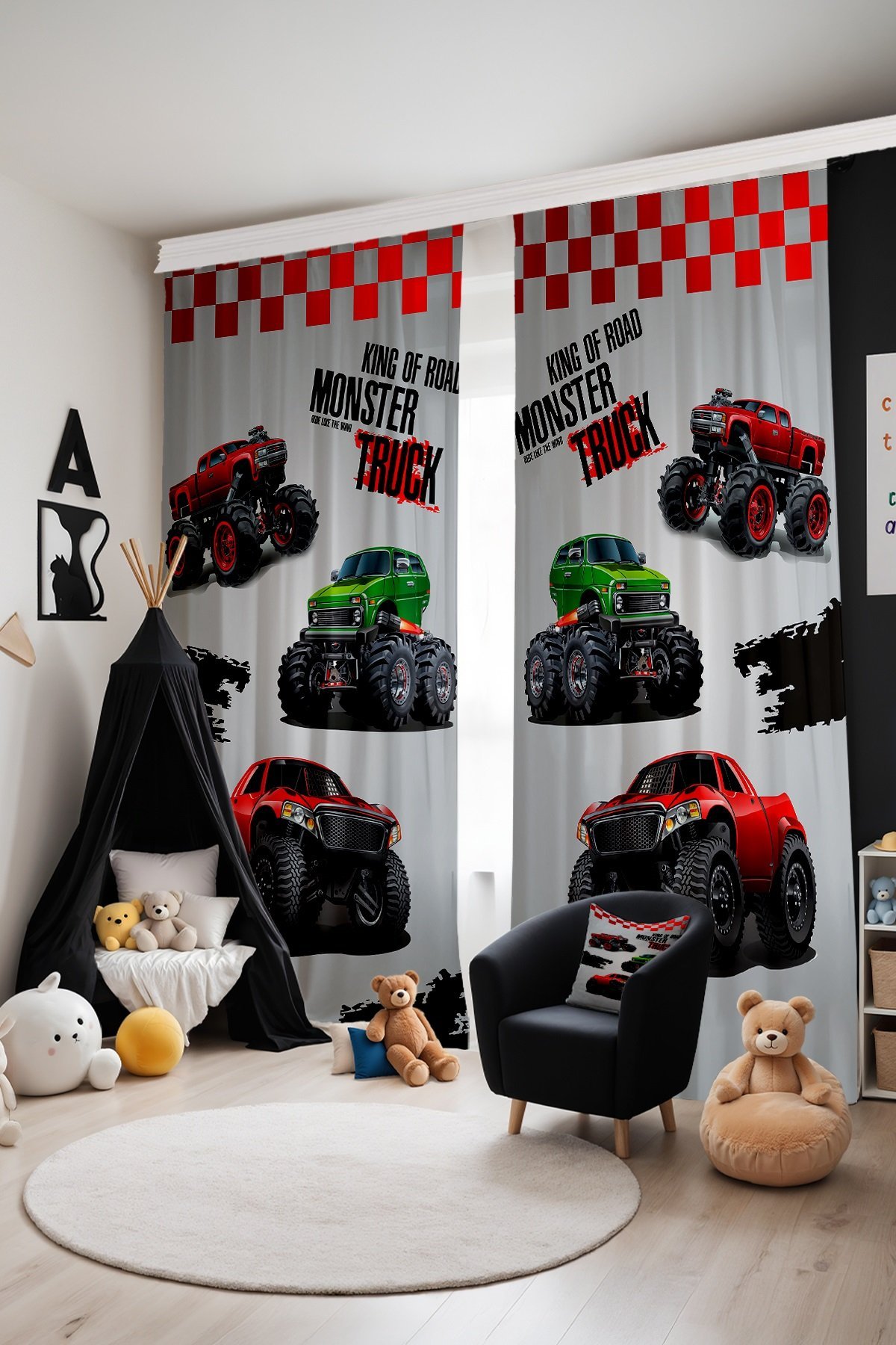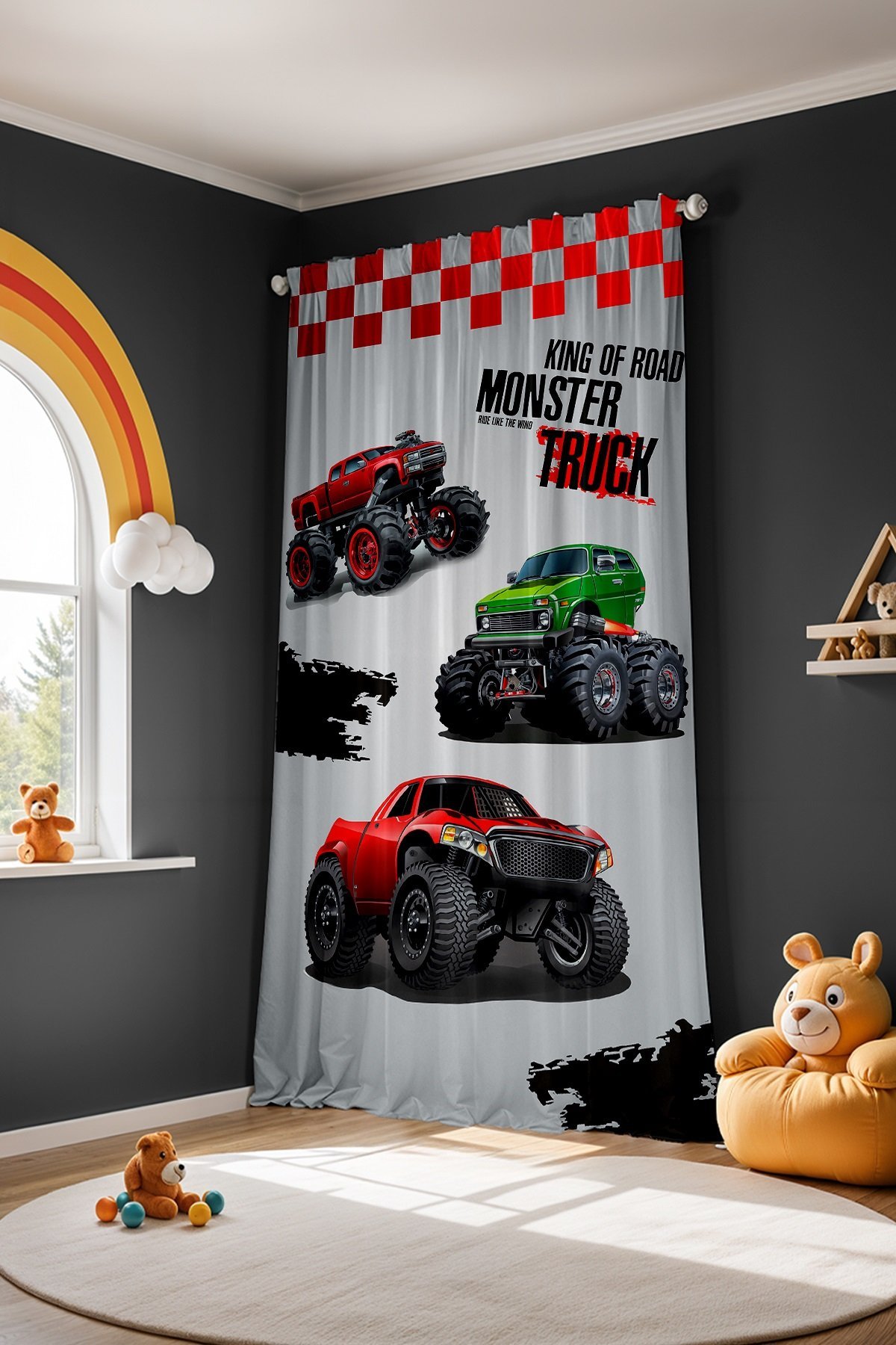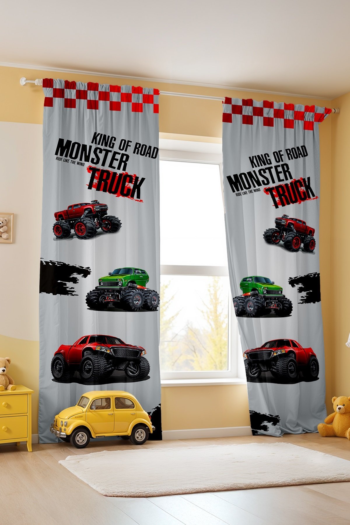 Kırmızı Monster Desenli Çocuk Bebek Odası Fon Perde (Tek Kanat Fiyatlandırma)