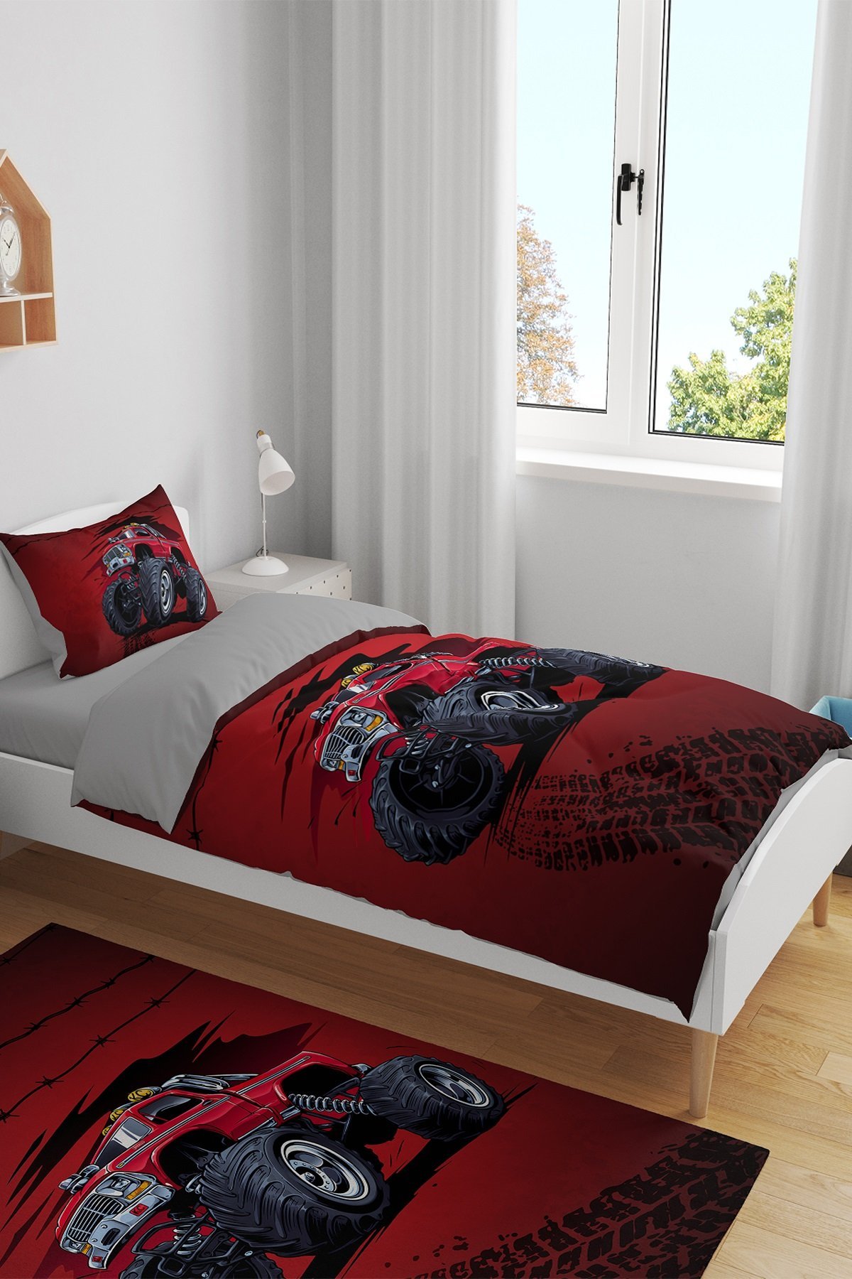 Kırmızı Monster Truck Desenli Tek Kişilik Bebek Çocuk Nevresim Seti